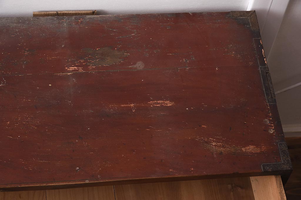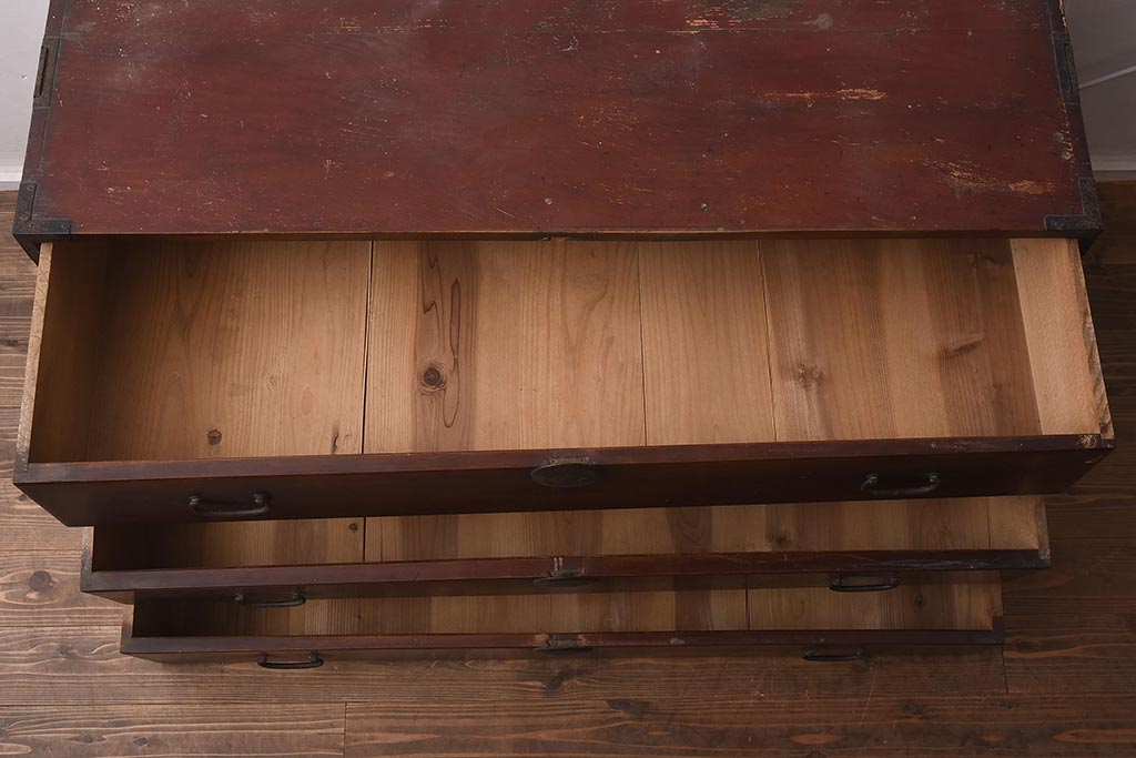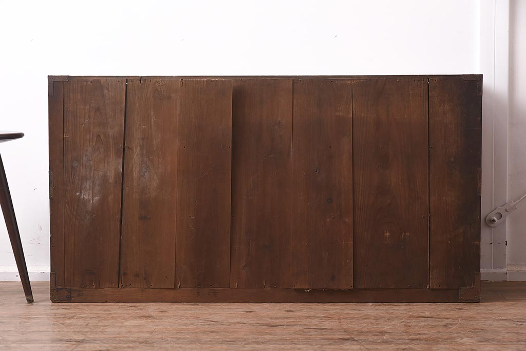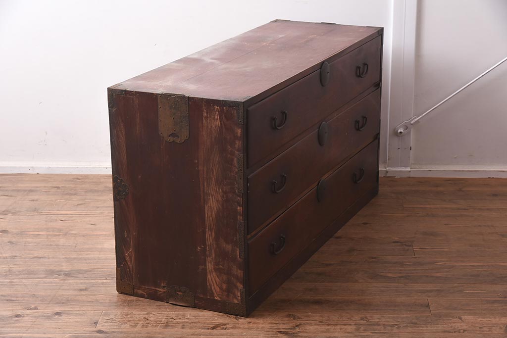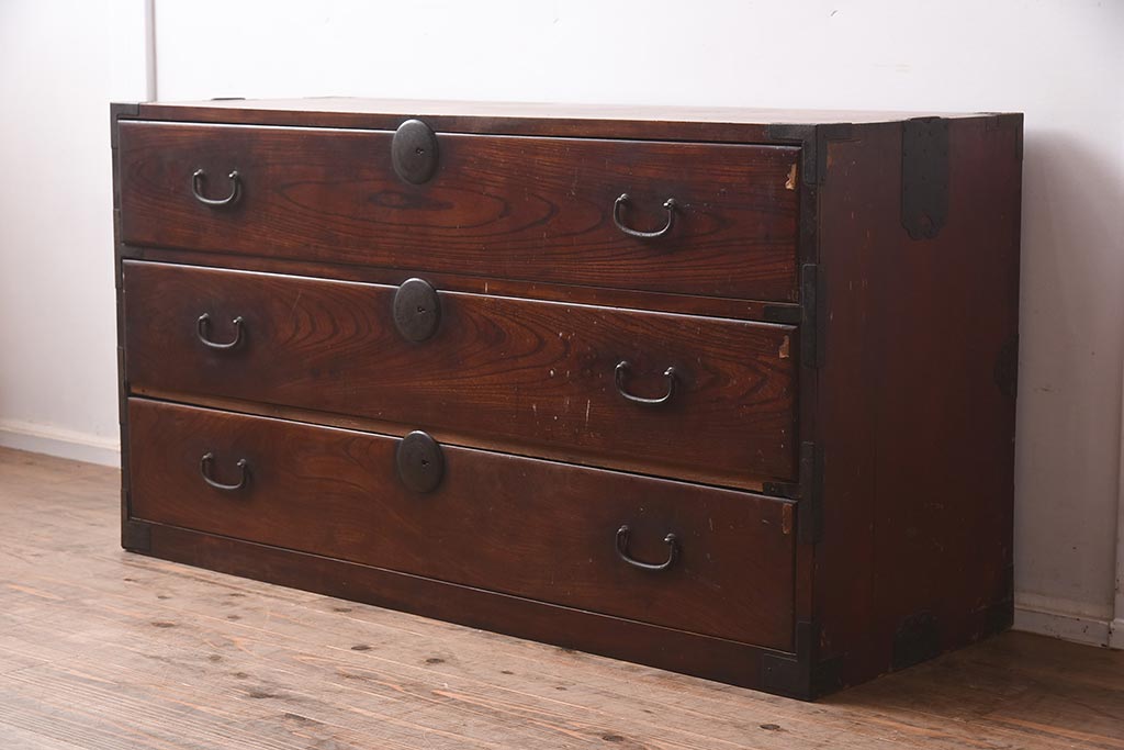 アンティーク家具 昭和初期 前面欅材・共縁 丸金具 漆塗りが上品な箪笥ローボード(チェスト、衣装箪笥、引き出し)(R-042538)