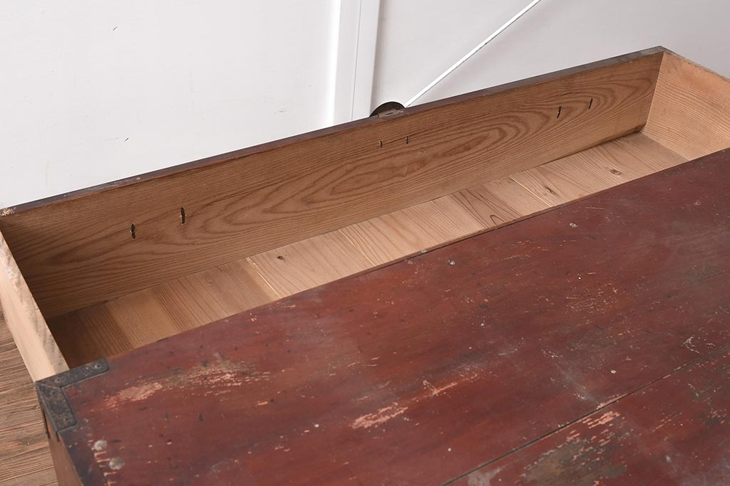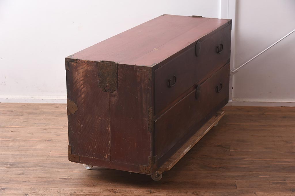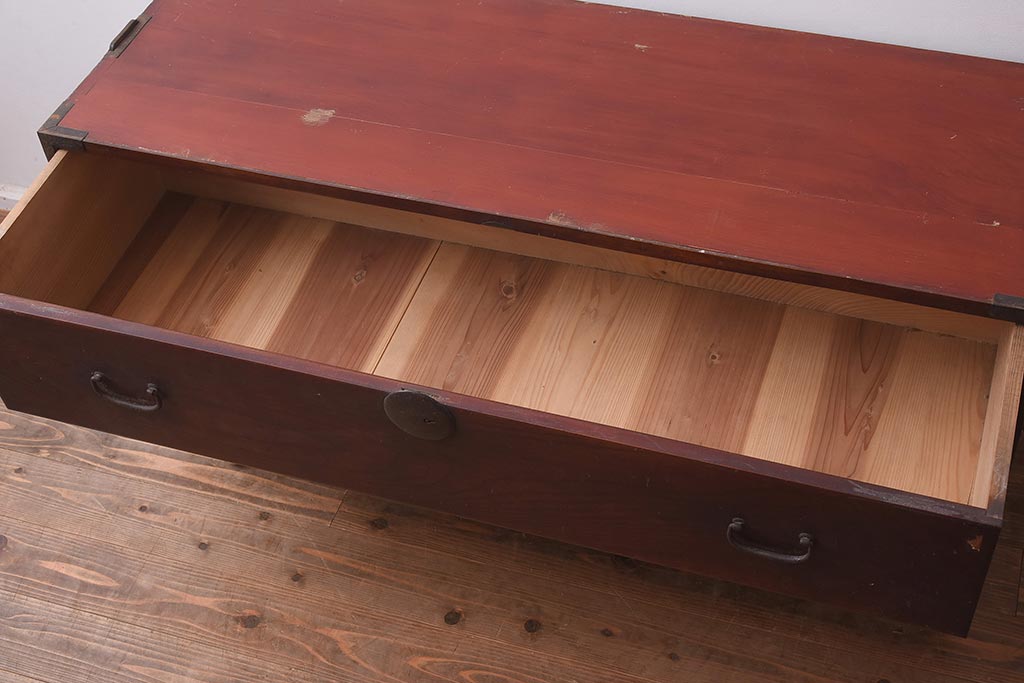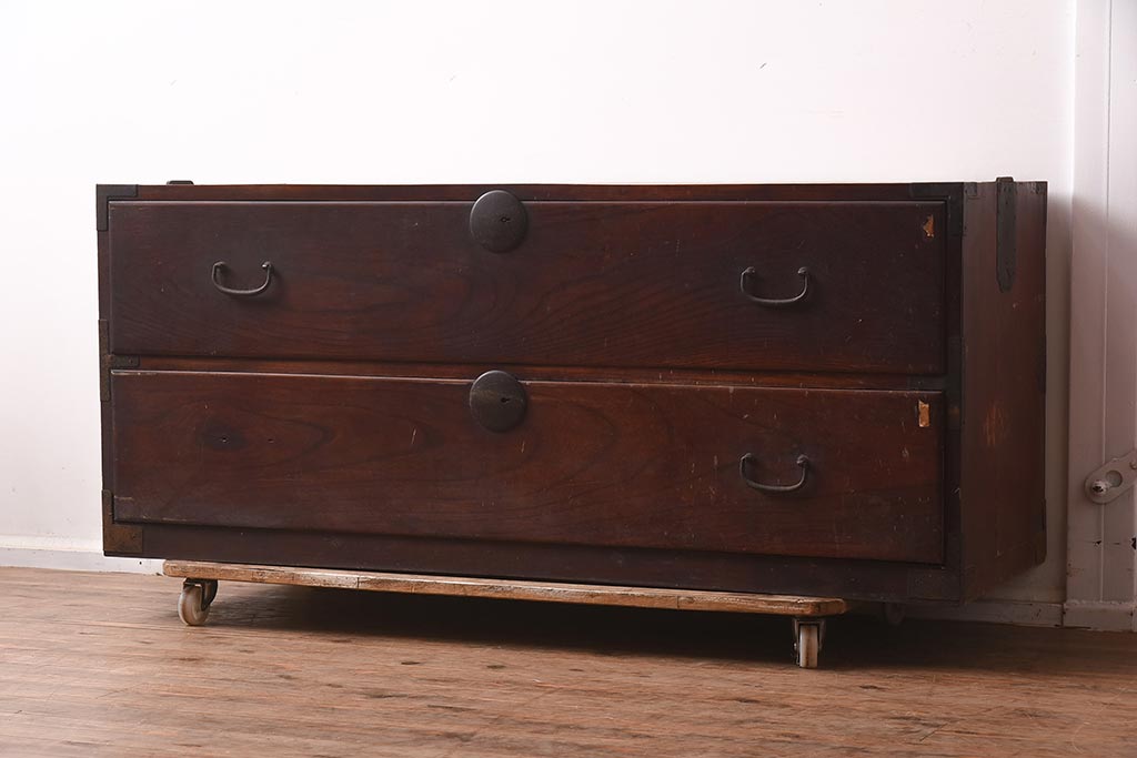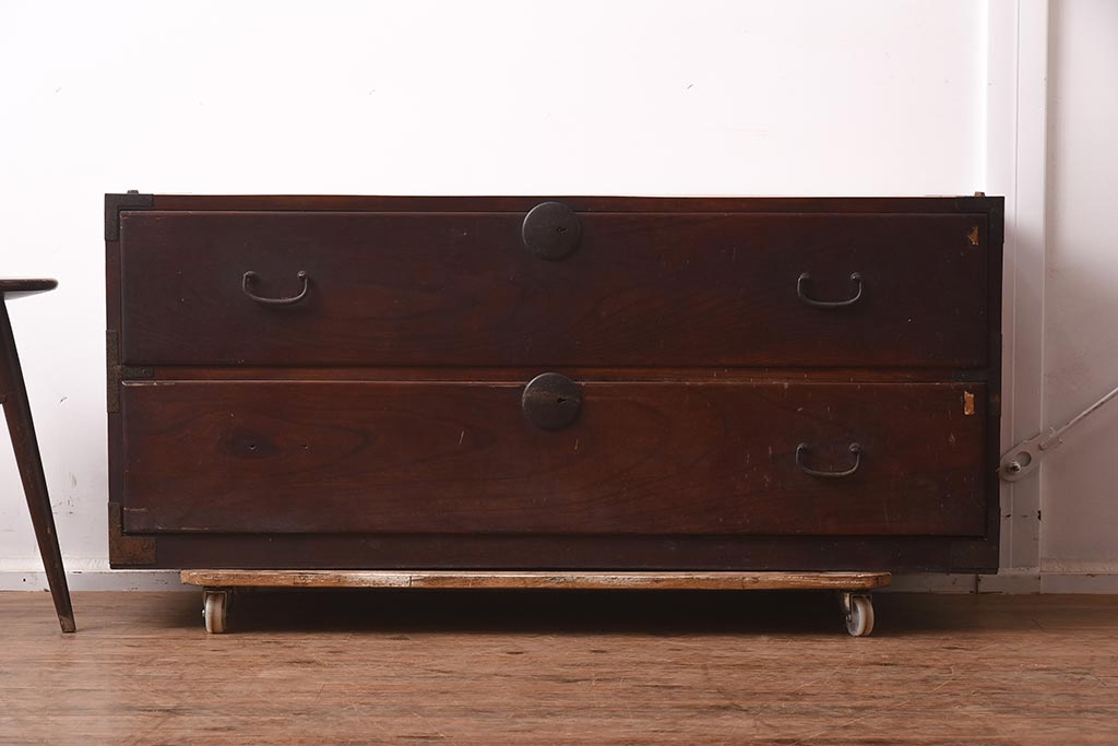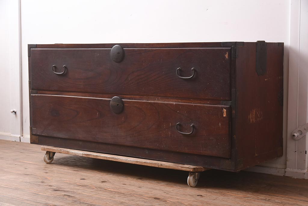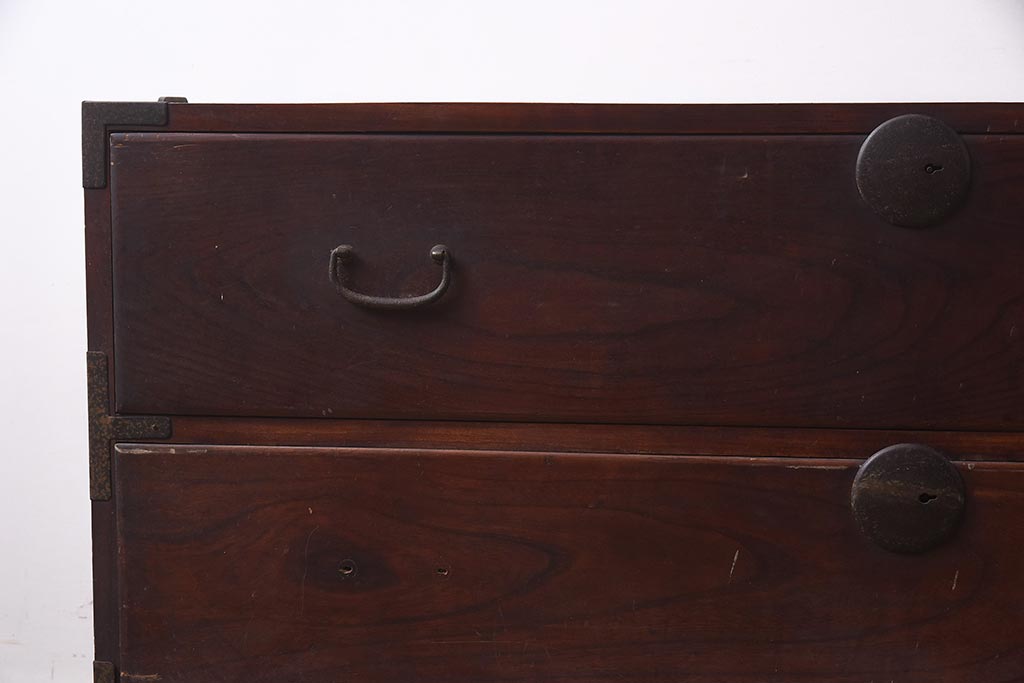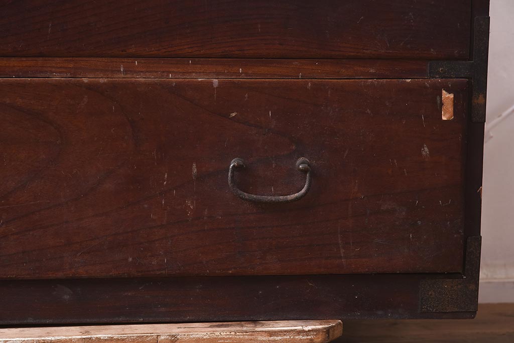 アンティーク家具 昭和初期 前面欅材・共縁 丸金具 漆塗りが上品な箪笥ローボード(チェスト、衣装箪笥、引き出し)(R-042539)