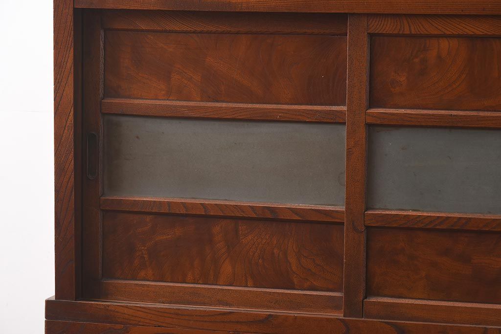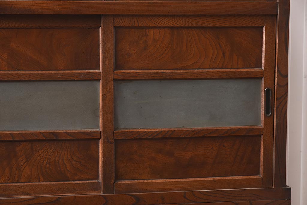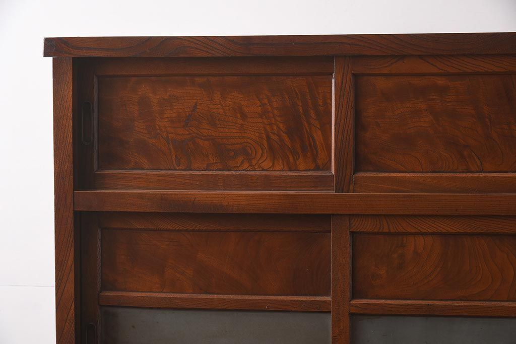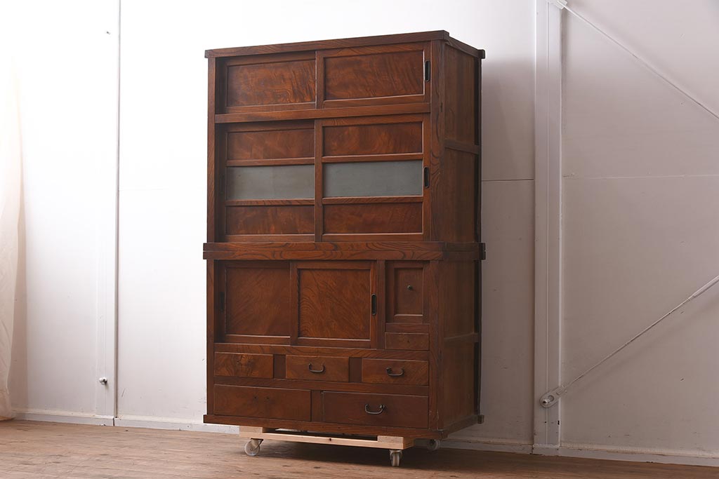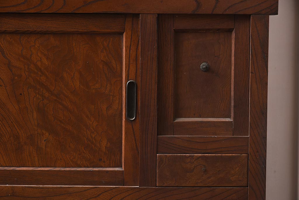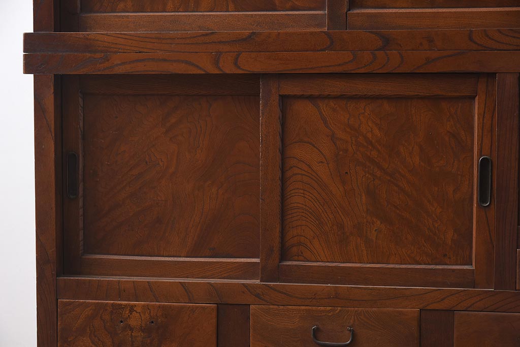 アンティーク家具 和製アンティーク 前面欅材 杢目が魅力的な重ね戸棚(関東水屋箪笥、収納棚、キャビネット)(R-042583)です。