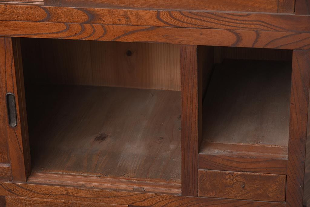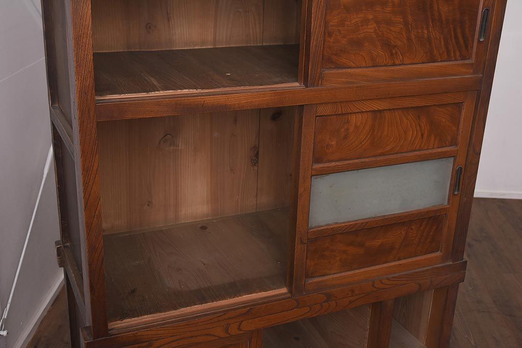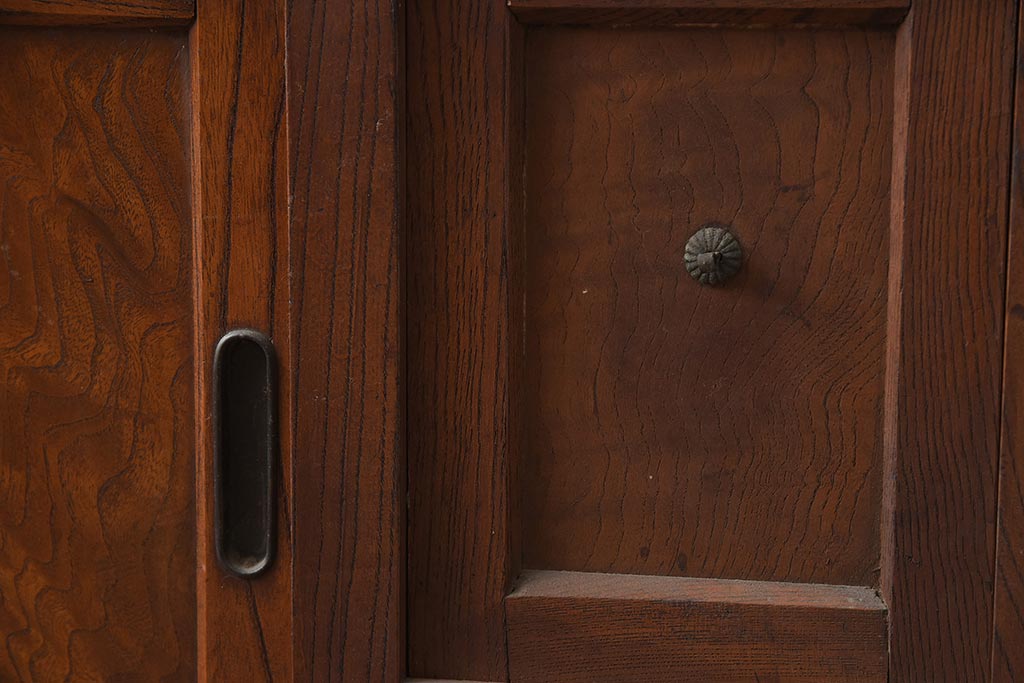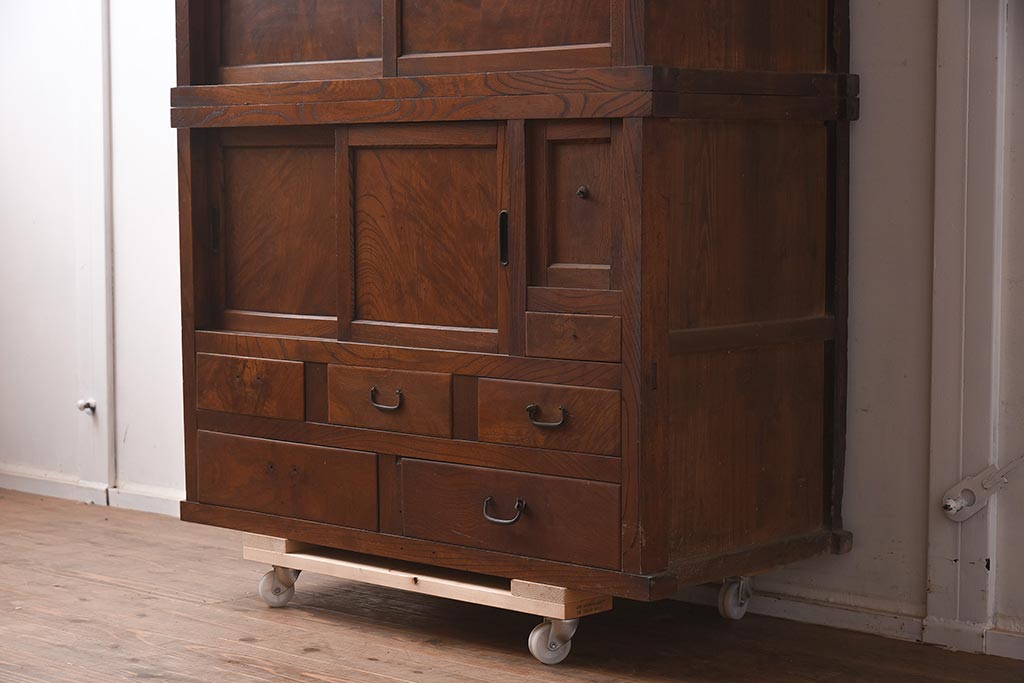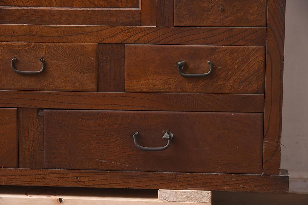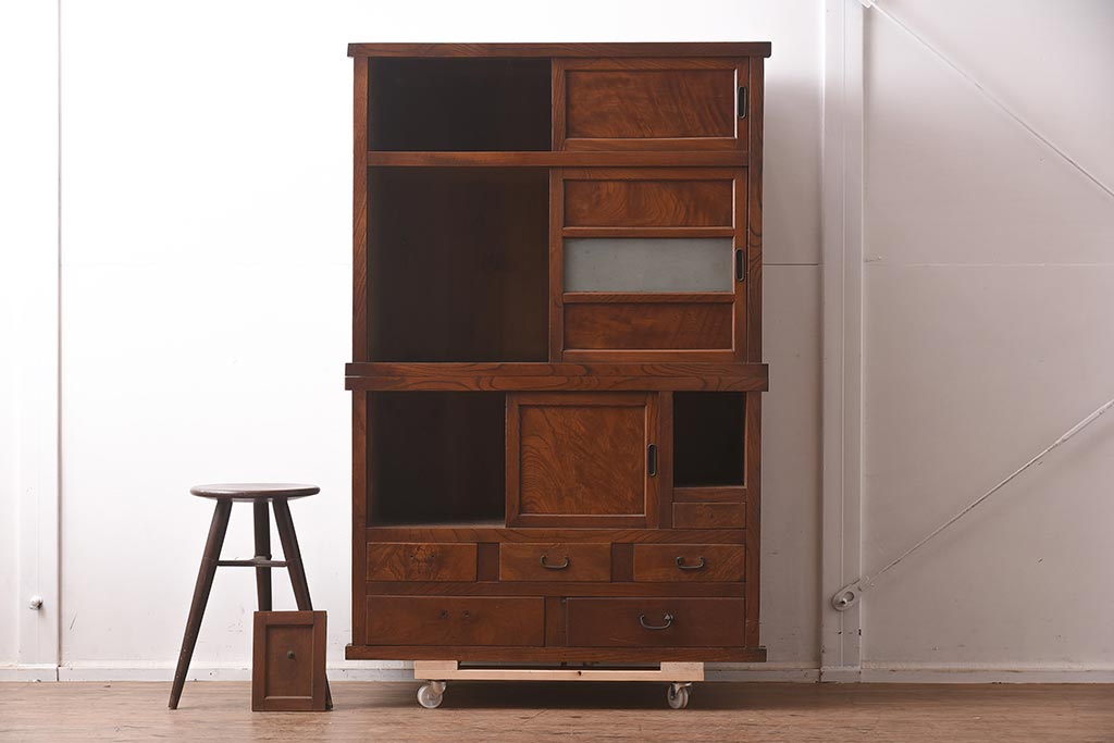 アンティーク家具 和製アンティーク 前面欅材 杢目が魅力的な重ね戸棚(関東水屋箪笥、収納棚、キャビネット)(R-042583)です。