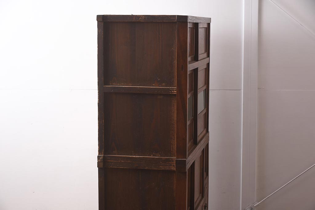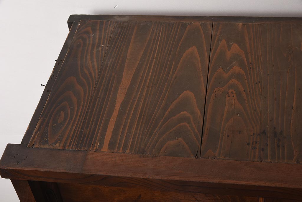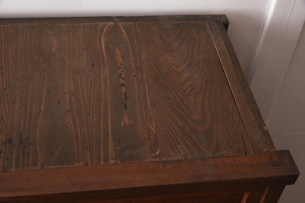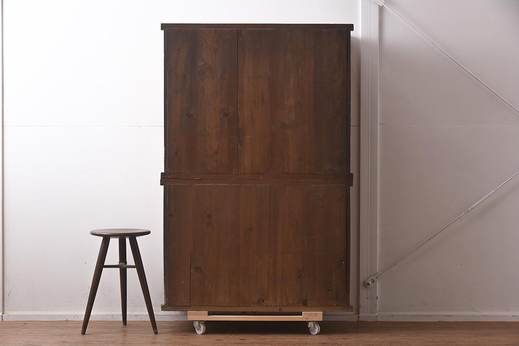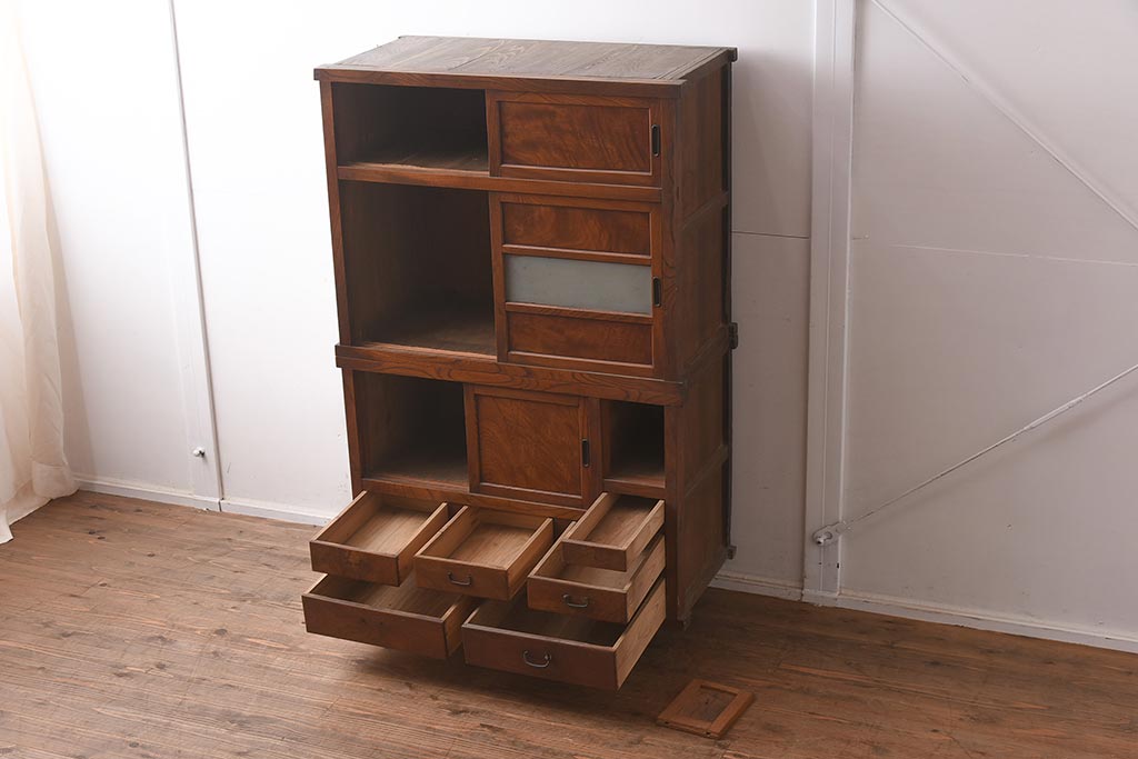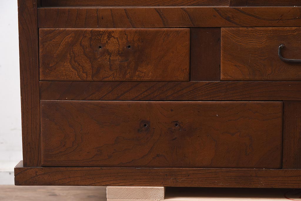 アンティーク家具 和製アンティーク 前面欅材 杢目が魅力的な重ね戸棚(関東水屋箪笥、収納棚、キャビネット)(R-042583)です。