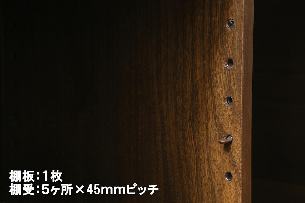 棚板は取り外しできます。棚板は1枚あります。棚受けは5ヶ所、45mmピッチで調整できます。棚幅サイズのものが1枚の作りです。