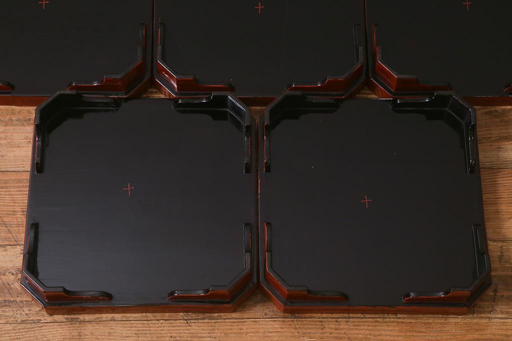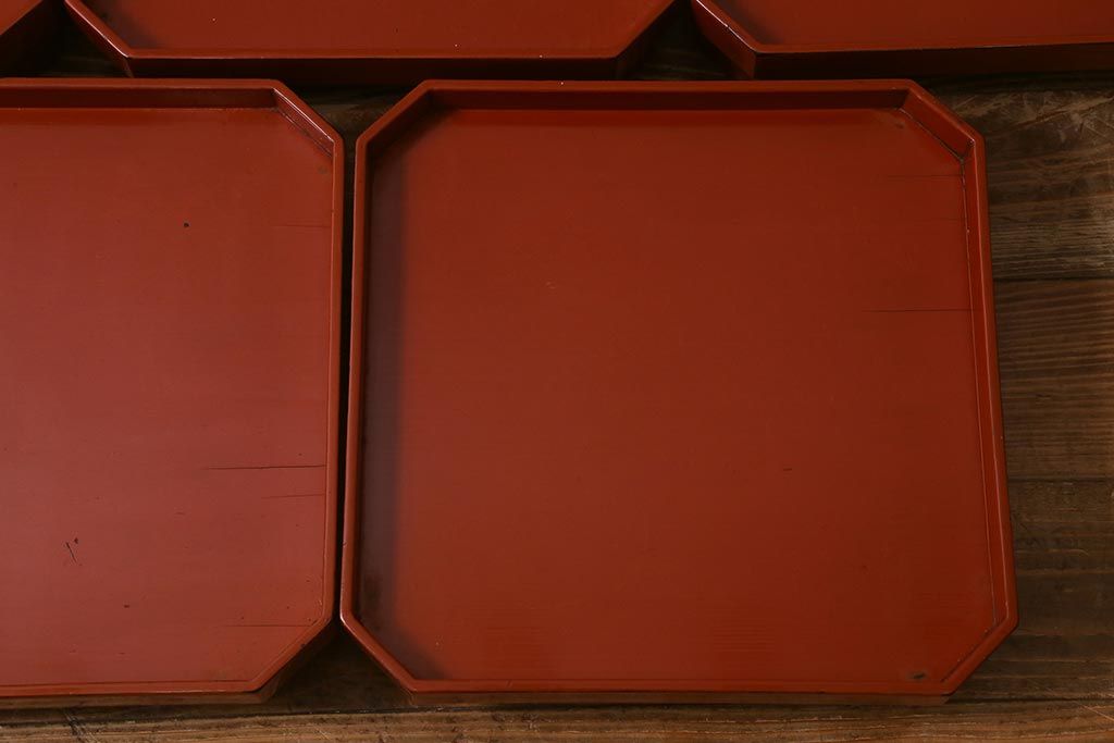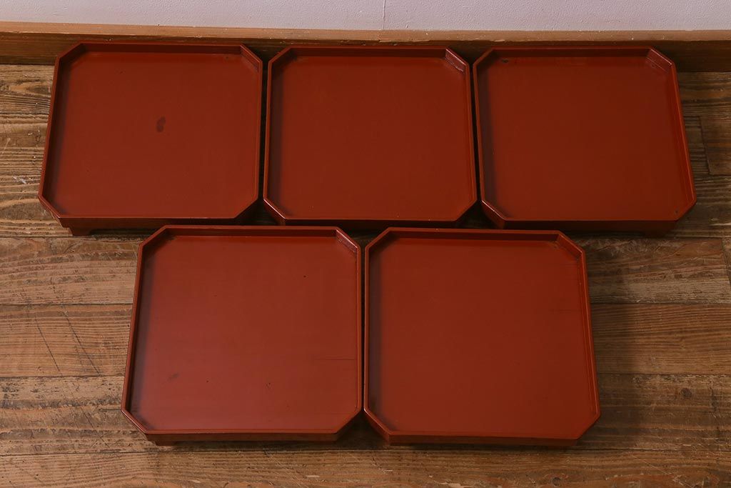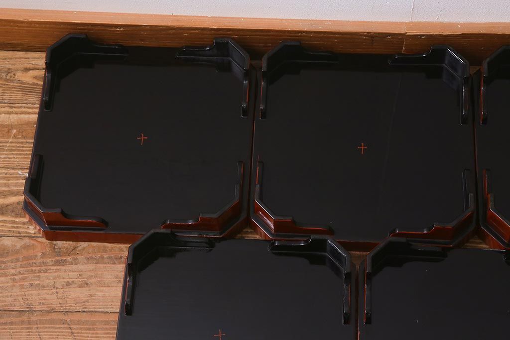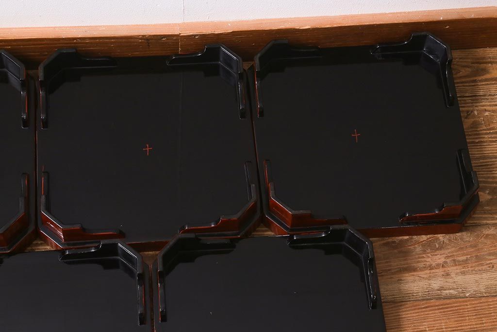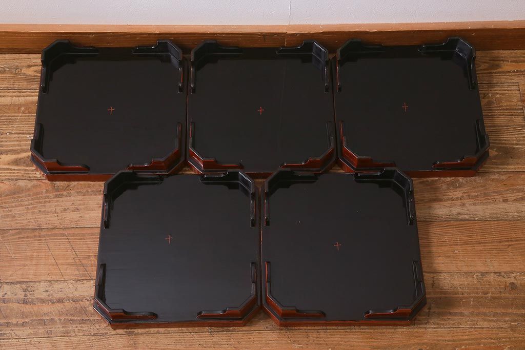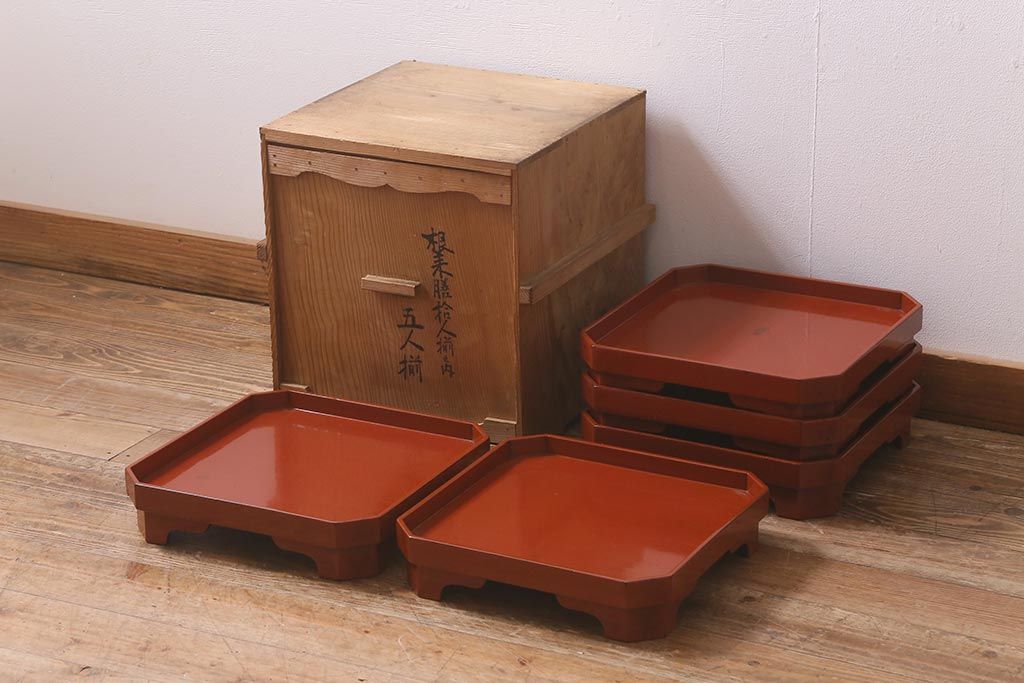 アンティーク雑貨 明治期 共箱 根来塗お膳5客セット(木製漆器、和食器)(R-042191)