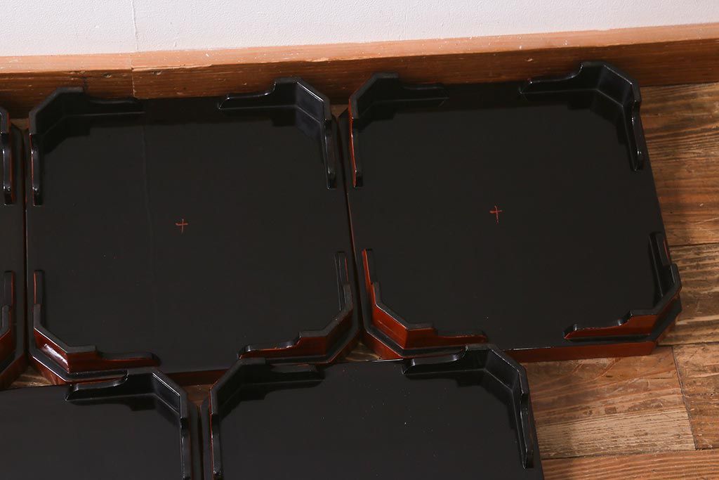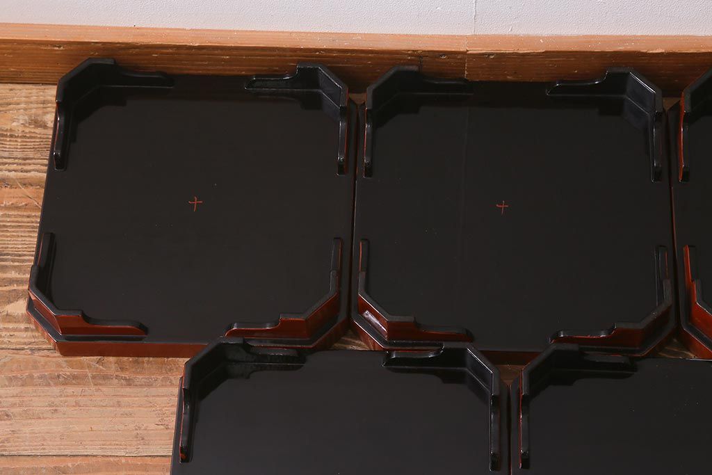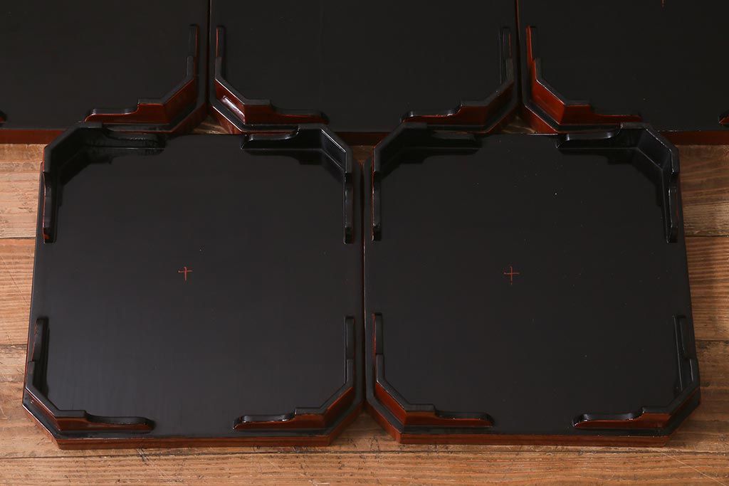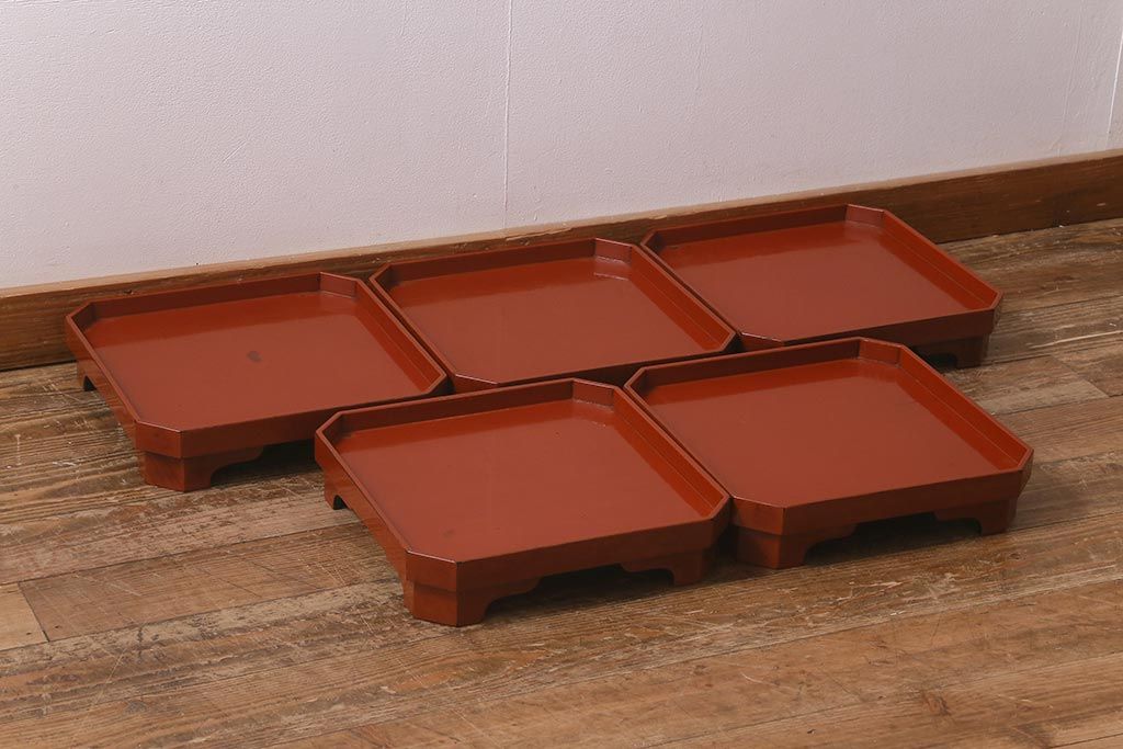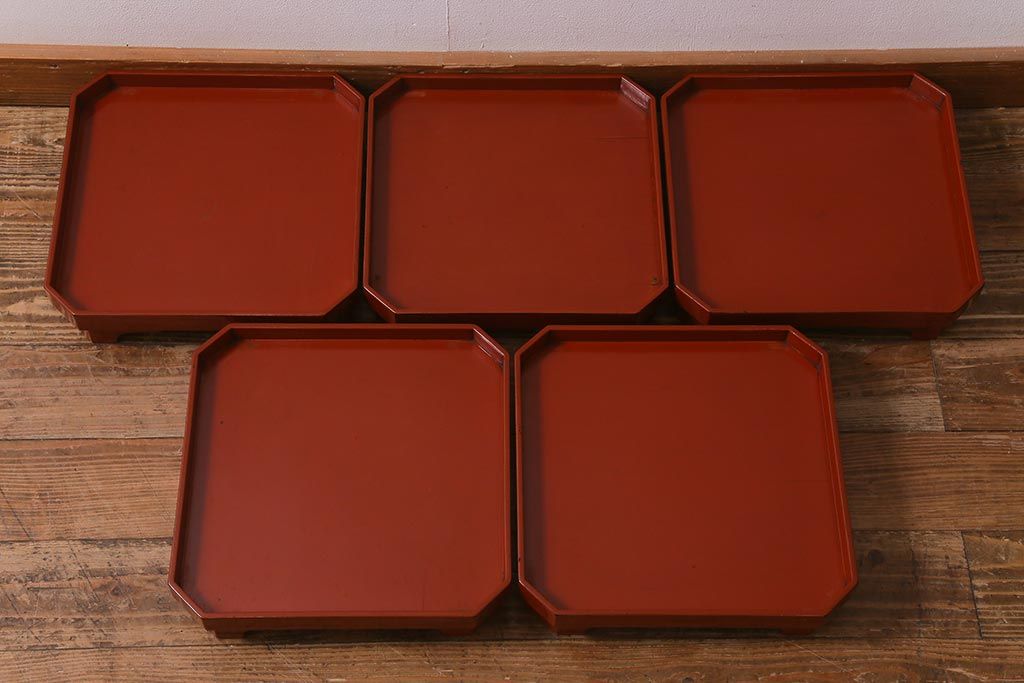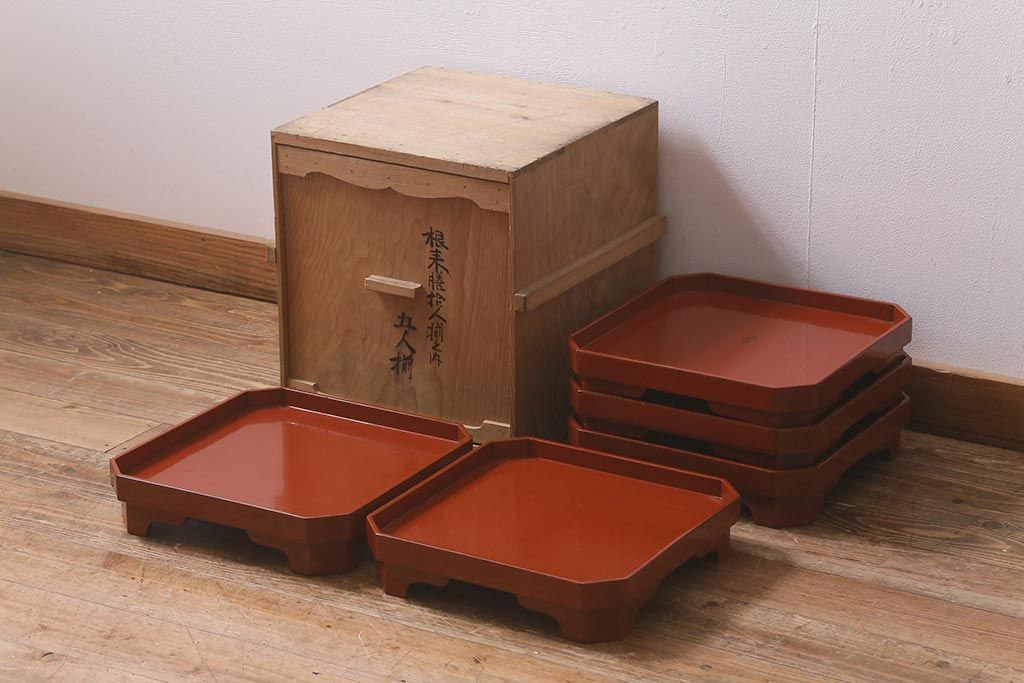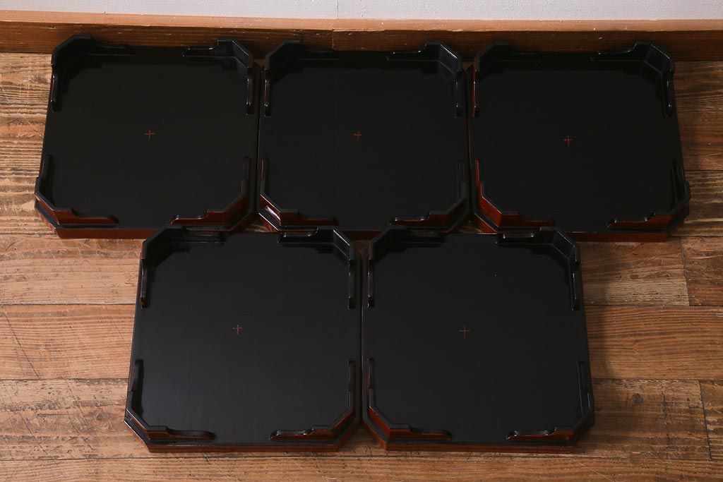 アンティーク雑貨 明治期 共箱 根来塗お膳5客セット(木製漆器、和食器)(R-042192)