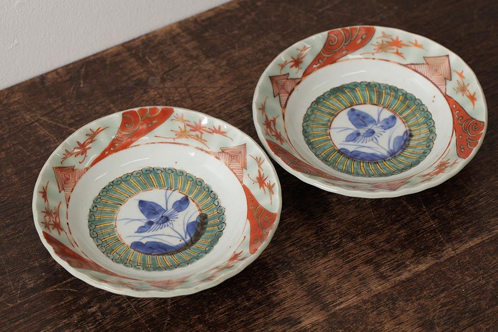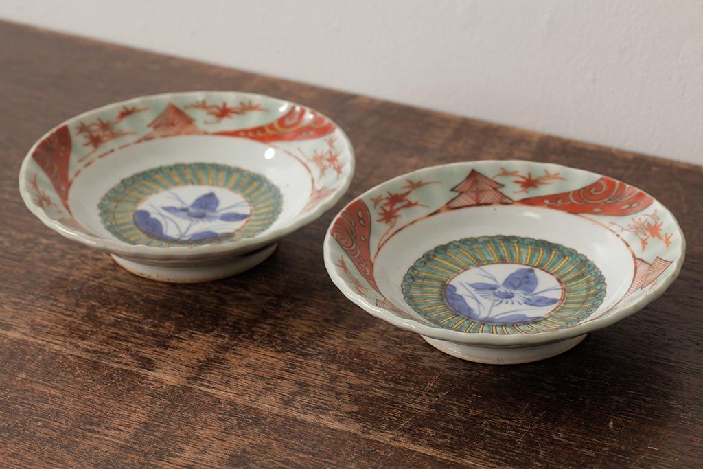 ラフジュ工房> 骨董・美術品> 骨董-陶磁器 > 江戸期 古伊万里 色絵染付小皿2枚セット(小鉢、和食器)(R-042315)