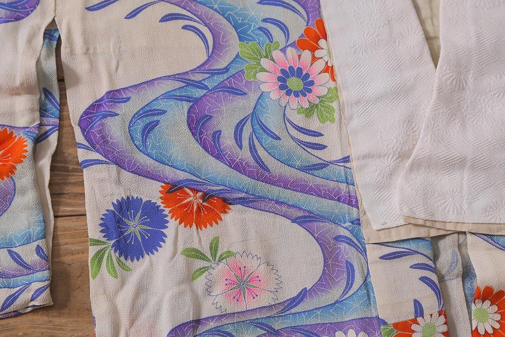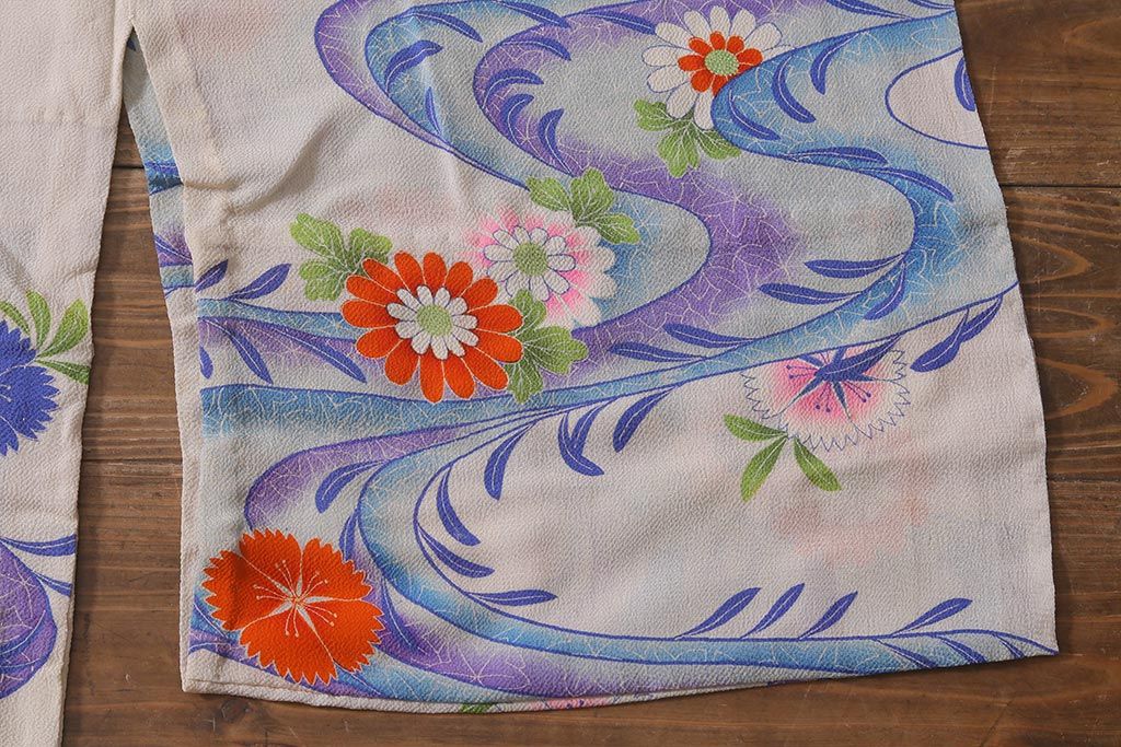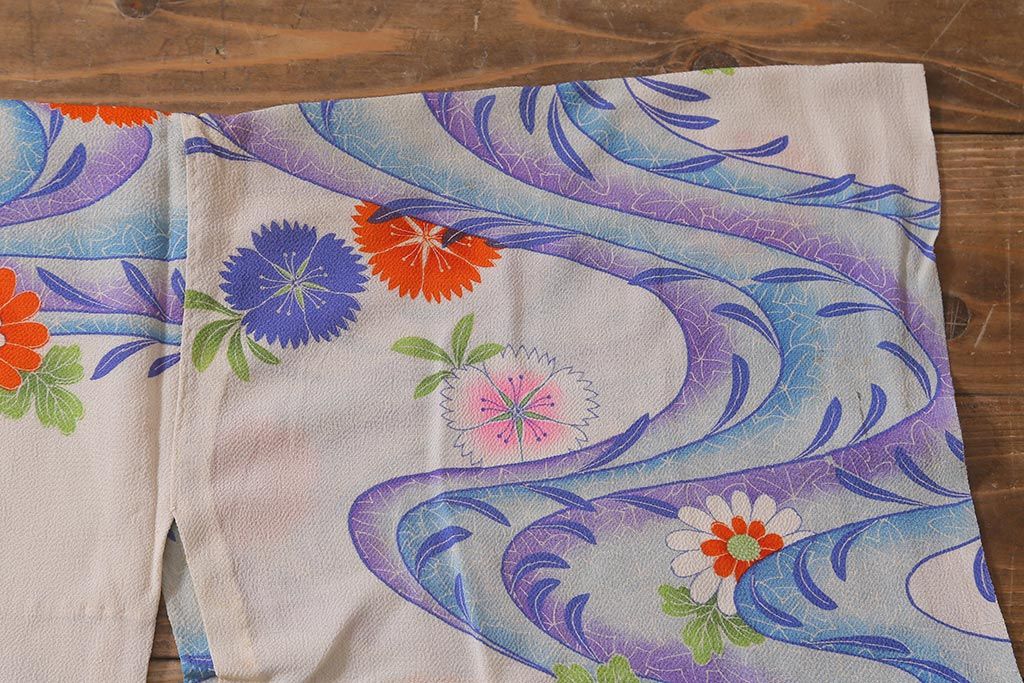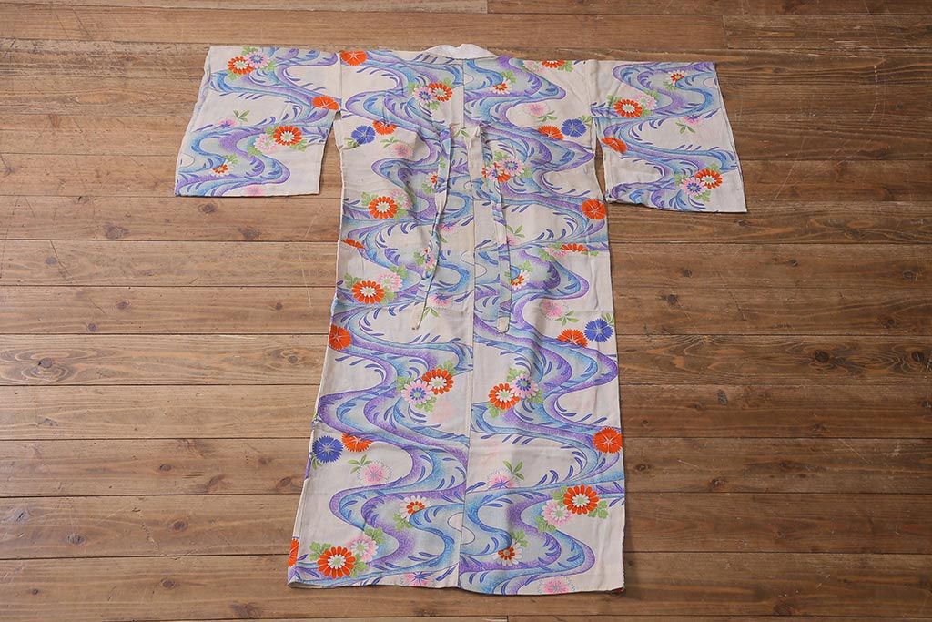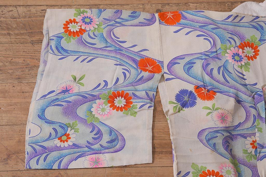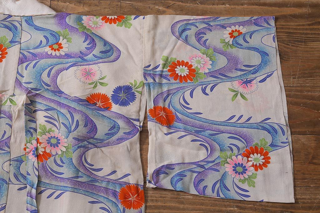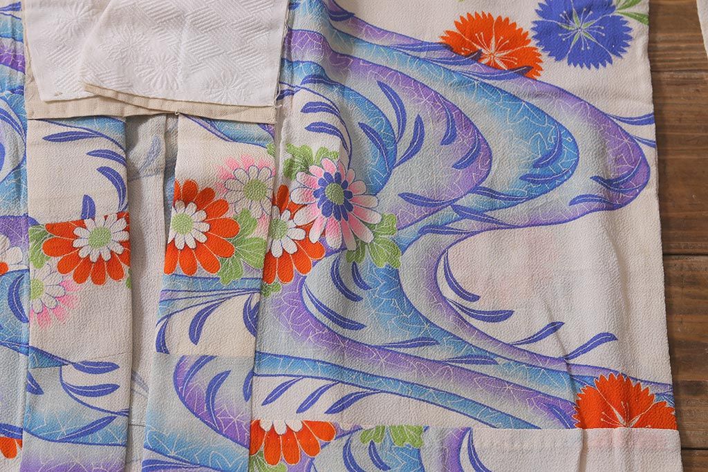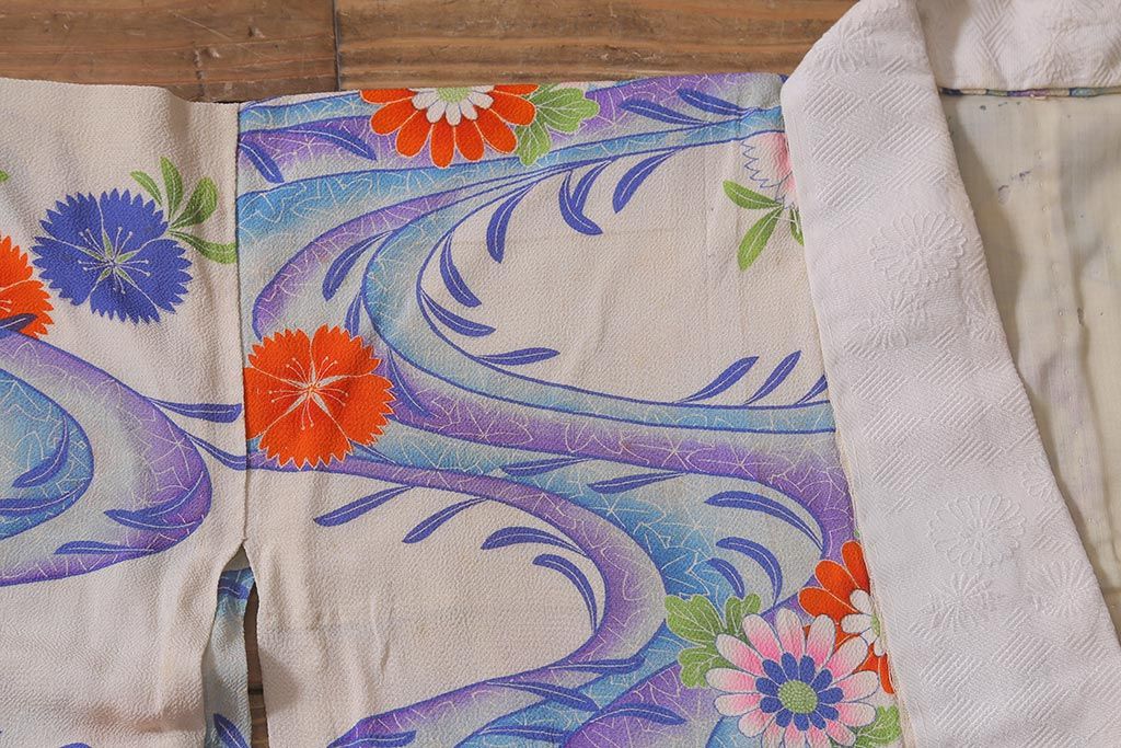 アンティーク着物 大正昭和初期 川に花模様 縮緬襦袢(ちりめん、古布正絹)(R-042195)