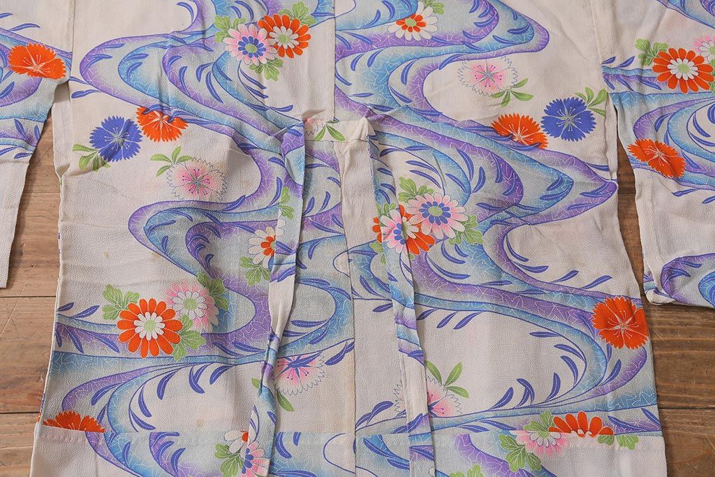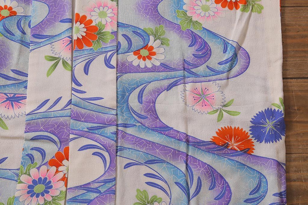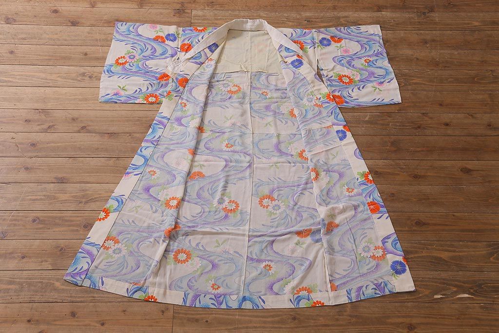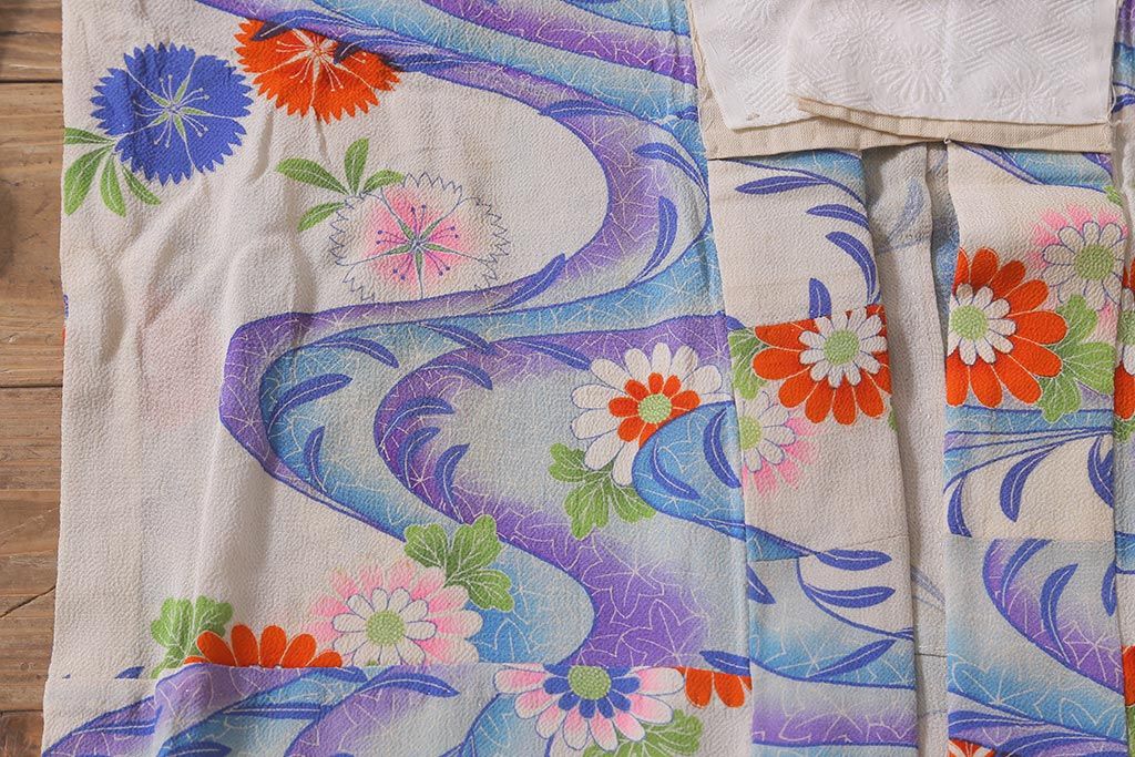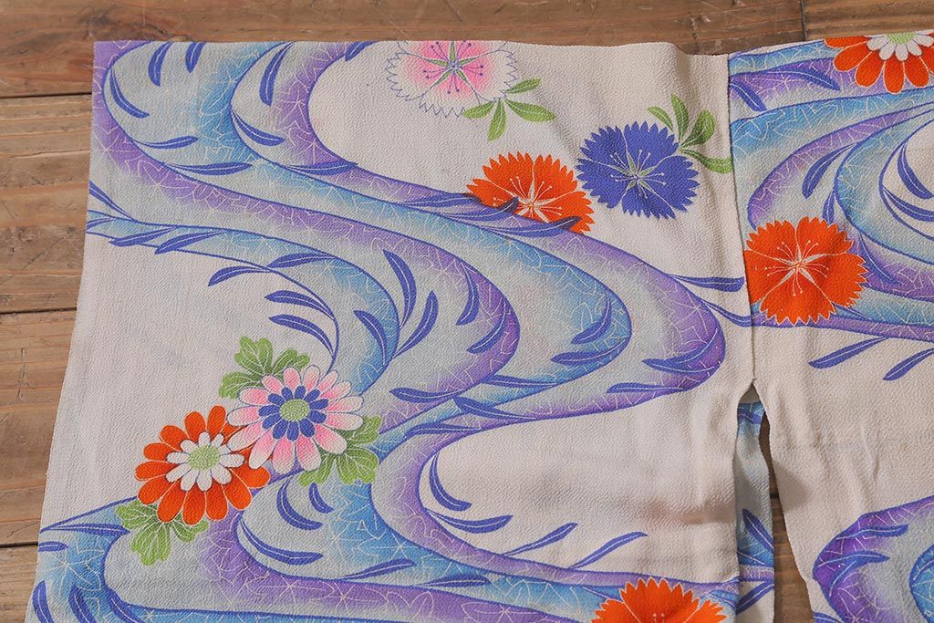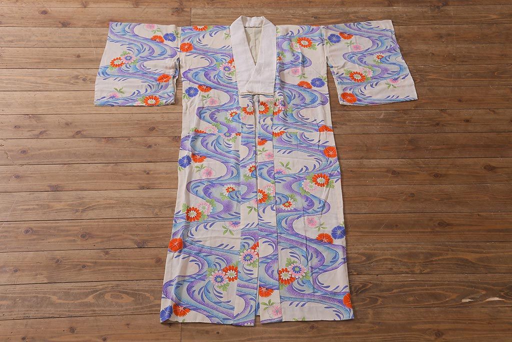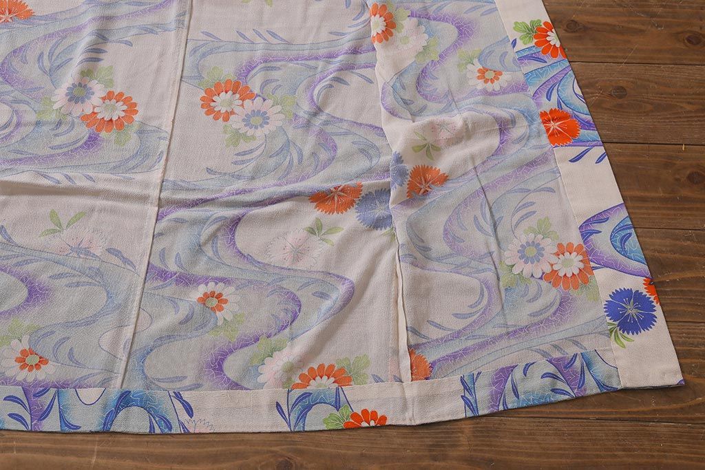 アンティーク着物 大正昭和初期 川に花模様 縮緬襦袢(ちりめん、古布正絹)(R-042195)