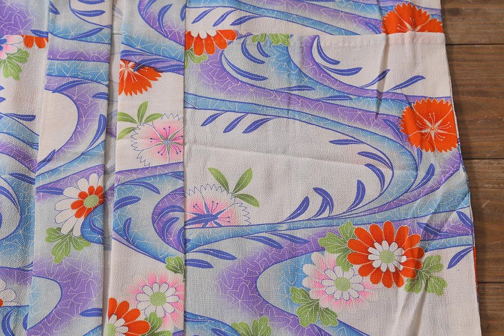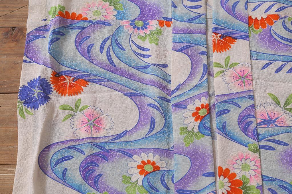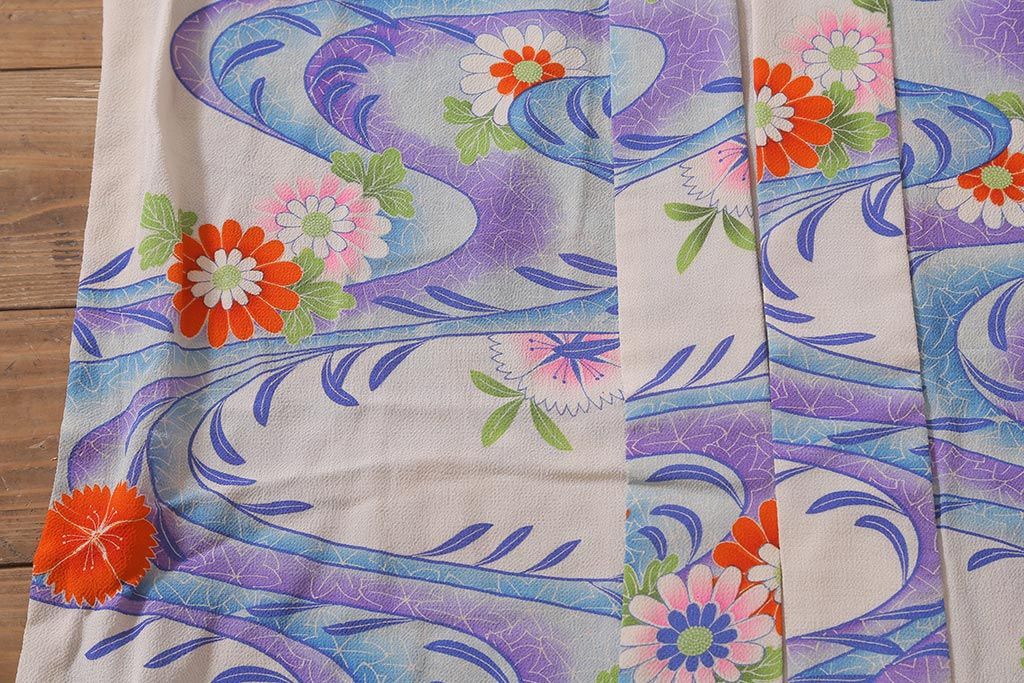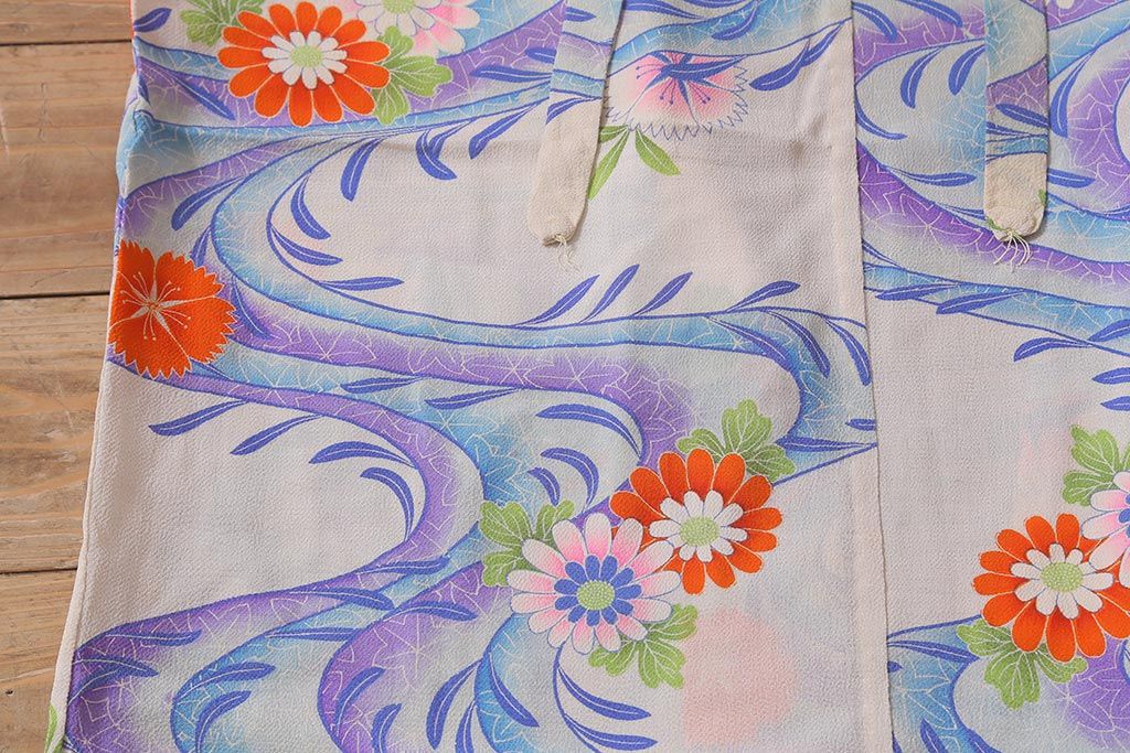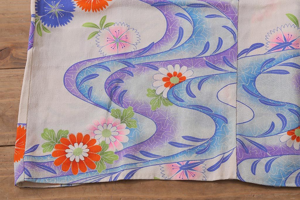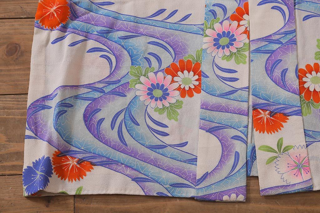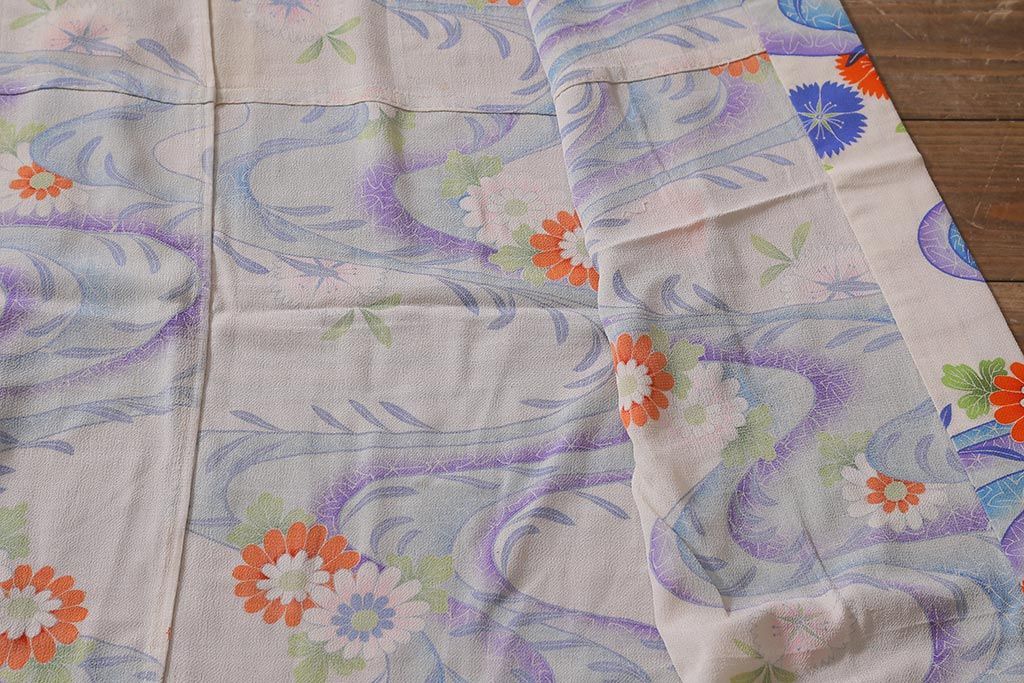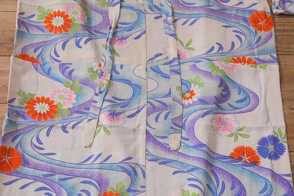アンティーク着物 大正昭和初期 川に花模様 縮緬襦袢(ちりめん、古布正絹)(R-042195)