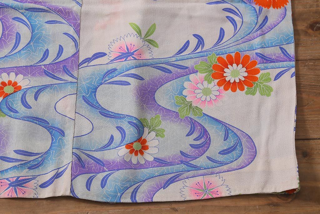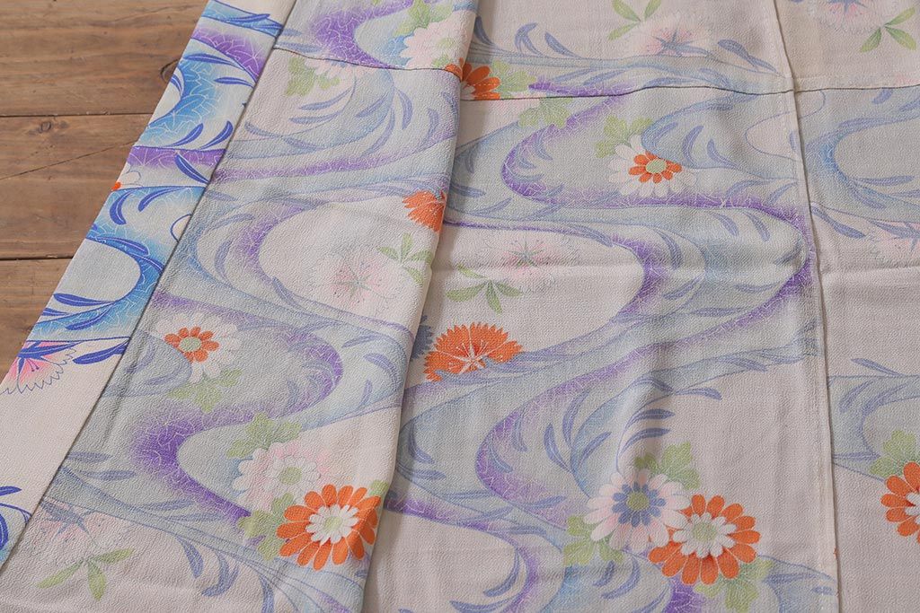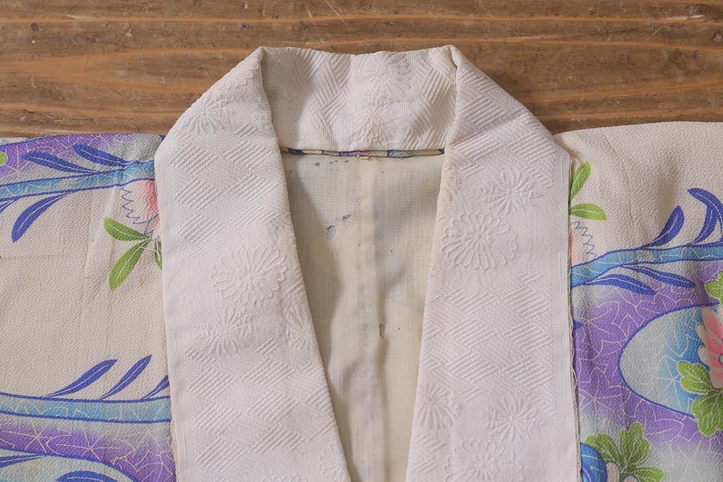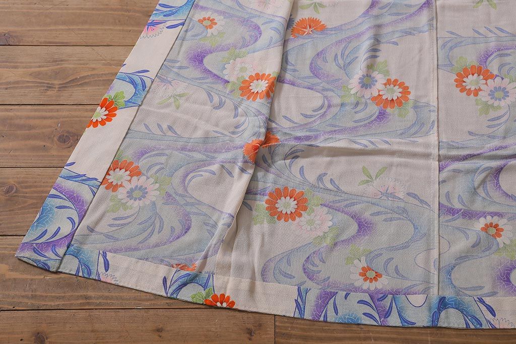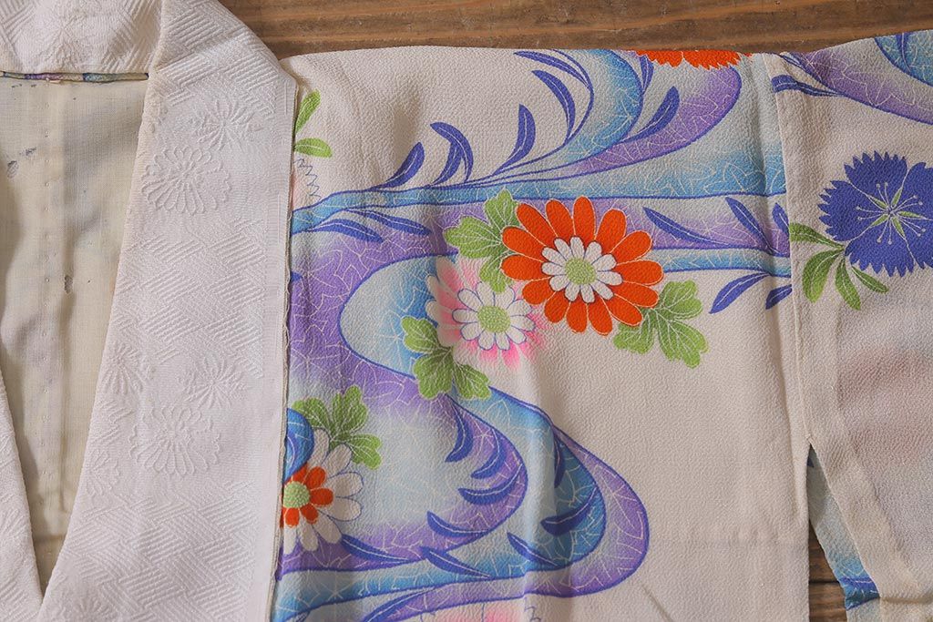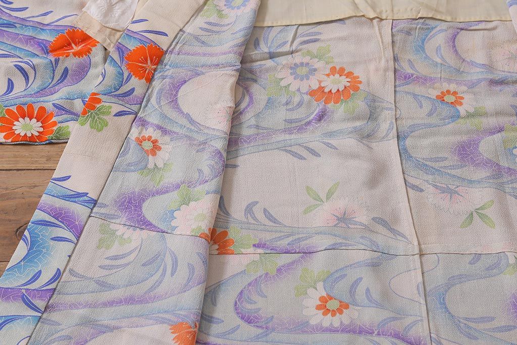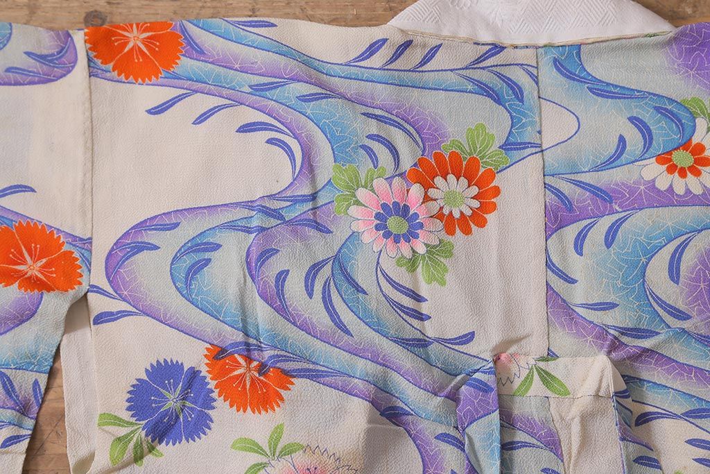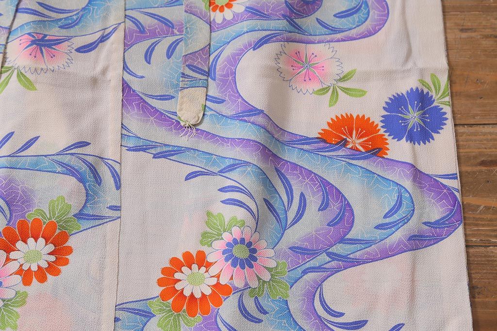 アンティーク着物 大正昭和初期 川に花模様 縮緬襦袢(ちりめん、古布正絹)(R-042195)