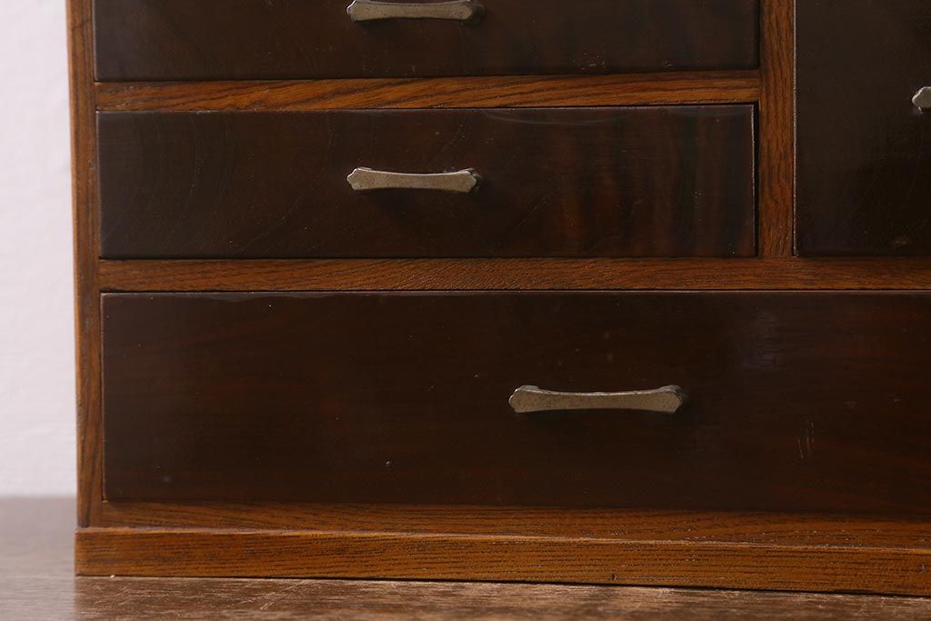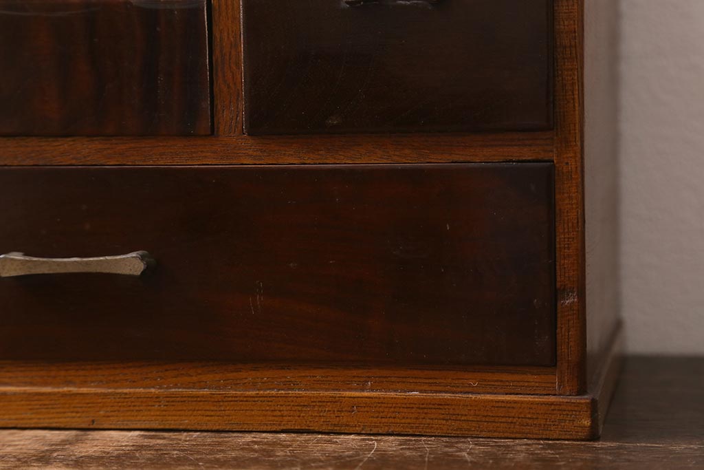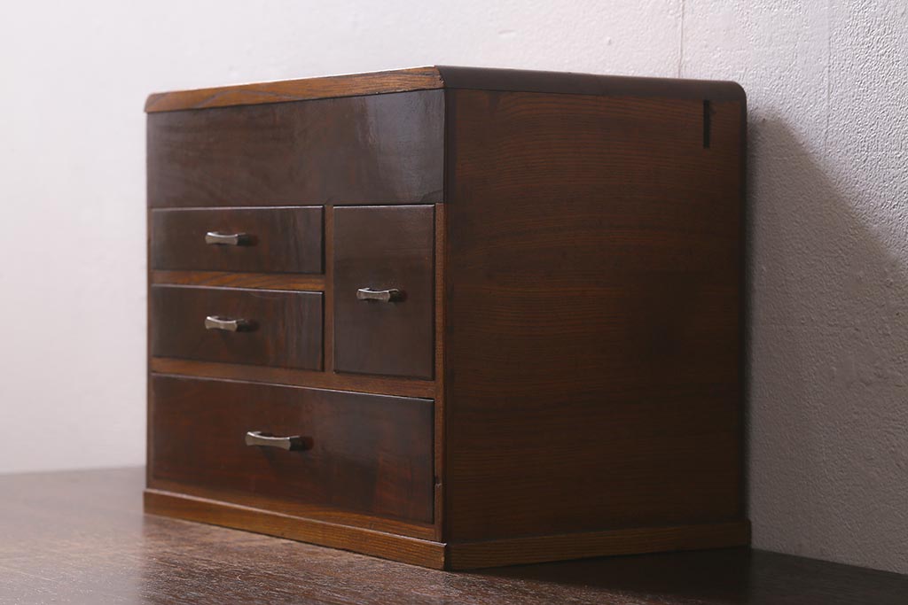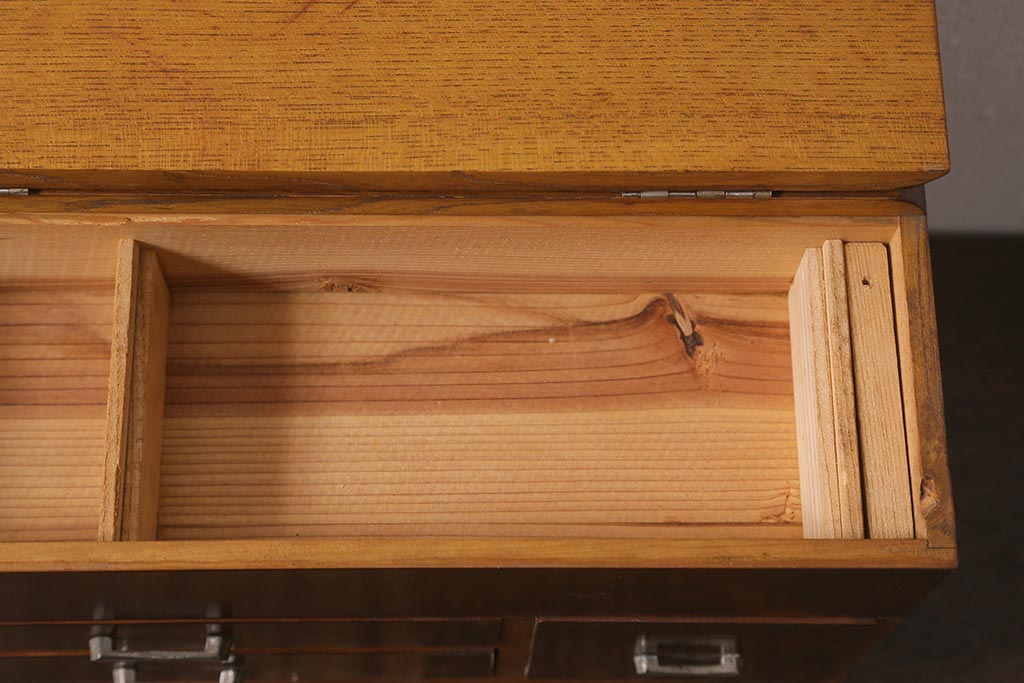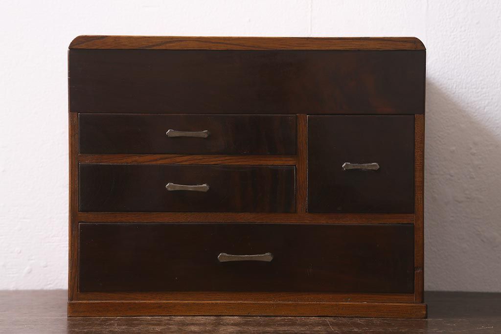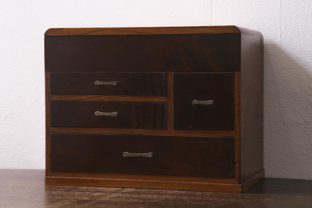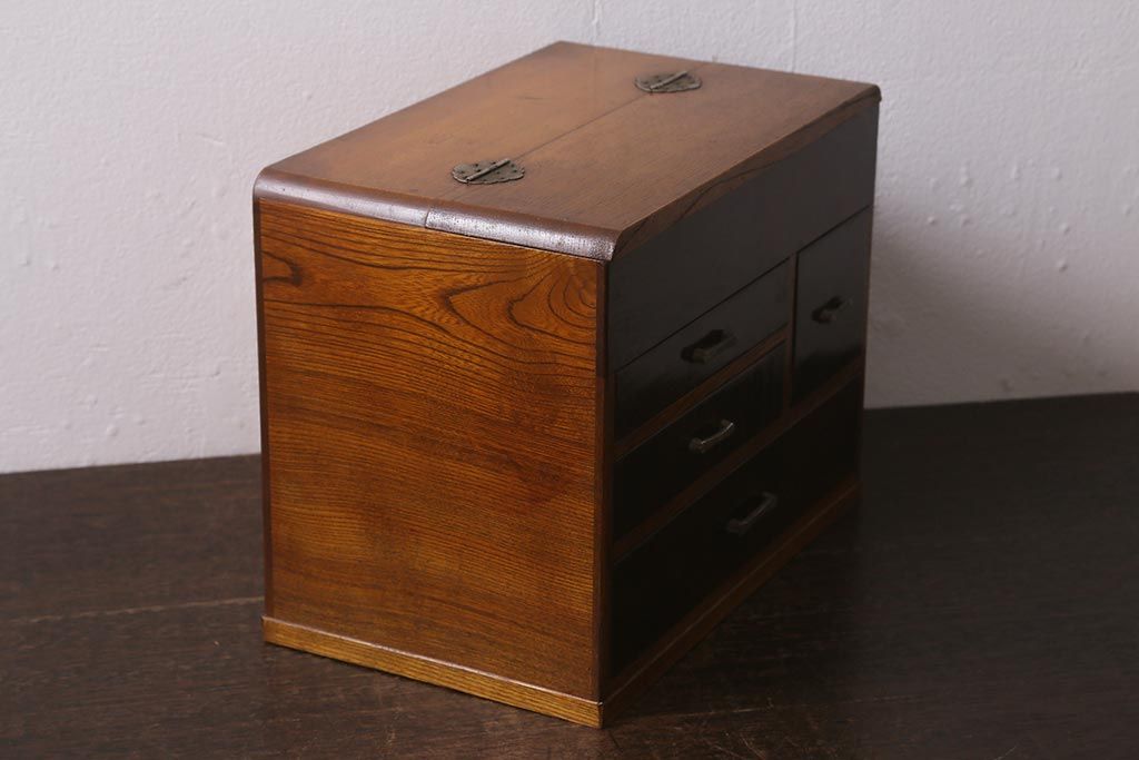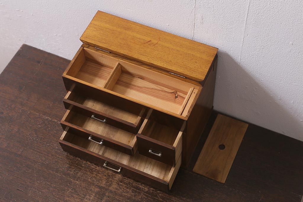小物収納・トランク > アンティーク雑貨 和製アンティーク 前面桑材 昭和中期 バイカラーがお洒落な上蓋式裁縫箱(ソーイングボックス、針箱、小引き出し、小物収納)(R-042559)