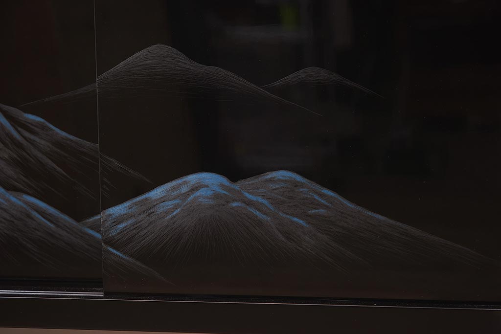 黒塗りに彫漆で山と木立が描かれており、