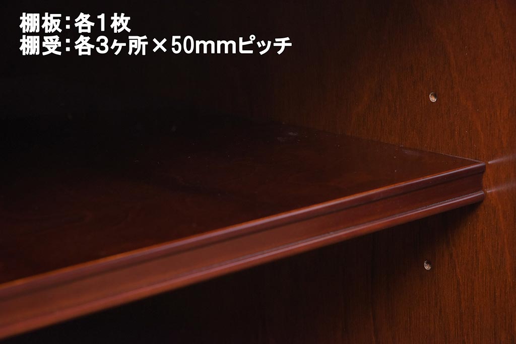 棚板は取り外しできます。棚板は各1枚あります。棚受けは各3ヶ所、50mmピッチで調整できます。棚幅サイズのものが1枚の作りです。