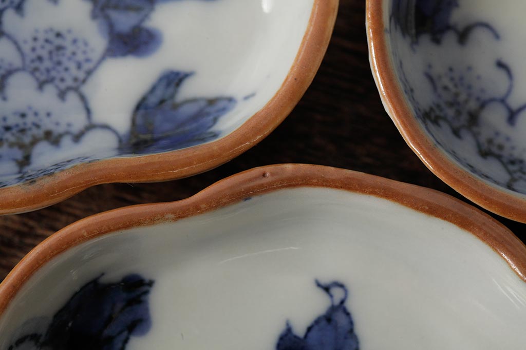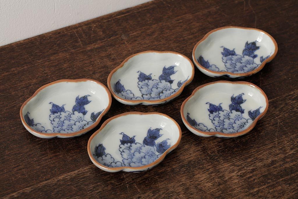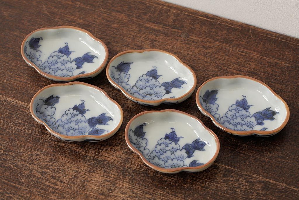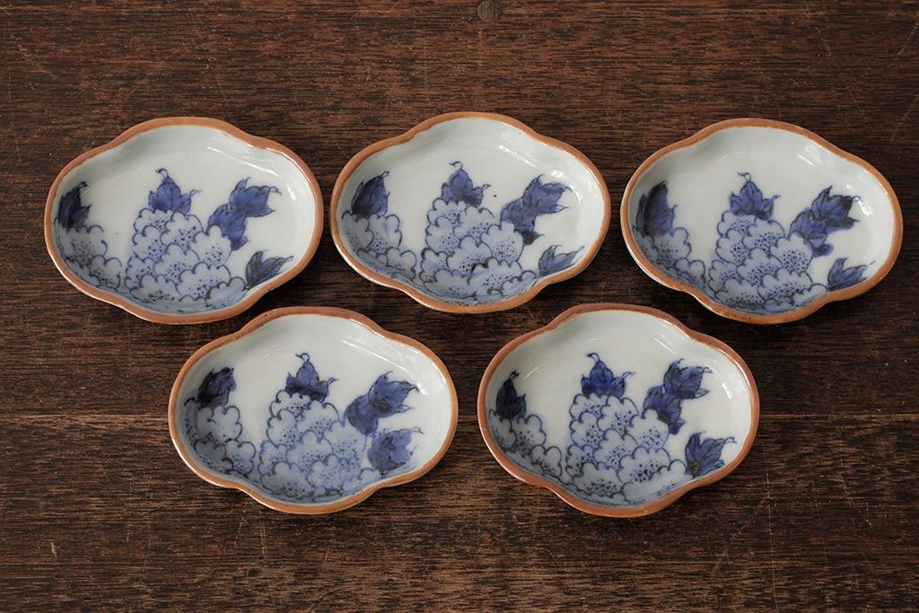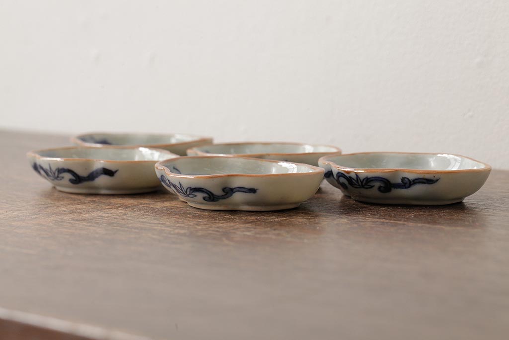 ラフジュ工房> 和食器・茶道具> 皿 > アンティーク雑貨 江戸期 古伊万里 染付花文小皿5枚セット(変形皿、和食器)(R-042474)