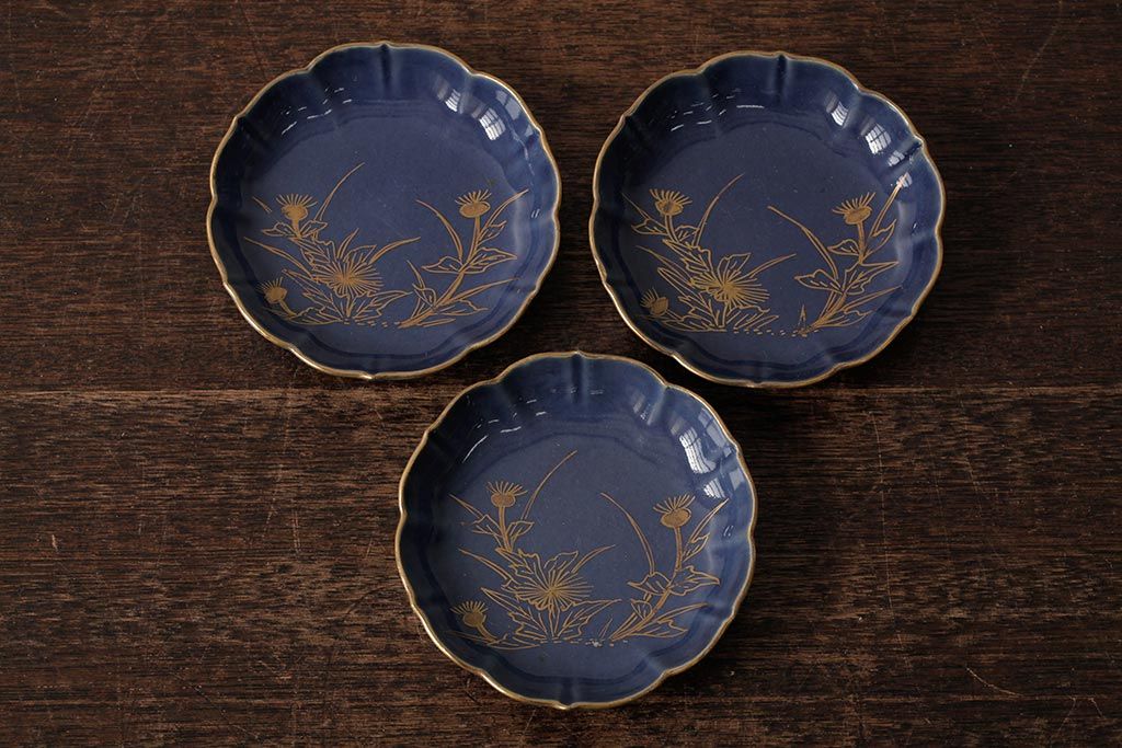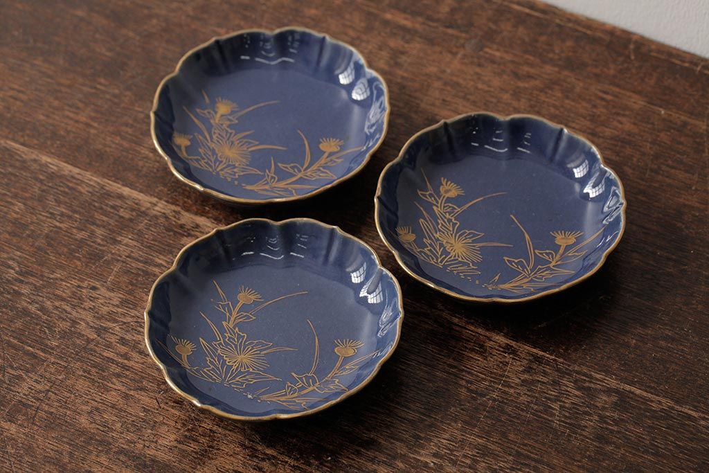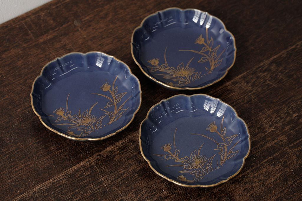 ラフジュ工房> 骨董・美術品> 骨董-陶磁器 > アンティーク雑貨 江戸期 古伊万里 瑠璃金彩花文小皿3枚セット(変形皿、和食器)(R-042529)