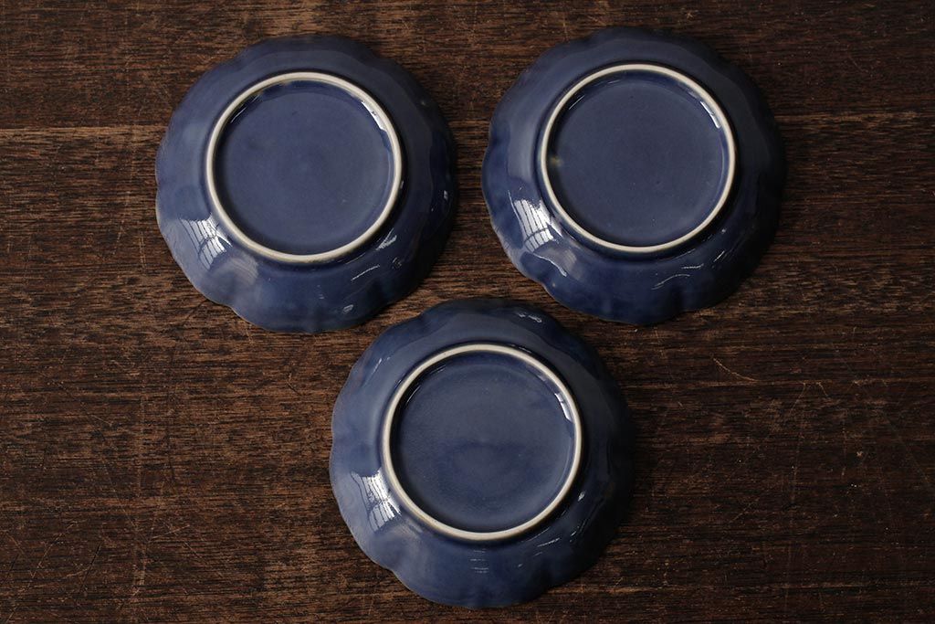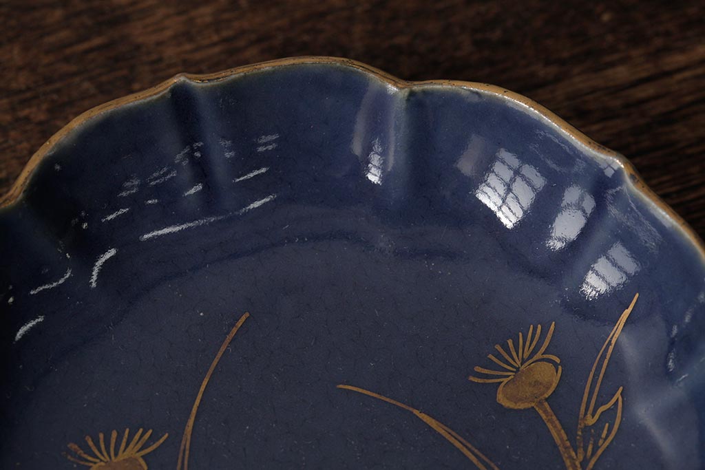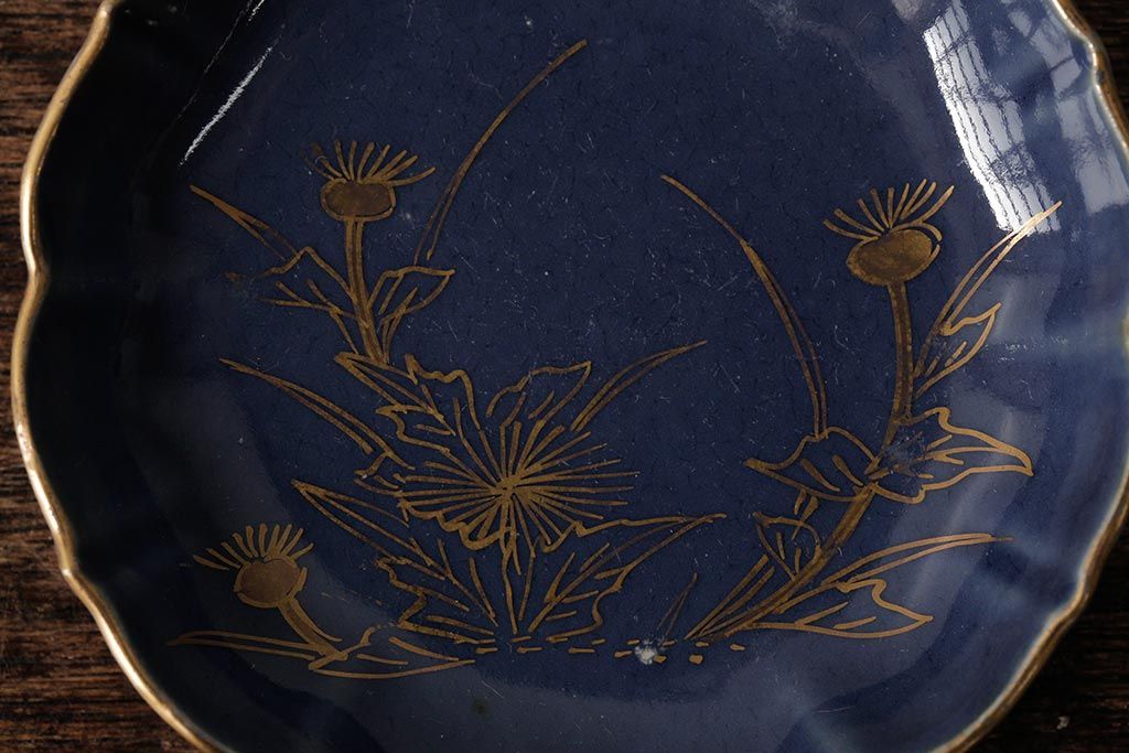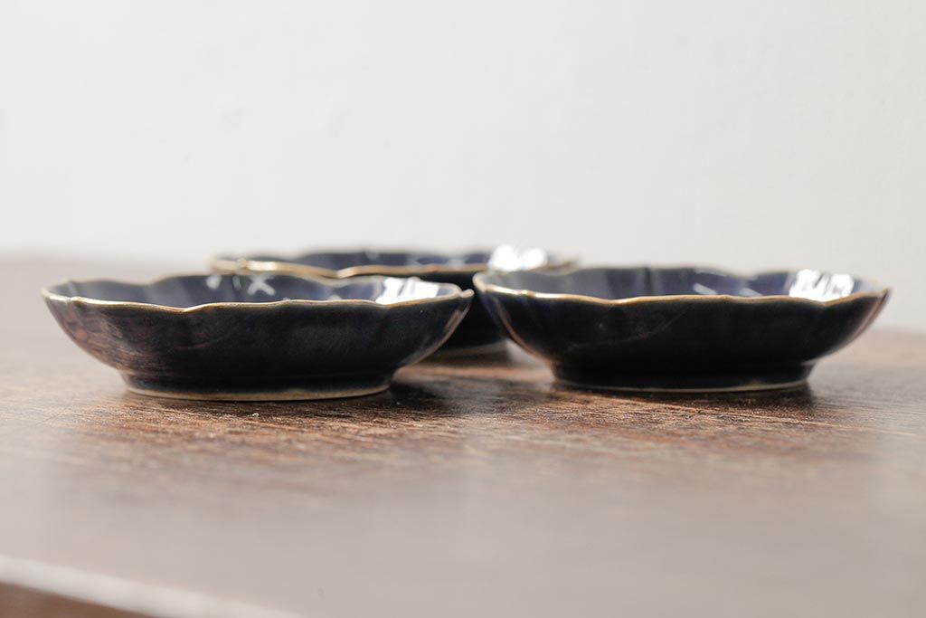 アンティーク雑貨 江戸期 古伊万里 瑠璃金彩花文小皿3枚セット(変形皿、和食器)(R-042529)
