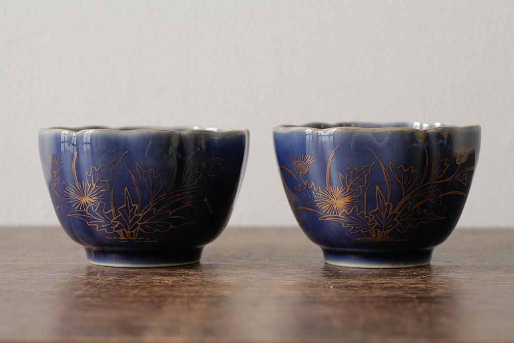 ラフジュ工房> 骨董・美術品> 骨董-陶磁器 > アンティーク雑貨 江戸期 古伊万里 瑠璃金彩花文蕎麦猪口2個セット(向付、和食器)(R-042523)