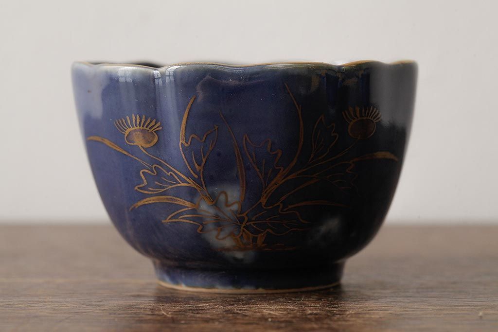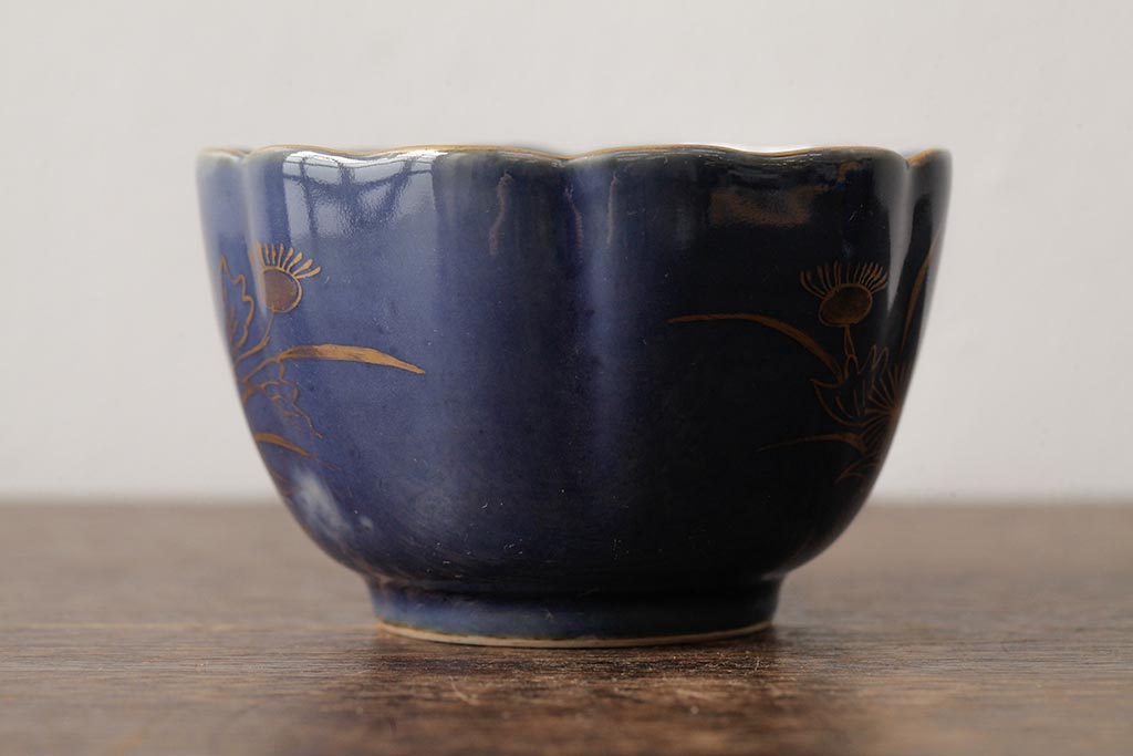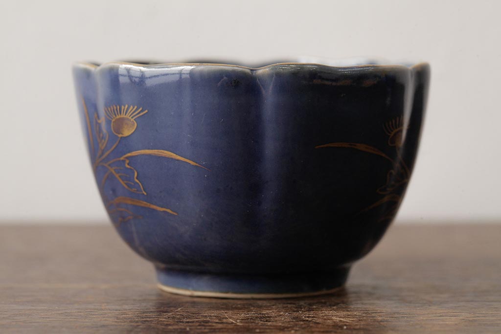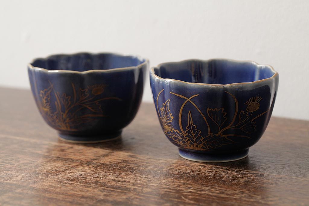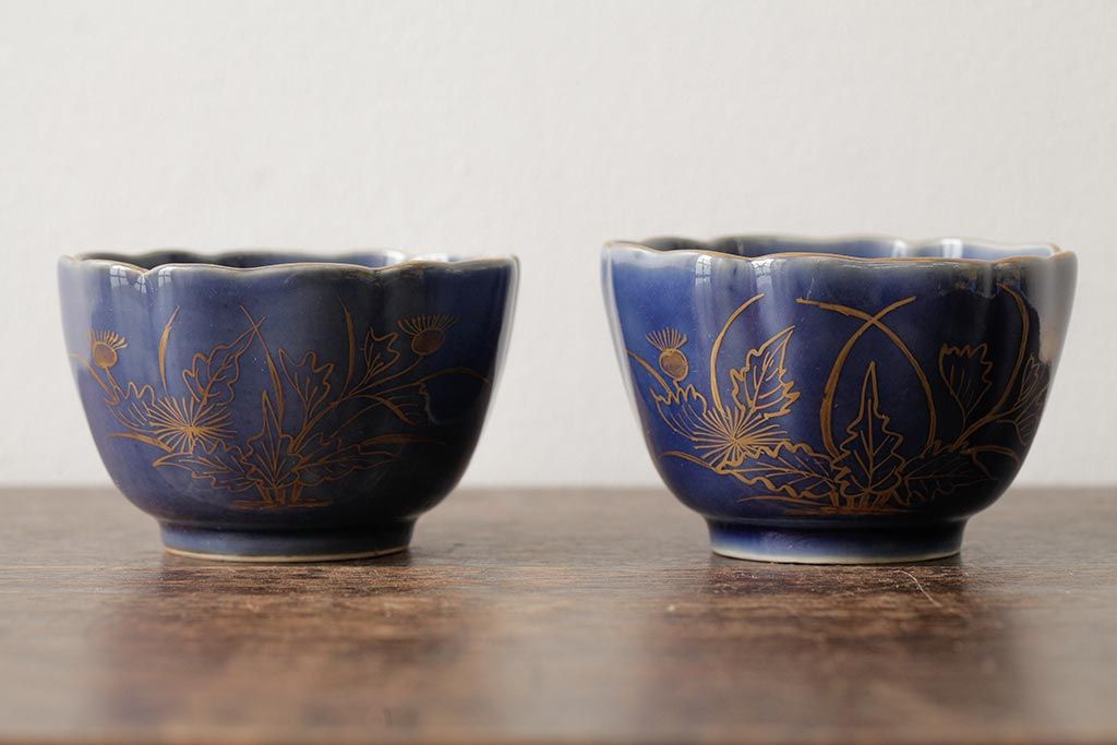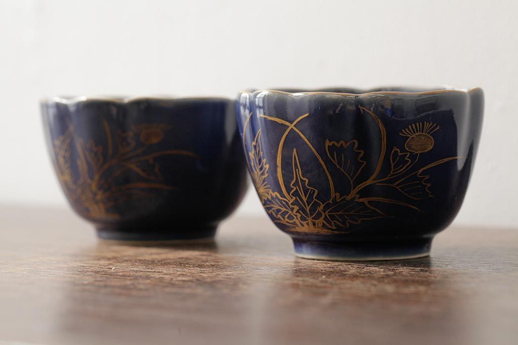 アンティーク雑貨 江戸期 古伊万里 瑠璃金彩花文蕎麦猪口2個セット(向付、和食器)(R-042524)
