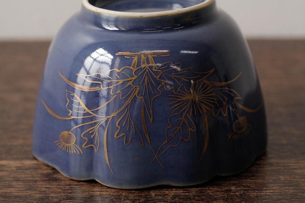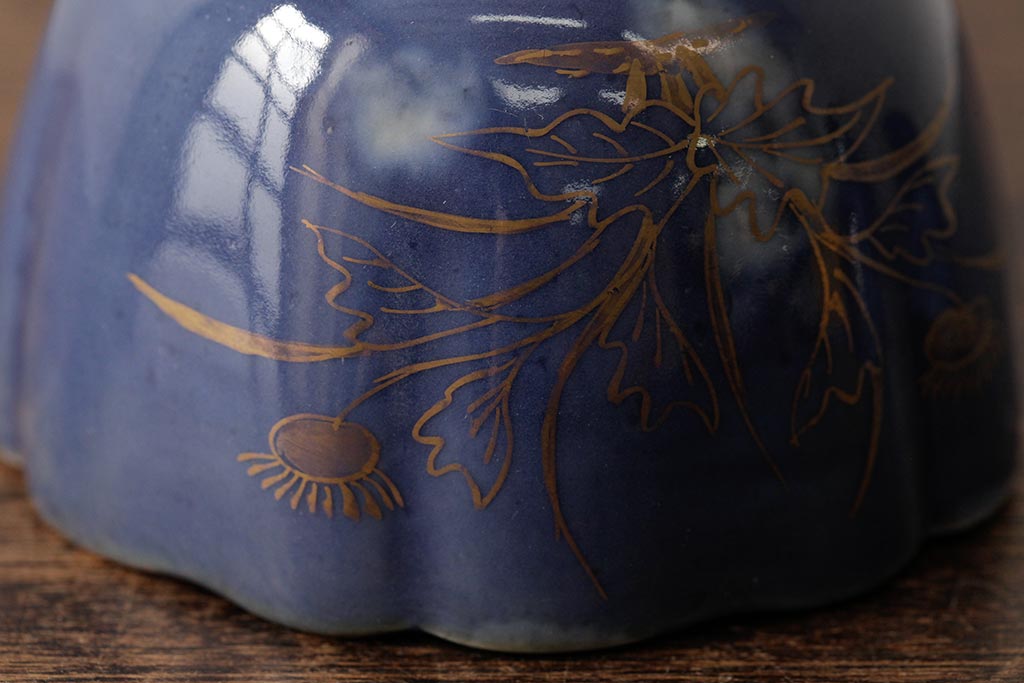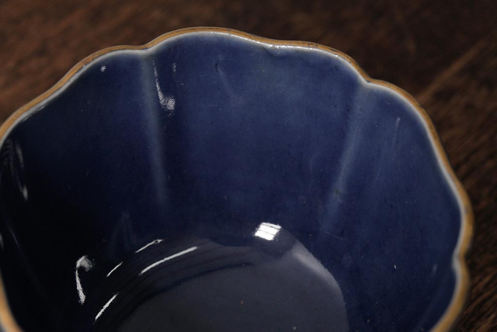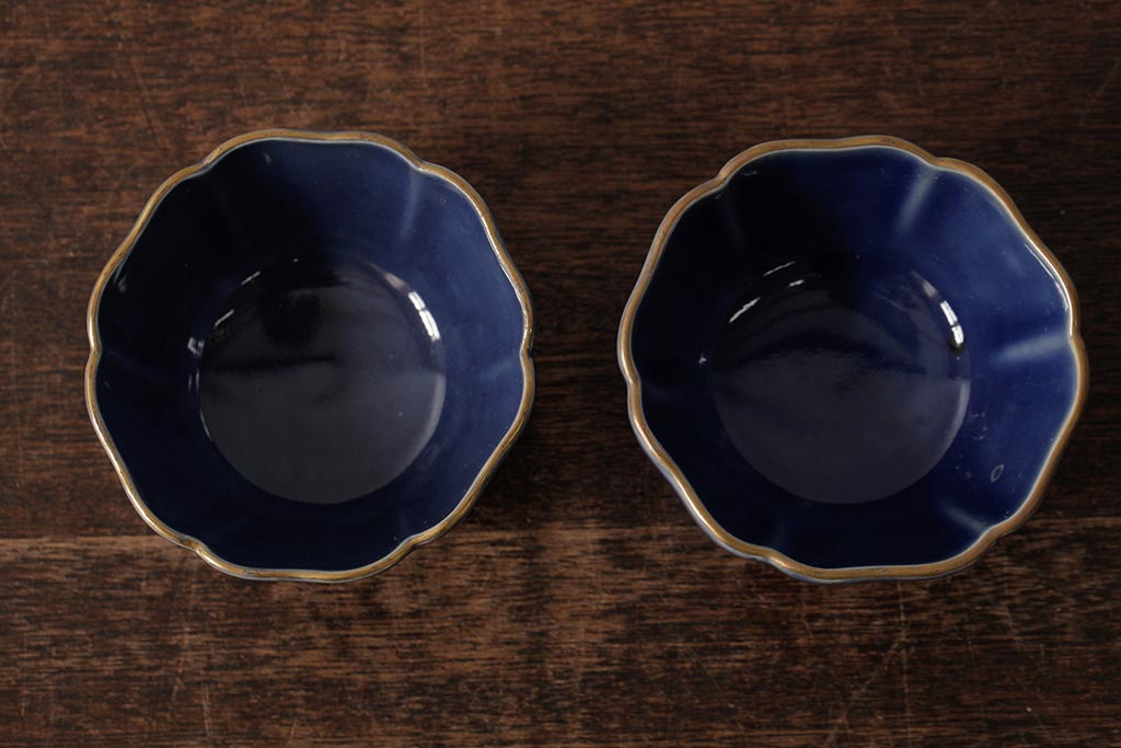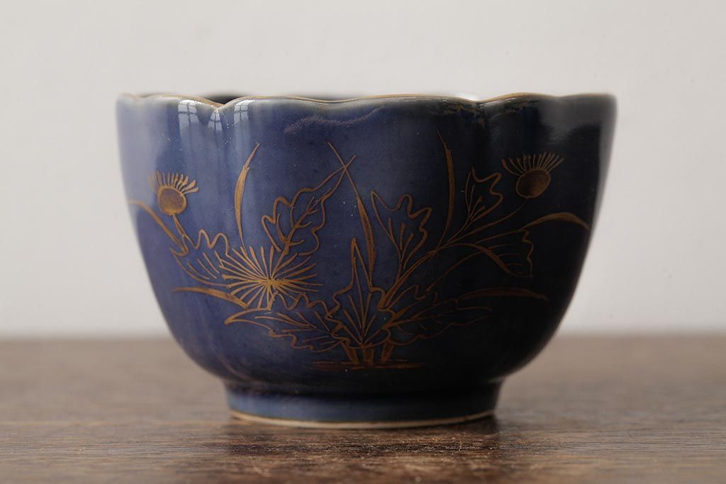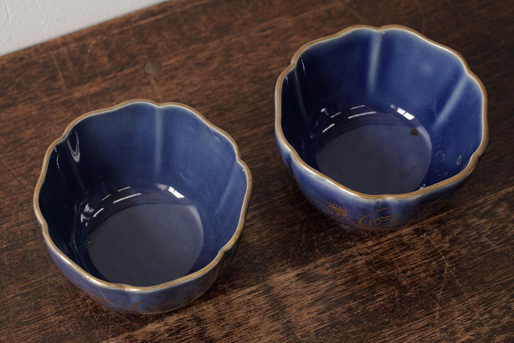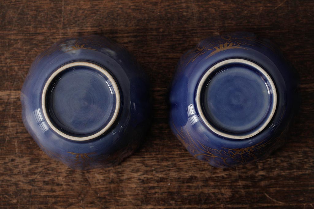 アンティーク雑貨 江戸期 古伊万里 瑠璃金彩花文蕎麦猪口2個セット(向付、和食器)(R-042524)