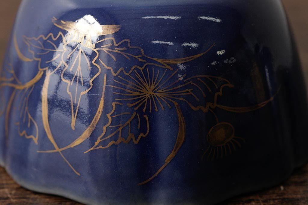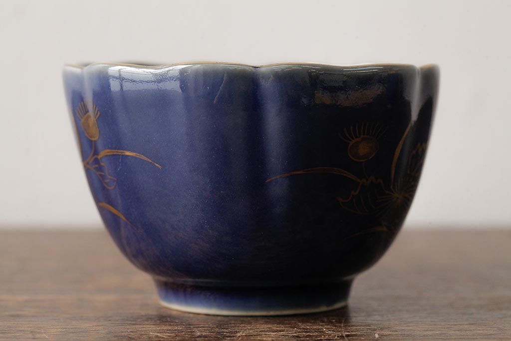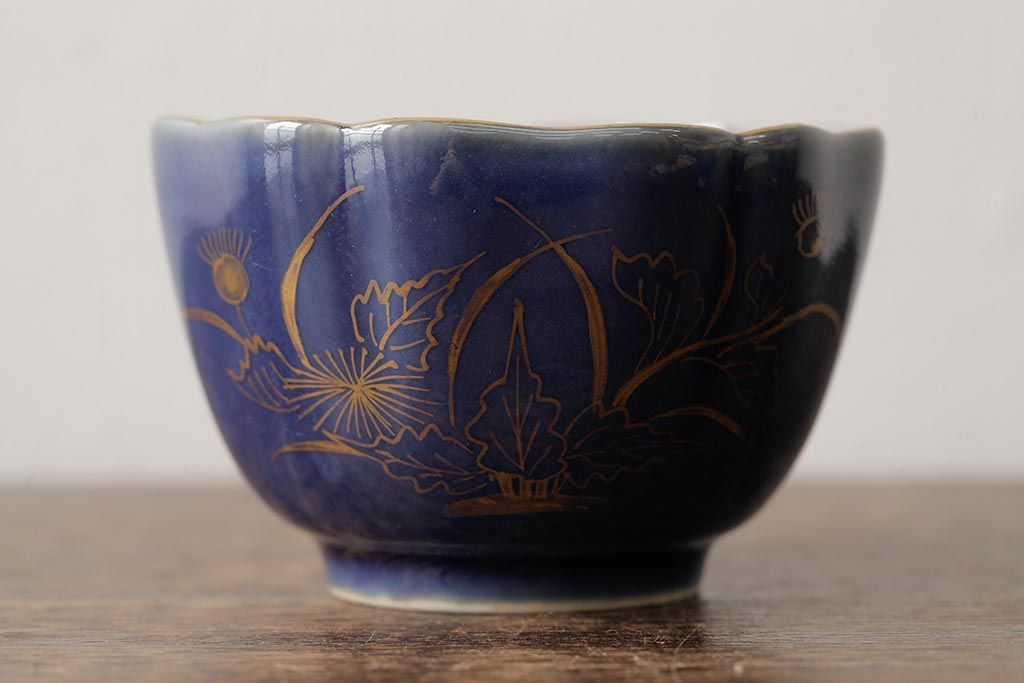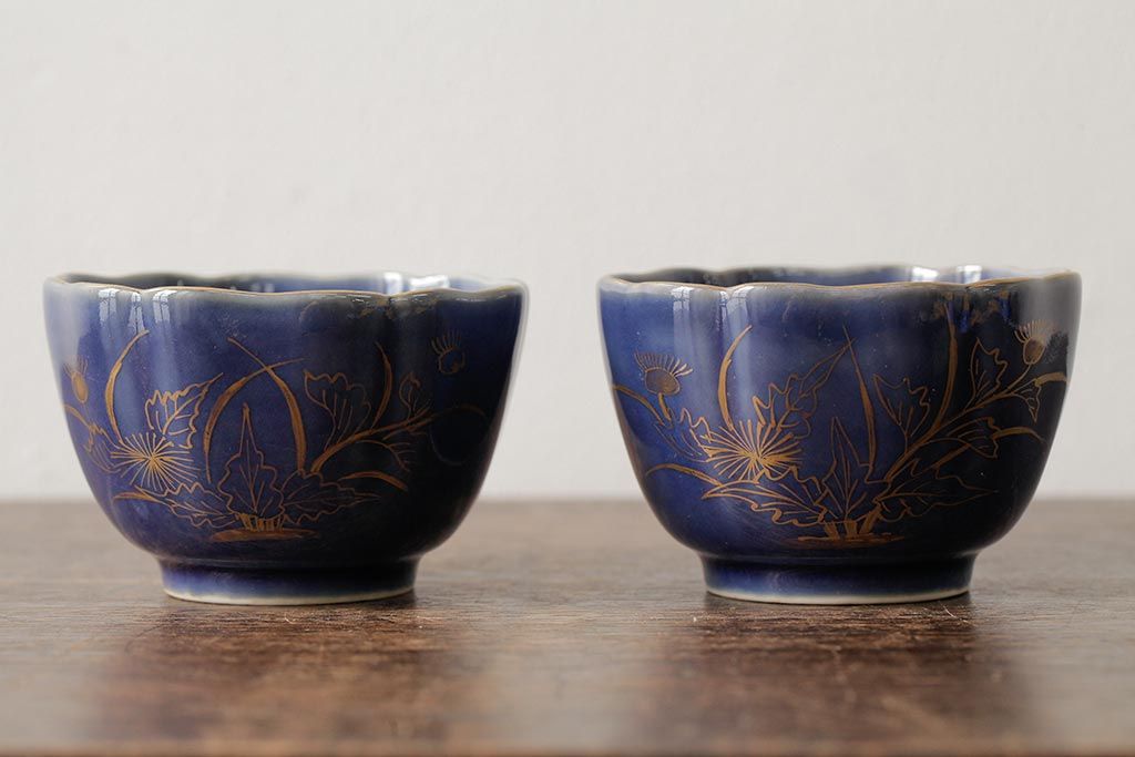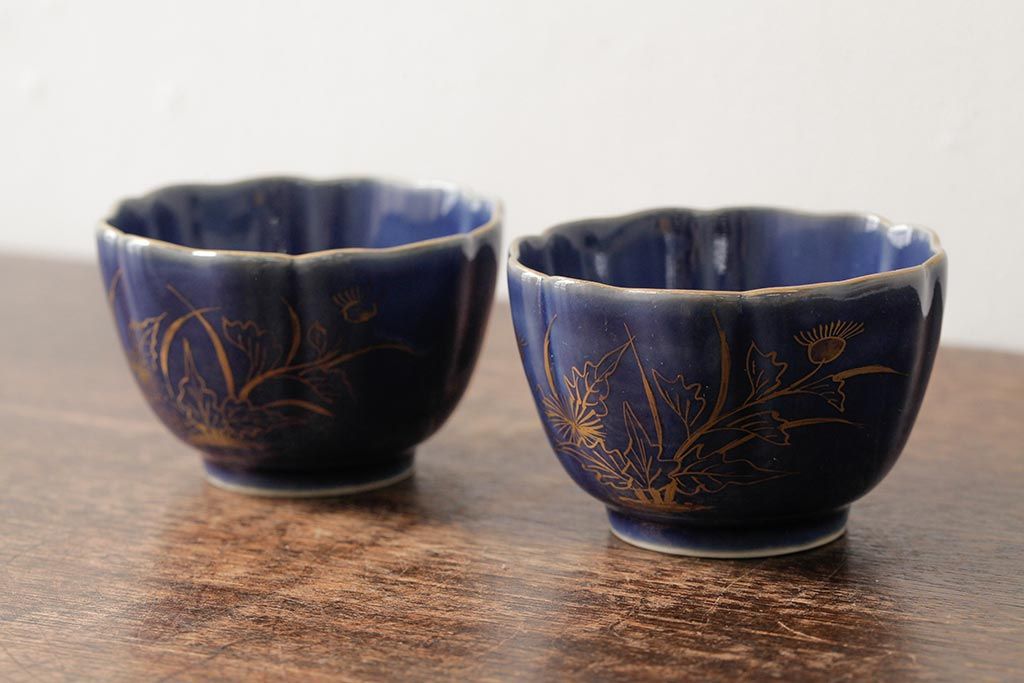 アンティーク雑貨 江戸期 古伊万里 瑠璃金彩花文蕎麦猪口2個セット(向付、和食器)(R-042525)