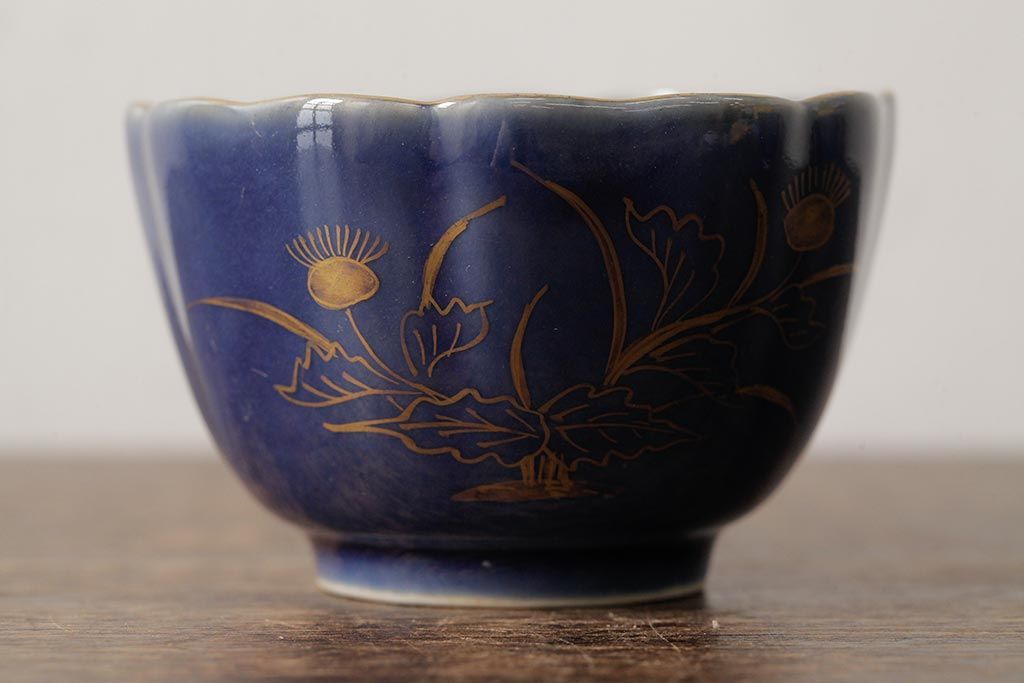 ラフジュ工房> 骨董・美術品> 骨董-陶磁器 > アンティーク雑貨 江戸期 古伊万里 瑠璃金彩花文蕎麦猪口2個セット(向付、和食器)(R-042525)