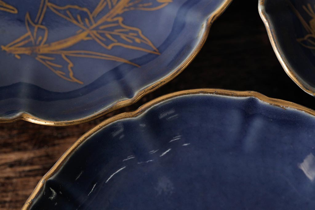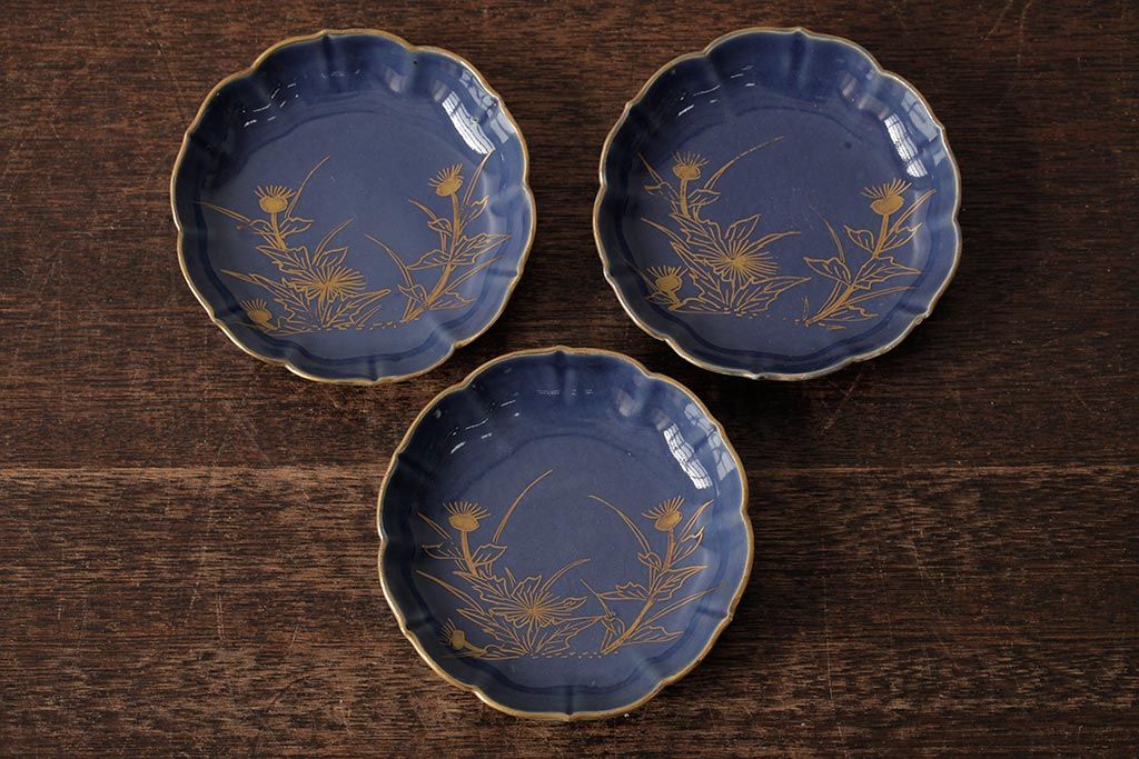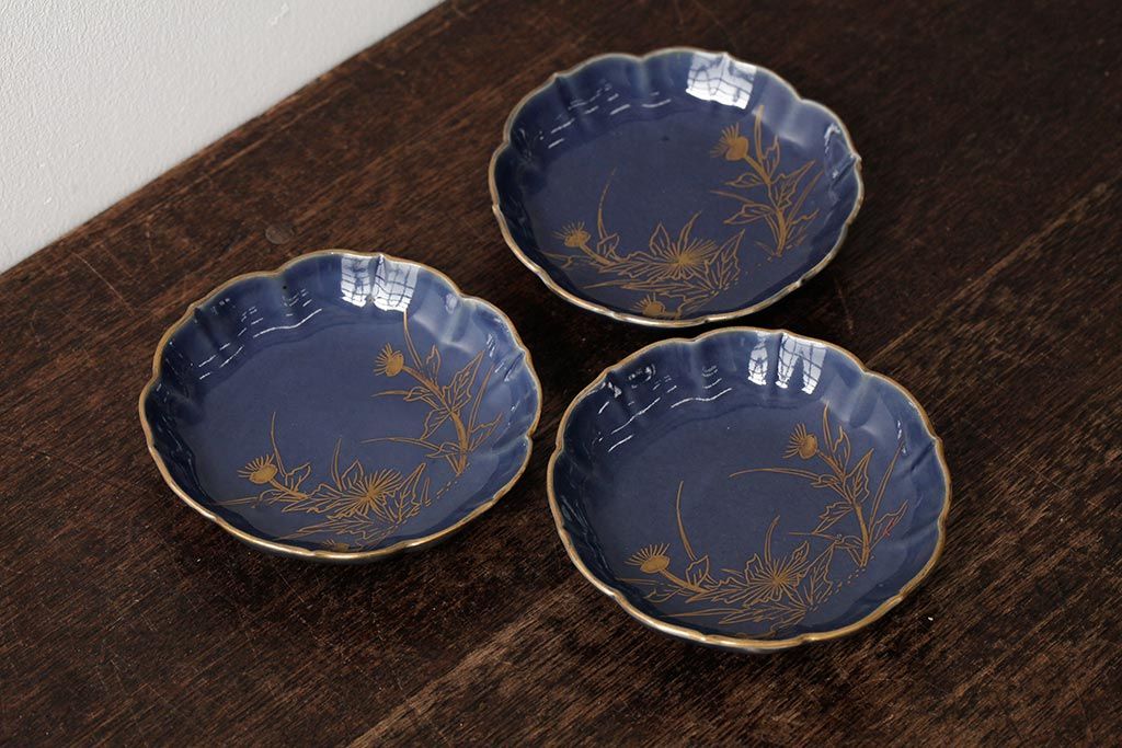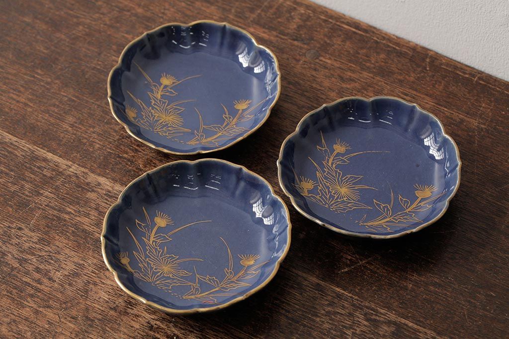 ラフジュ工房> 和食器・茶道具> 皿 > アンティーク雑貨 江戸期 古伊万里 瑠璃金彩花文小皿3枚セット(変形皿、和食器)(R-042527)