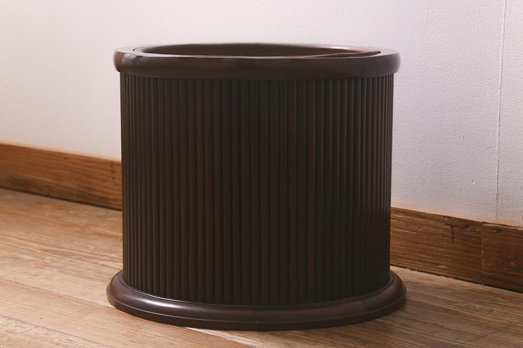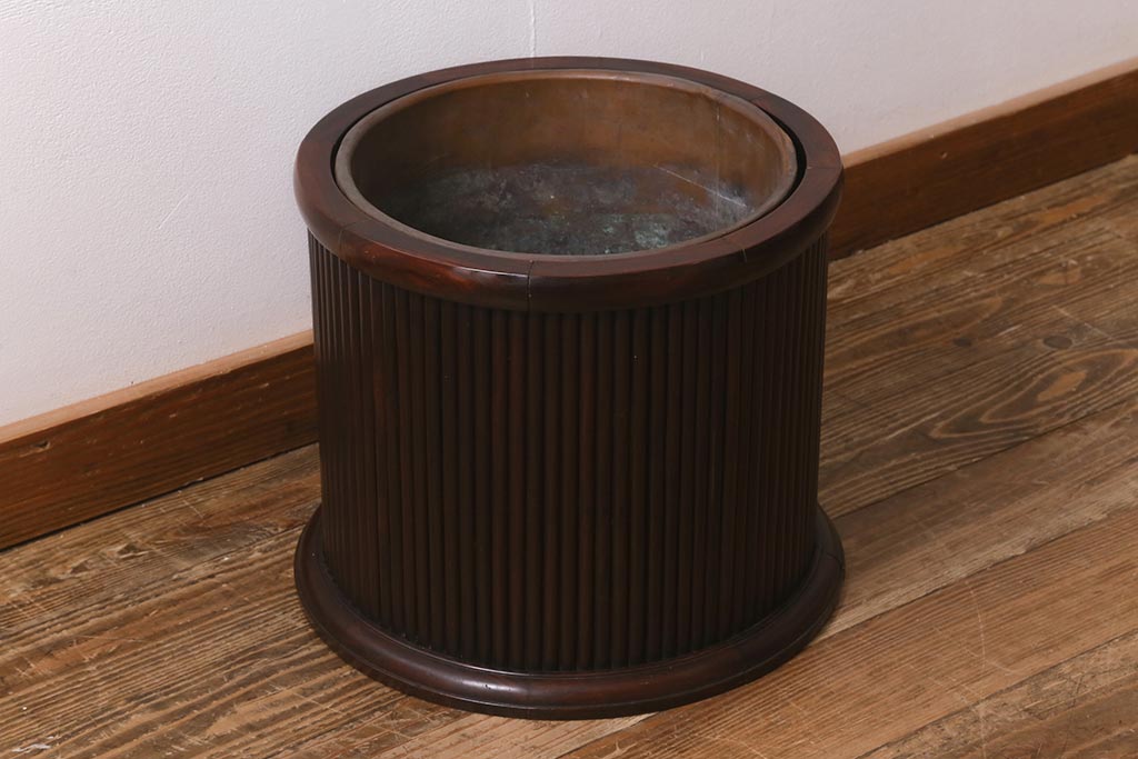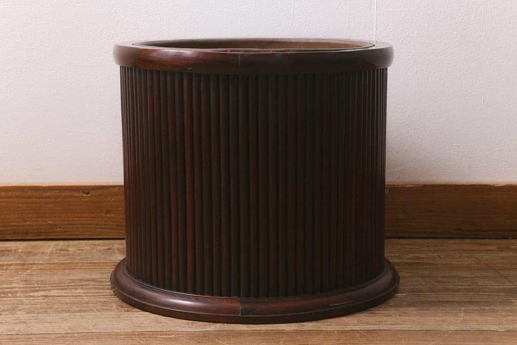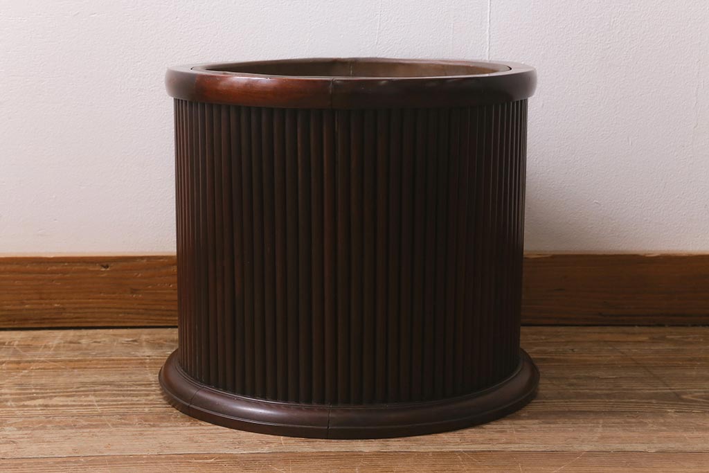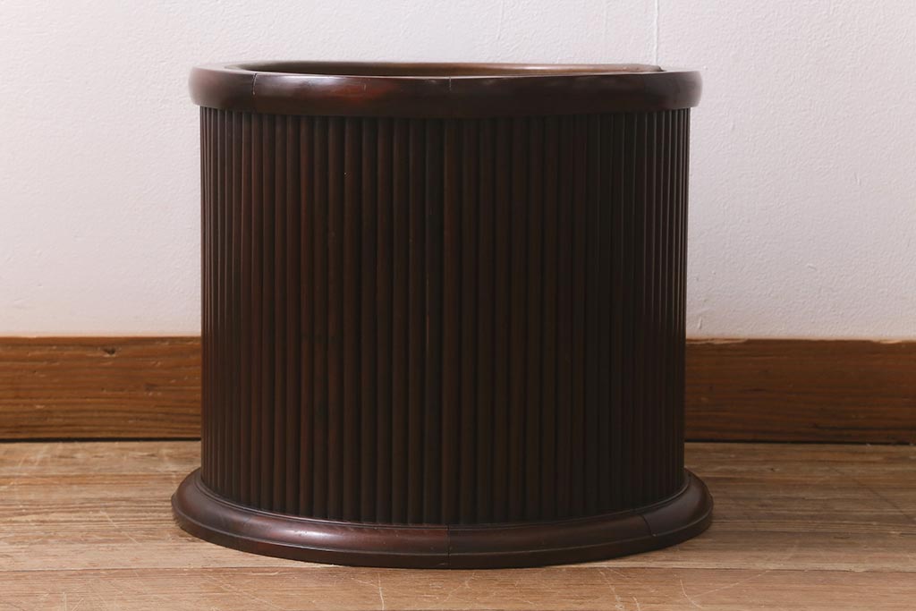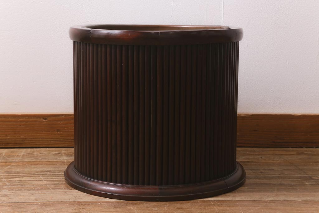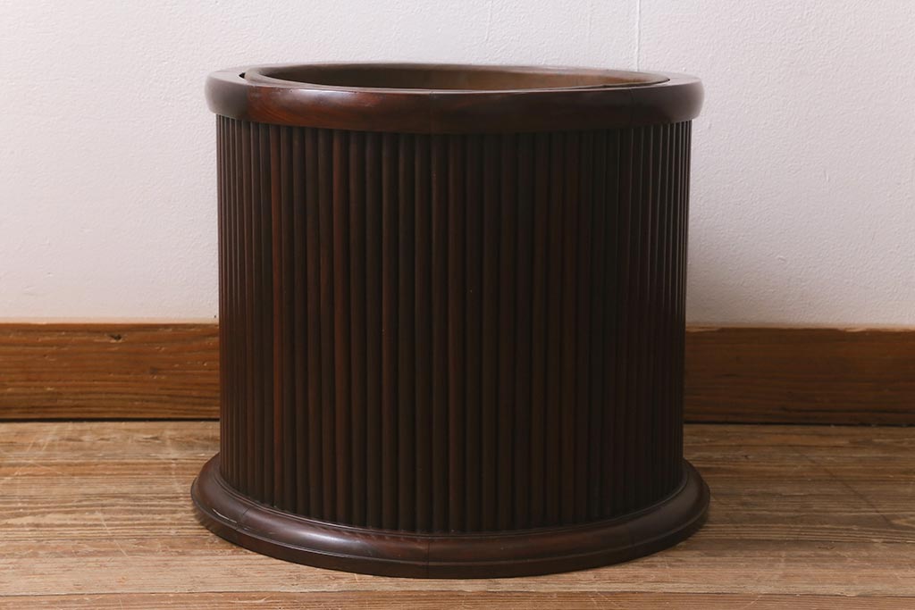 火鉢> 木製火鉢 > アンティーク雑貨 和製アンティーク 紫檀(シタン)材 珍品 円筒形 上質な造りの丸火鉢(手あぶり、木製火鉢)(R-042611)