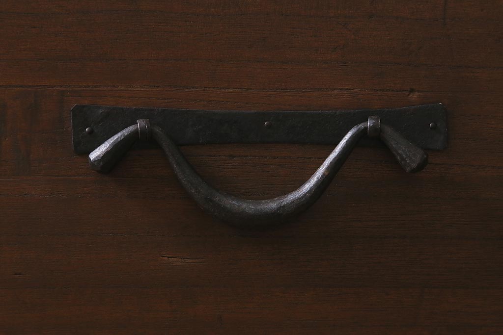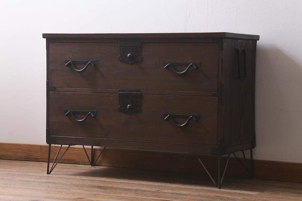 キャビネット・戸棚> テレビ台・ローボード > アンティーク家具 和製アンティーク 鉄脚リメイク 大きな蛭手が目を引く箪笥ローボード(テレビ台、衣装箪笥、チェスト、引き出し、リビングボード)(R-042604)