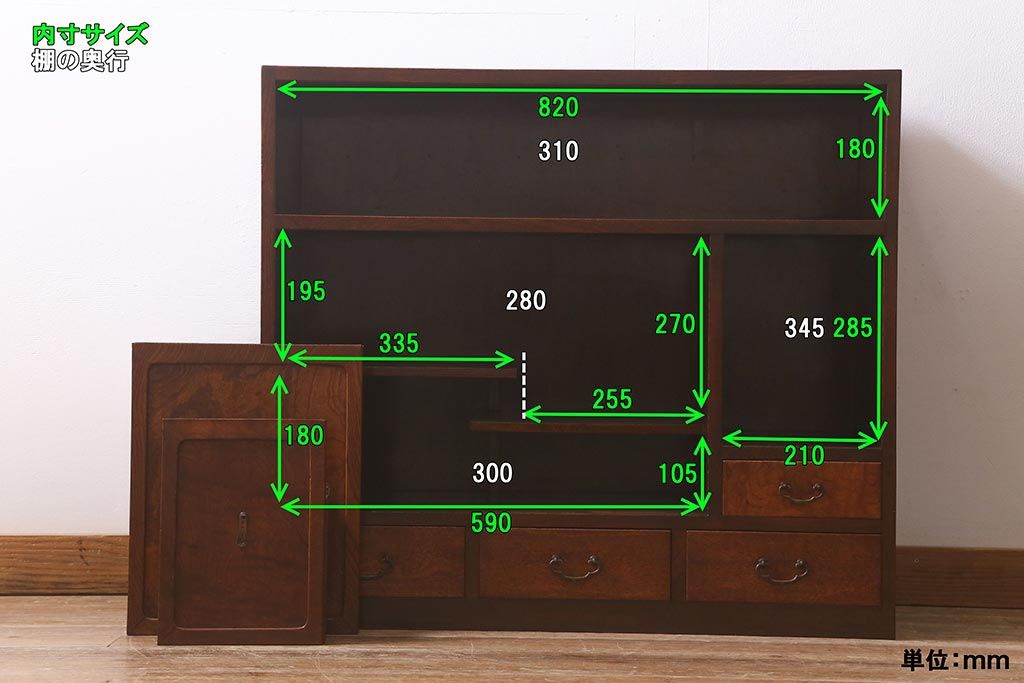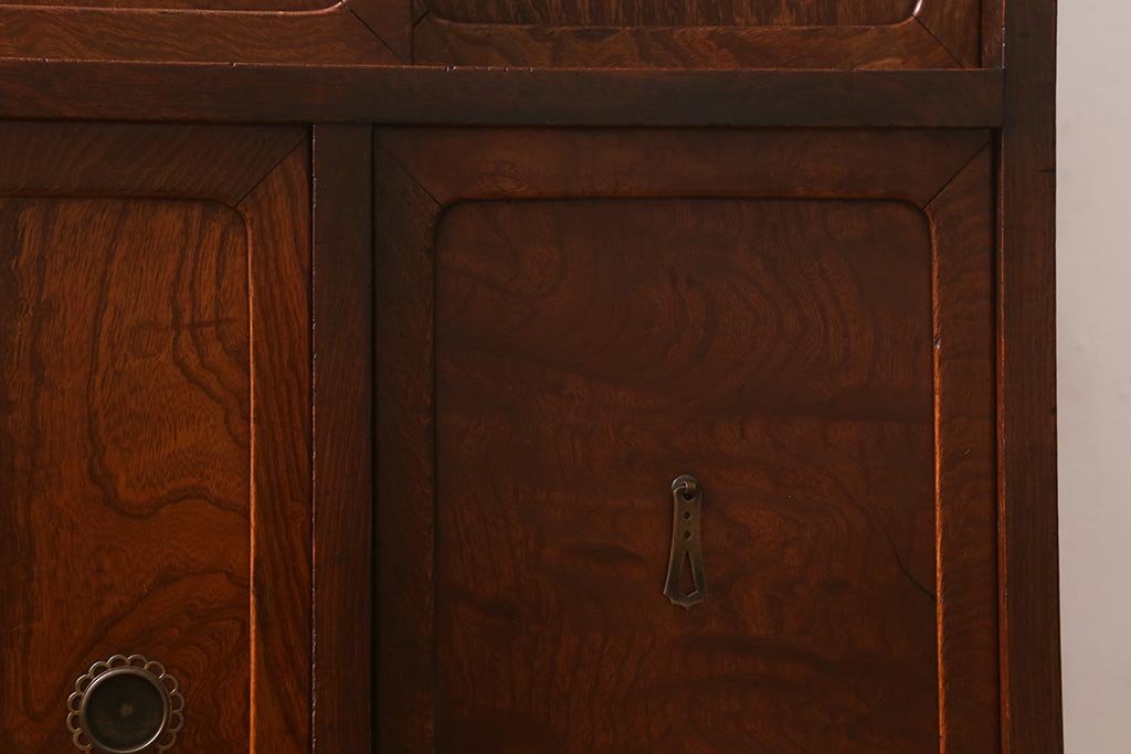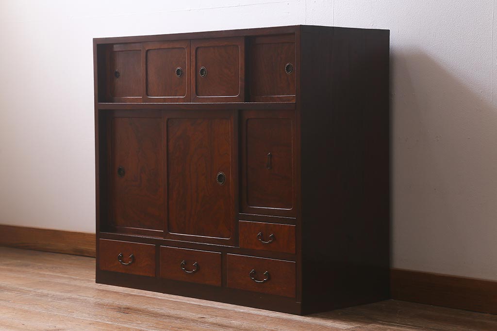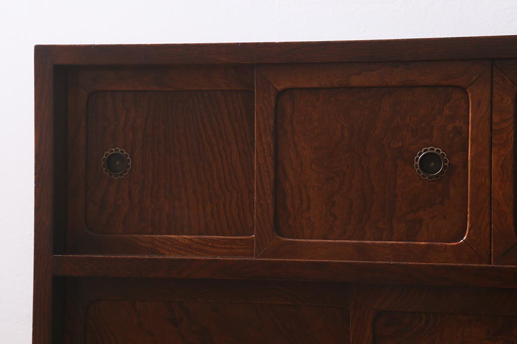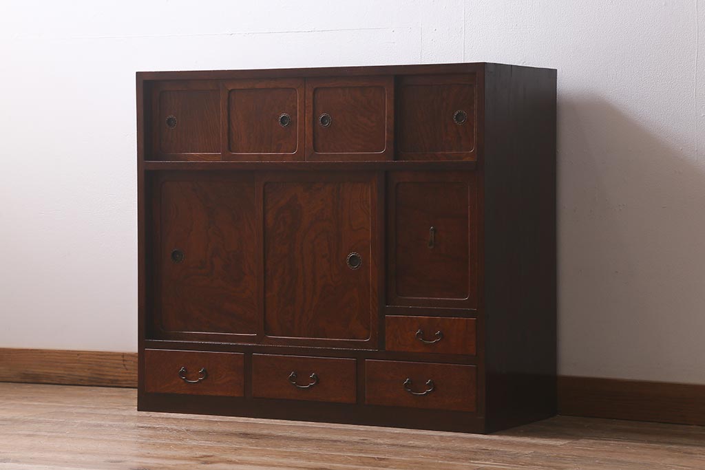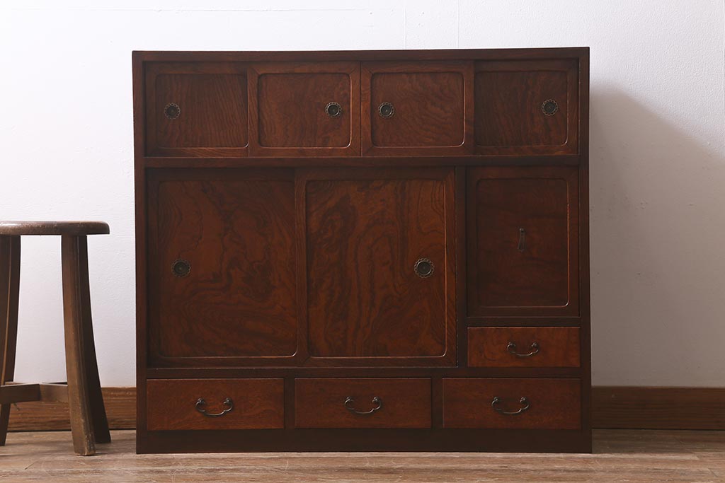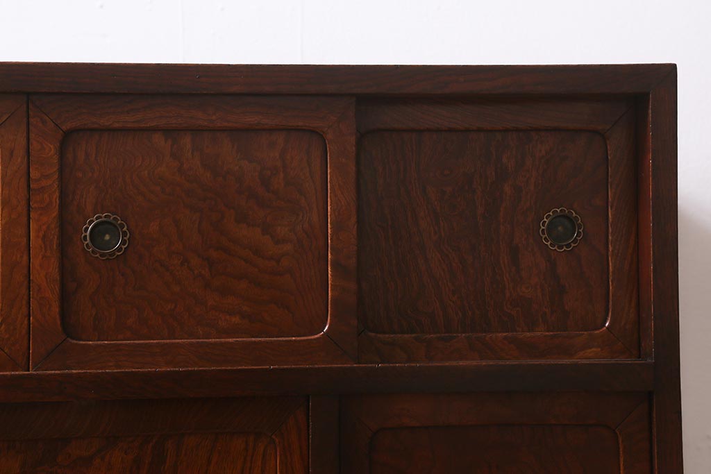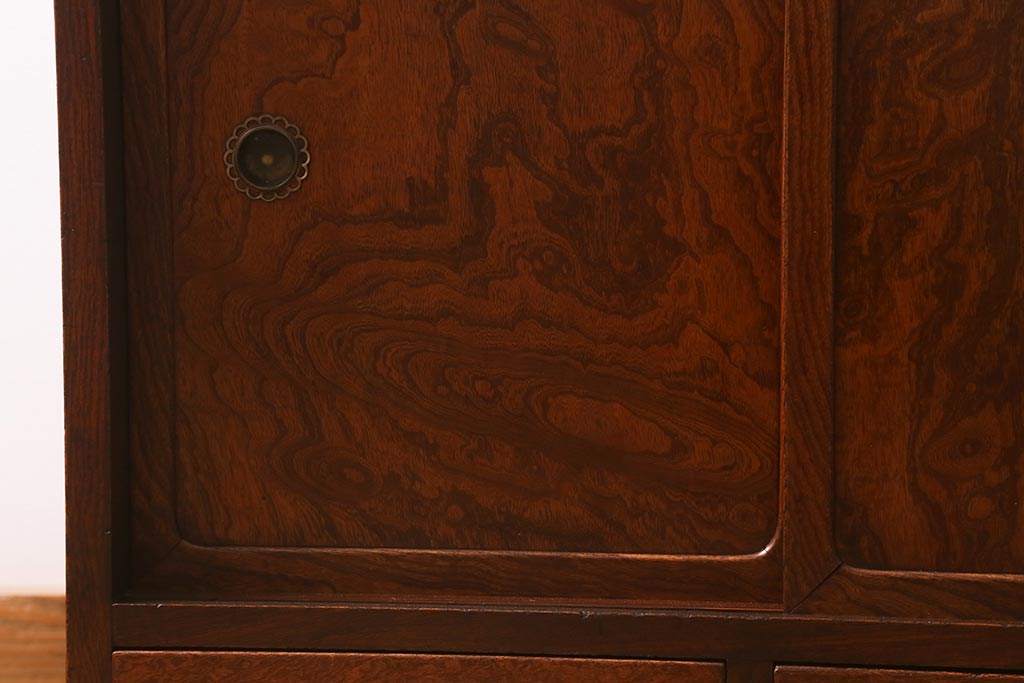 和箪笥> 茶箪笥・茶棚 > アンティーク家具 前面欅(ケヤキ)材 玉杢 倹飩扉付 漆塗りが美しい茶箪笥(戸棚、収納棚)(R-042619)