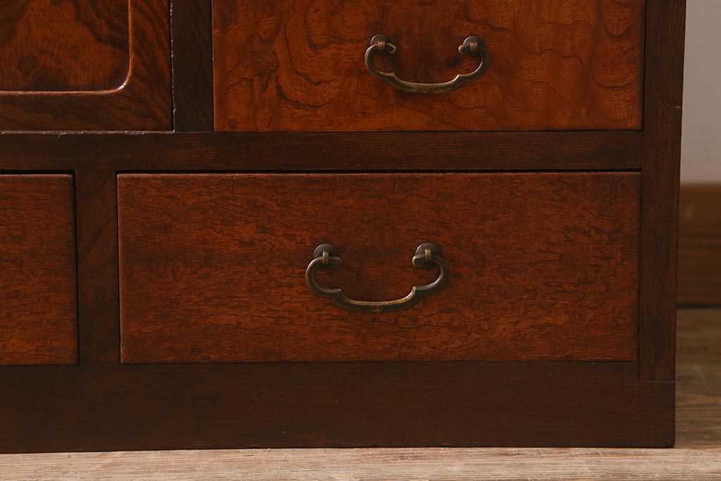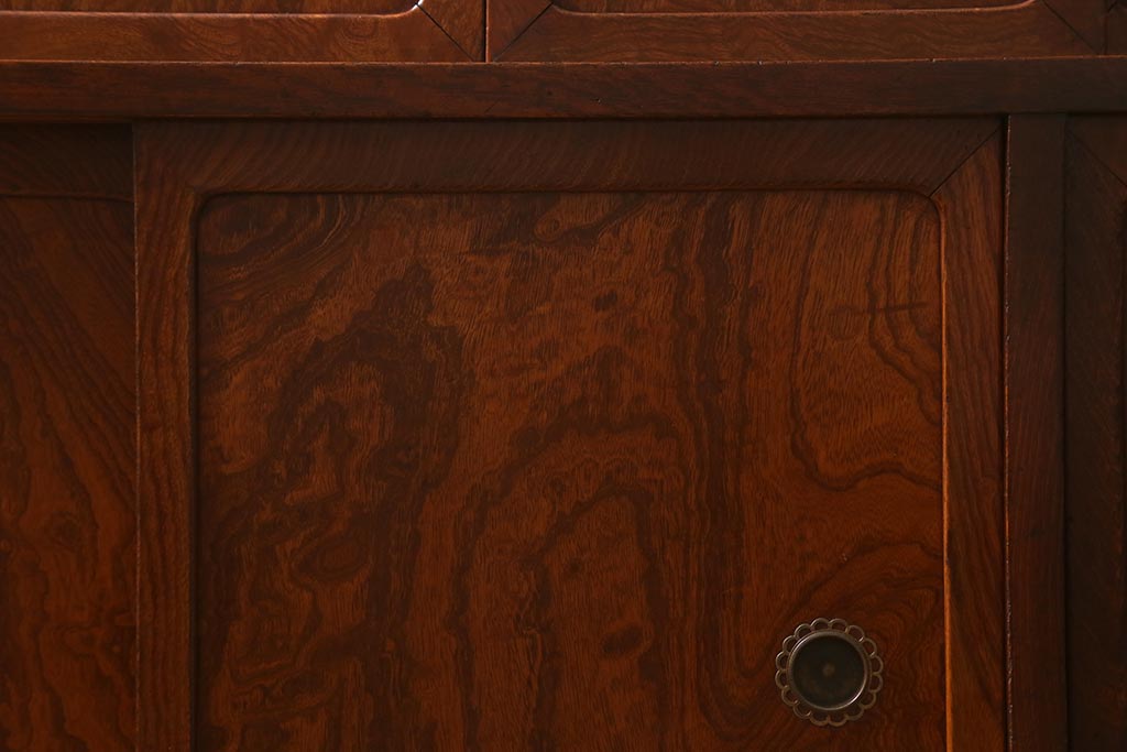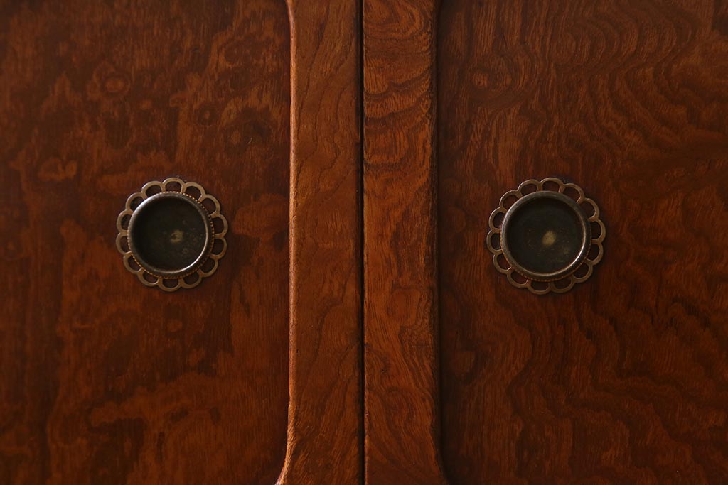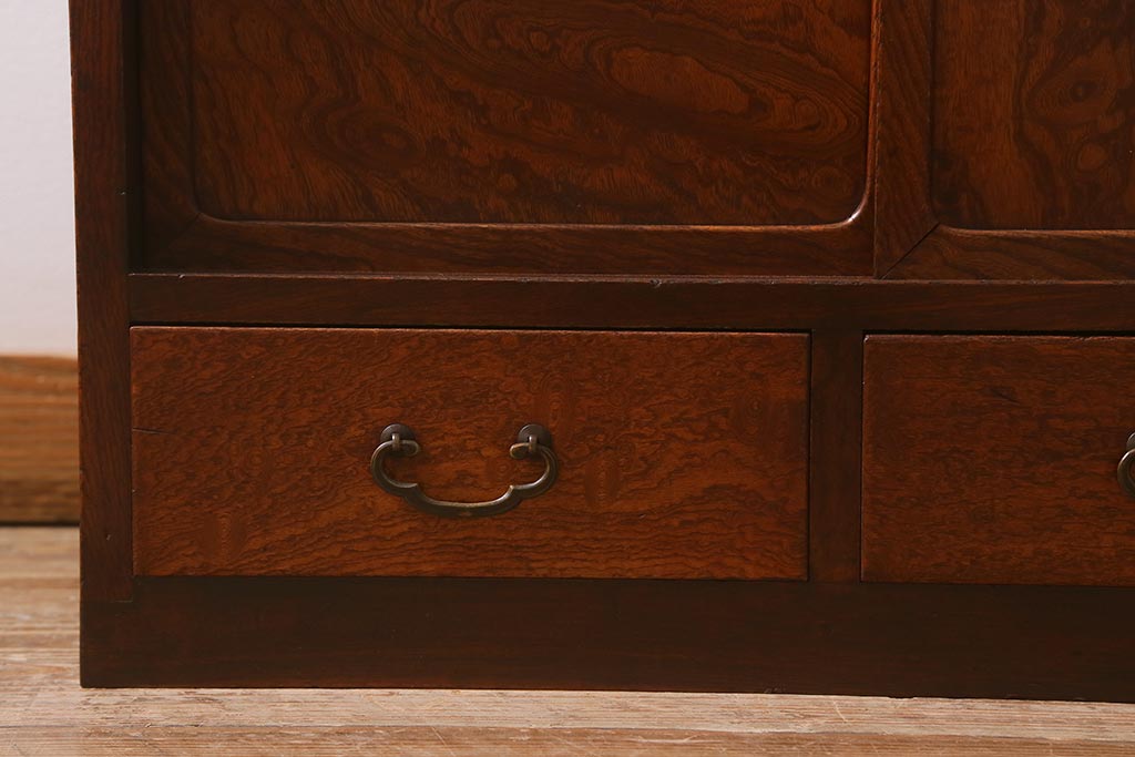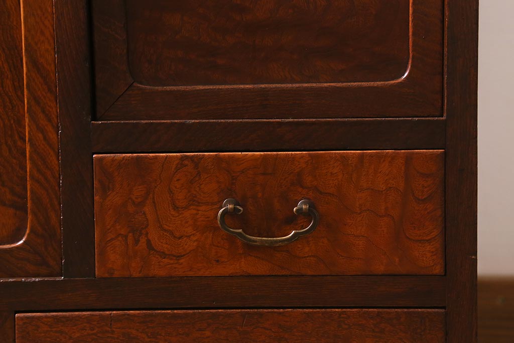 アンティーク家具 前面欅(ケヤキ)材 玉杢 倹飩扉付 漆塗りが美しい茶箪笥(戸棚、収納棚)(R-042619)