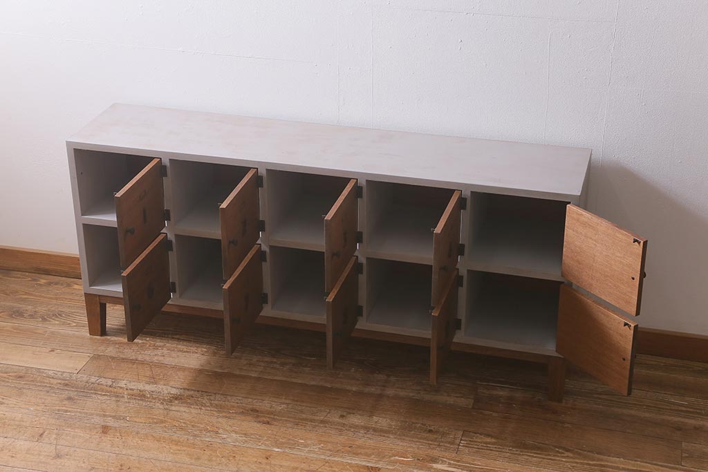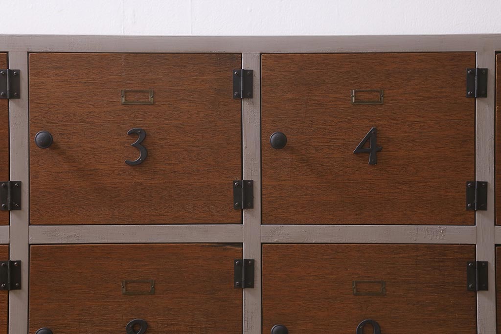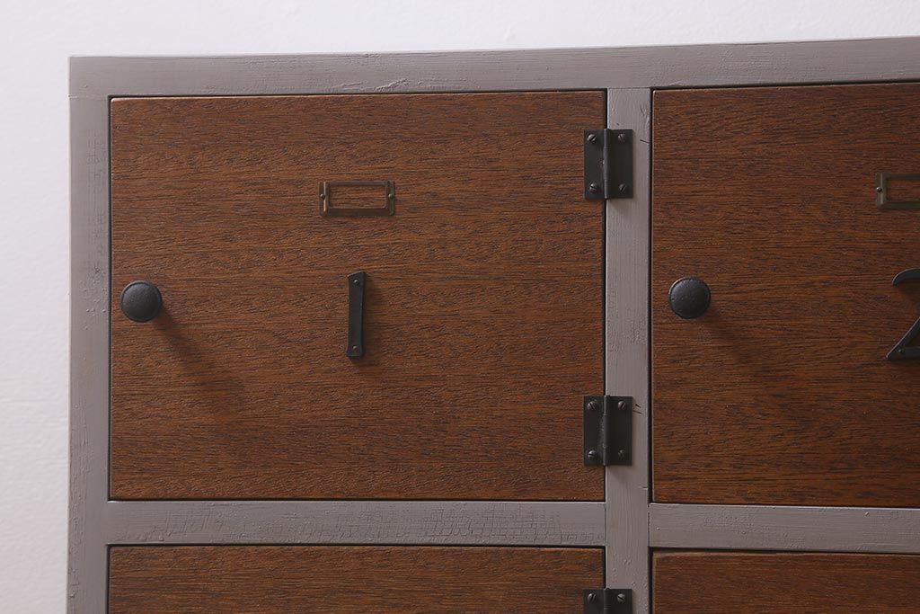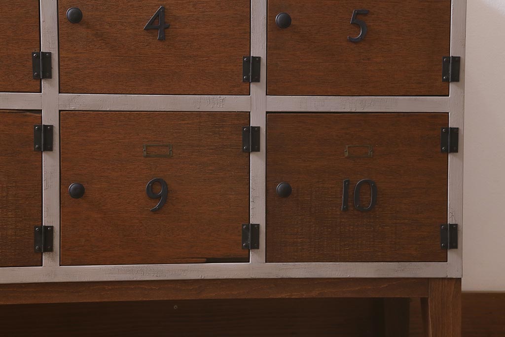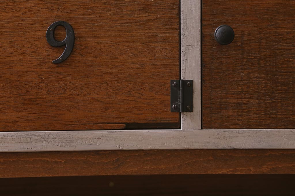 ワードローブ・ロッカー> ロッカー > ラフジュ工房オリジナル ペイント 脚付き 古材リメイク 前板ラワン古材・ヒノキ無垢材 数字プレート・ネームプレート付きの下駄箱(収納棚、ロッカー、マス目棚)(R-042634)