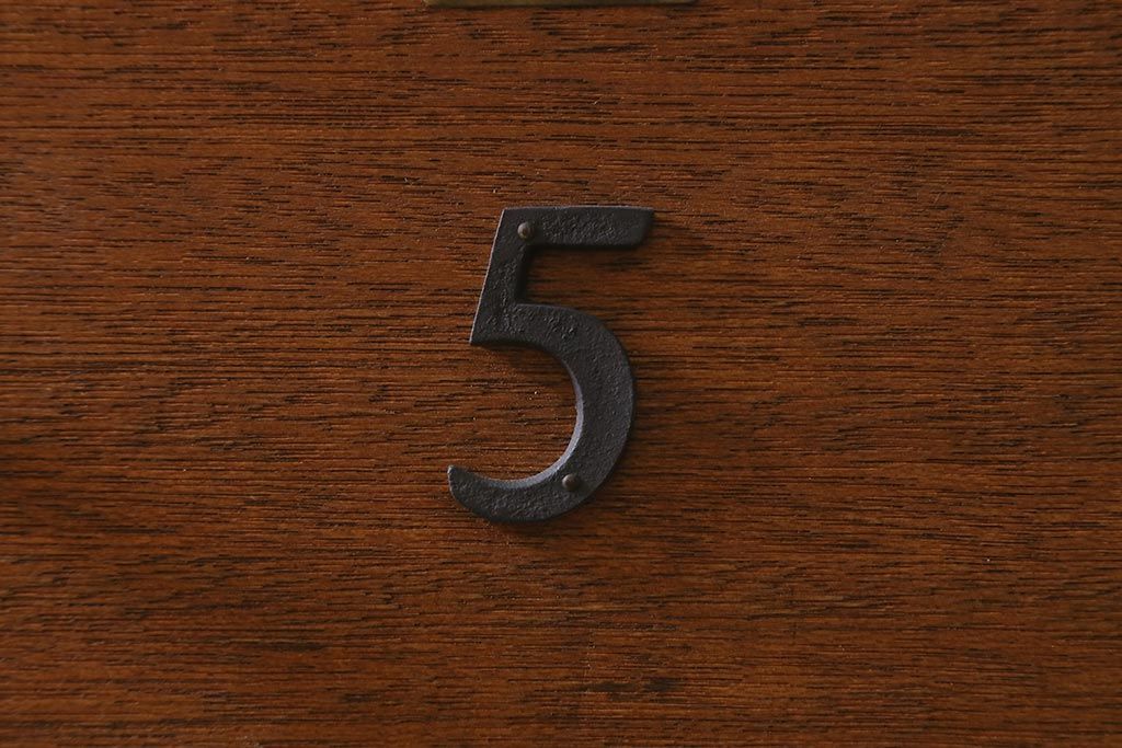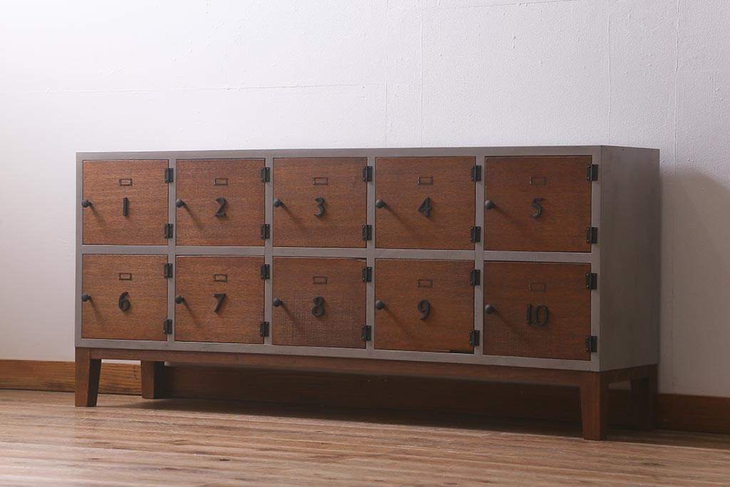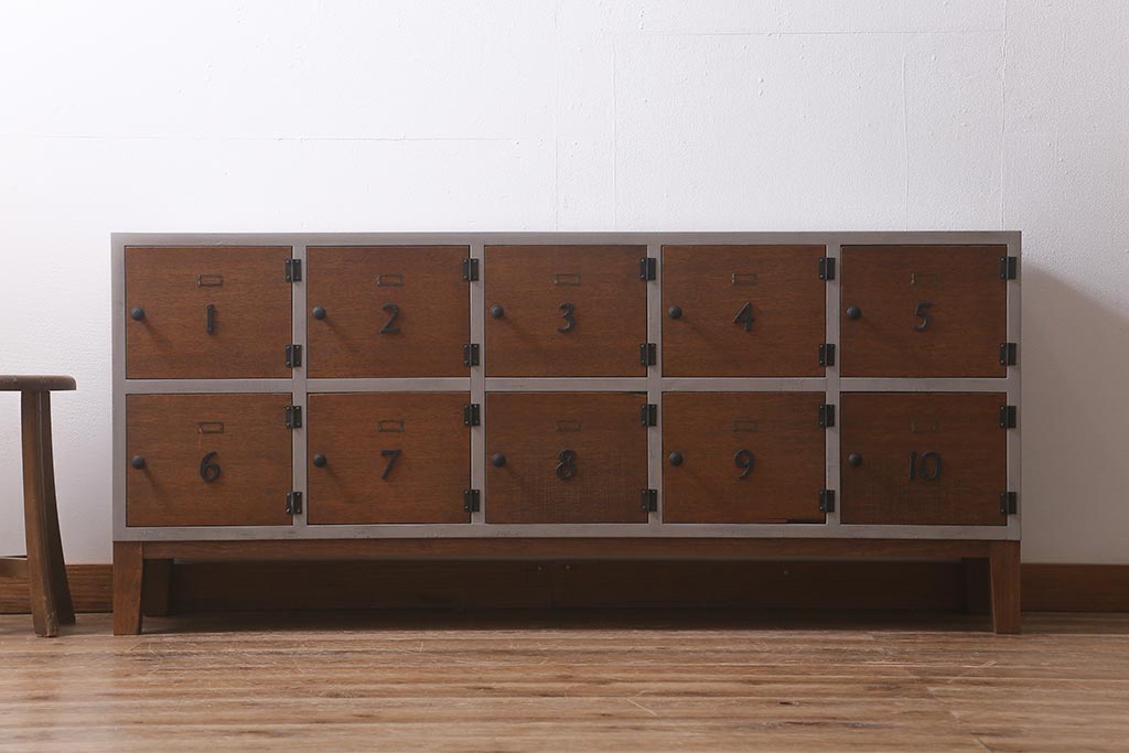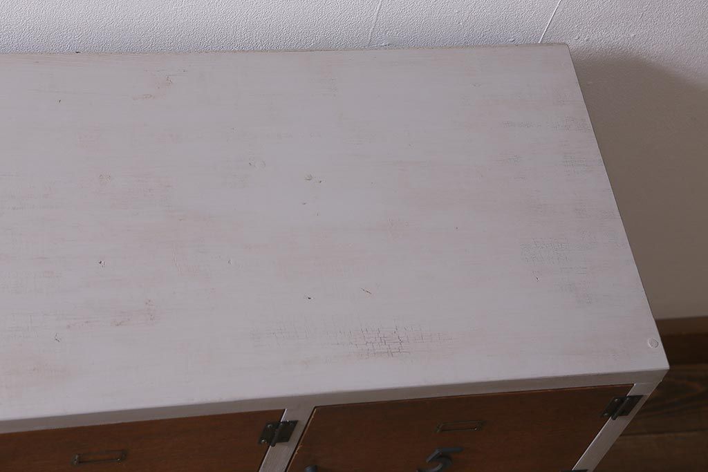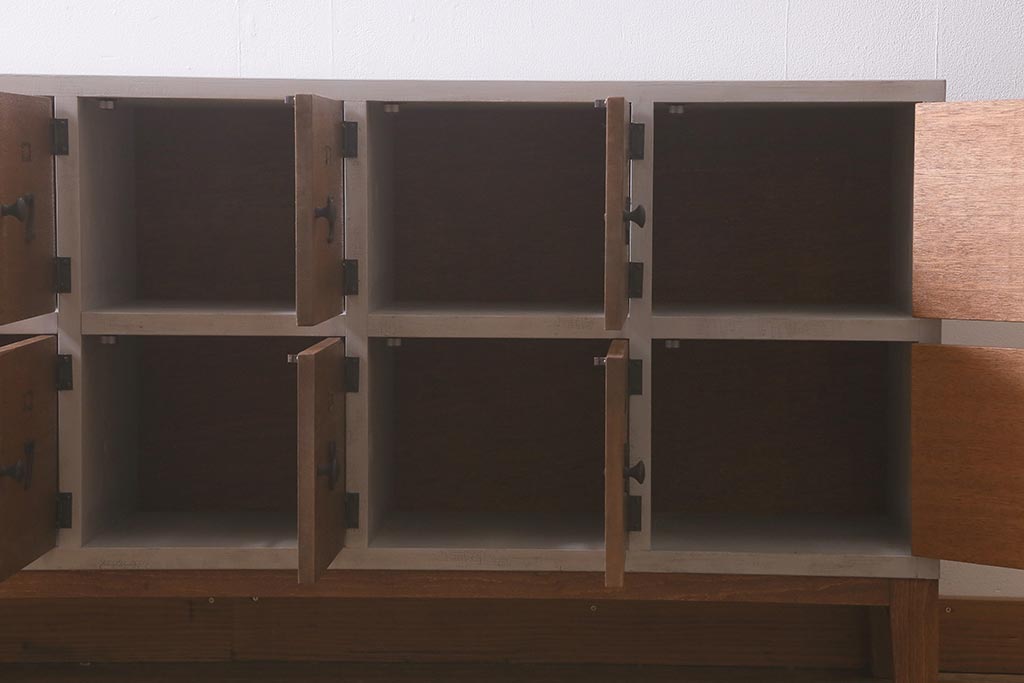 ワードローブ・ロッカー> ロッカー > ラフジュ工房オリジナル ペイント 脚付き 古材リメイク 前板ラワン古材・ヒノキ無垢材 数字プレート・ネームプレート付きの下駄箱(収納棚、ロッカー、マス目棚)(R-042634)