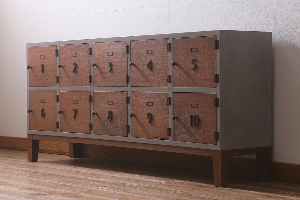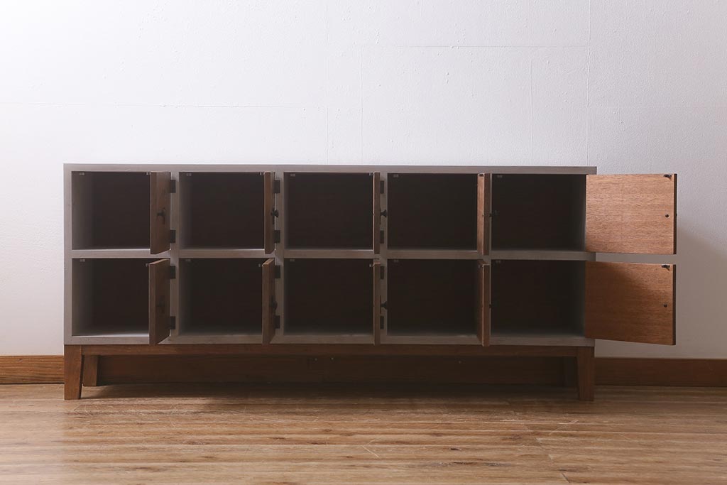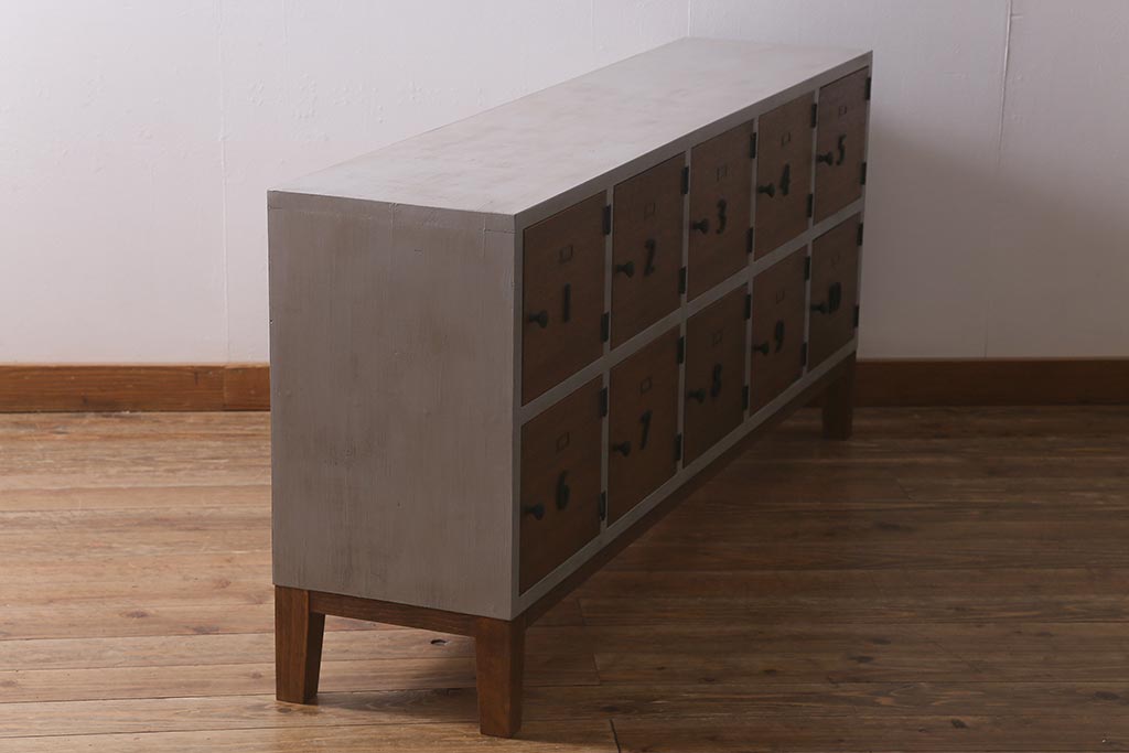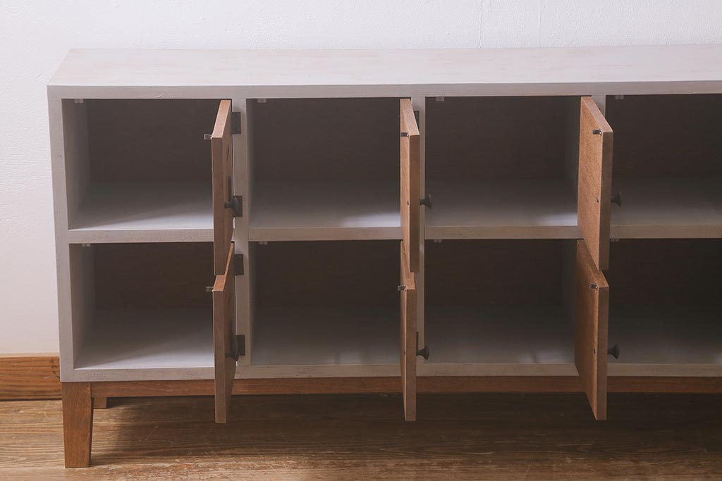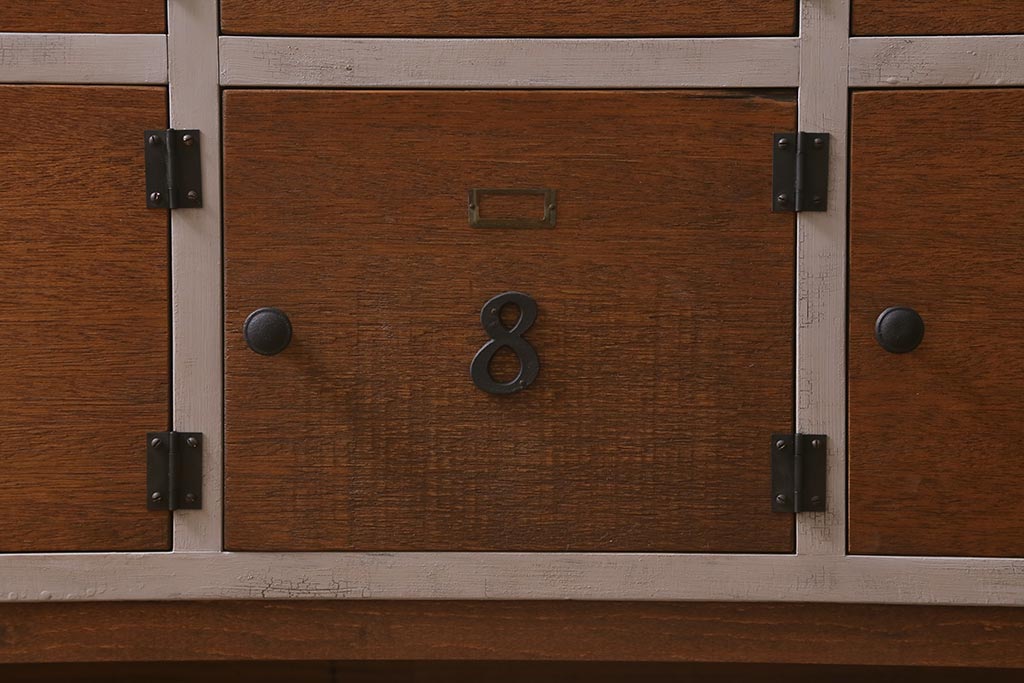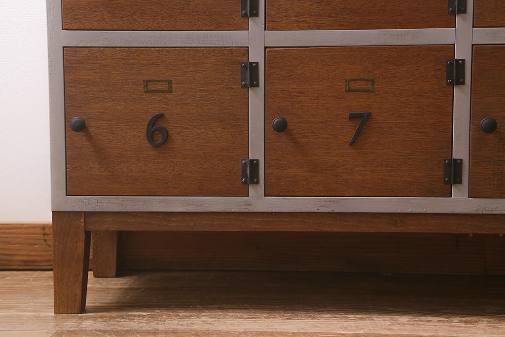 ワードローブ・ロッカー > ラフジュ工房オリジナル ペイント 脚付き 古材リメイク 前板ラワン古材・ヒノキ無垢材 数字プレート・ネームプレート付きの下駄箱(収納棚、ロッカー、マス目棚)(R-042634)
