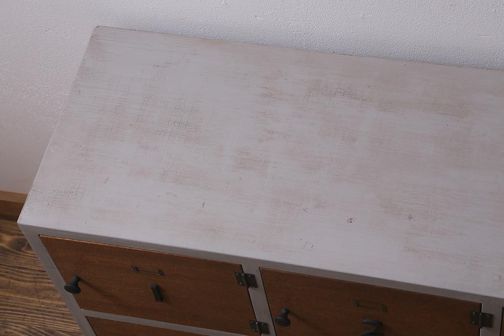キャビネット・戸棚> 下駄箱 > ラフジュ工房オリジナル ペイント 脚付き 古材リメイク 前板ラワン古材・ヒノキ無垢材 数字プレート・ネームプレート付きの下駄箱(収納棚、ロッカー、マス目棚)(R-042634)