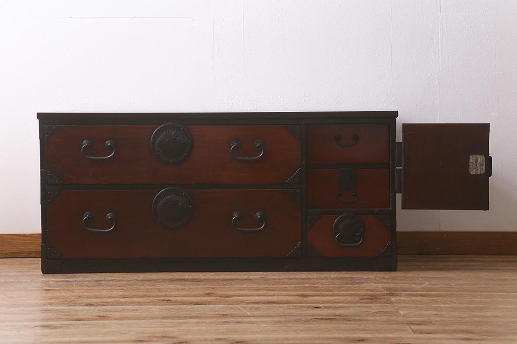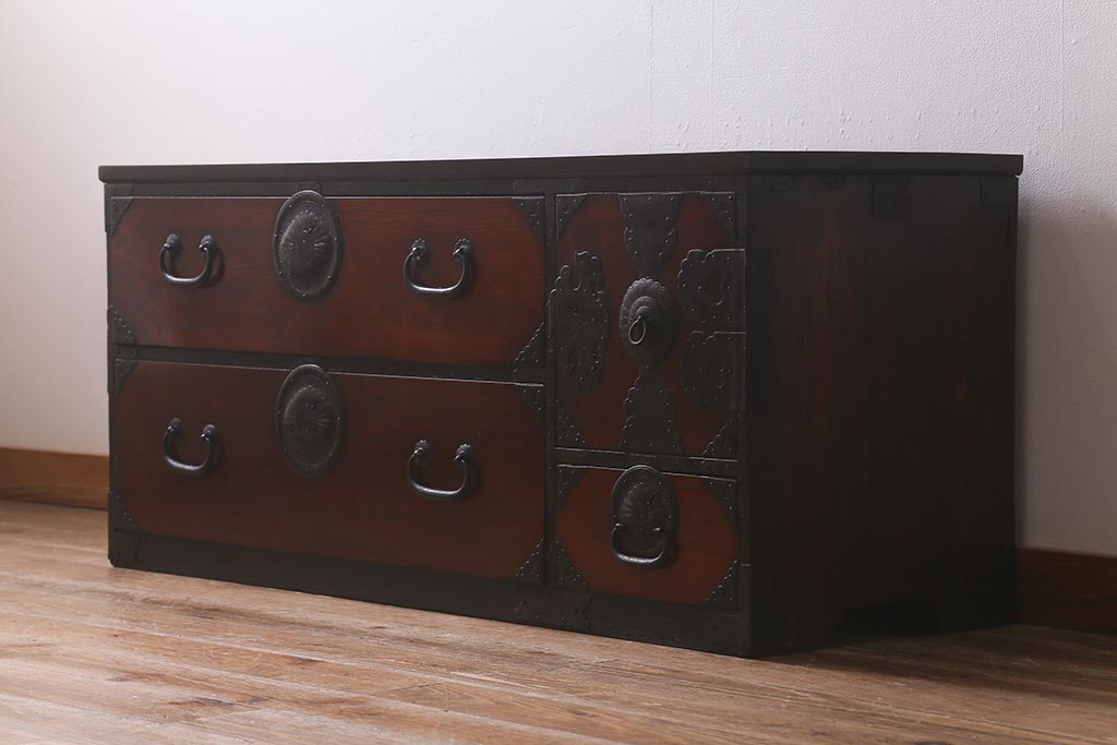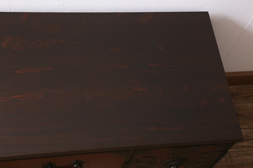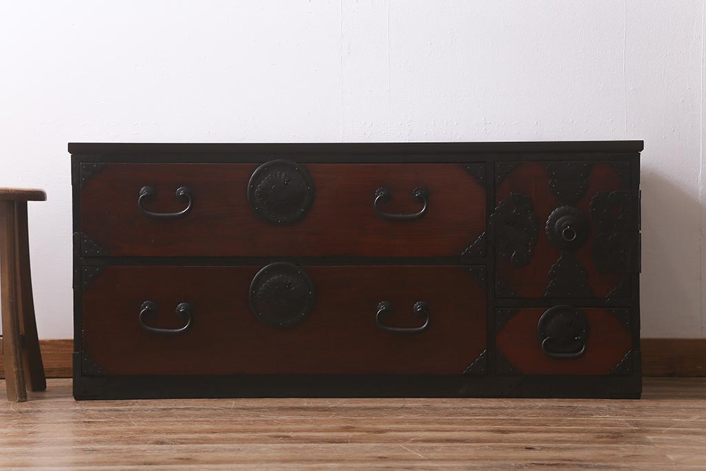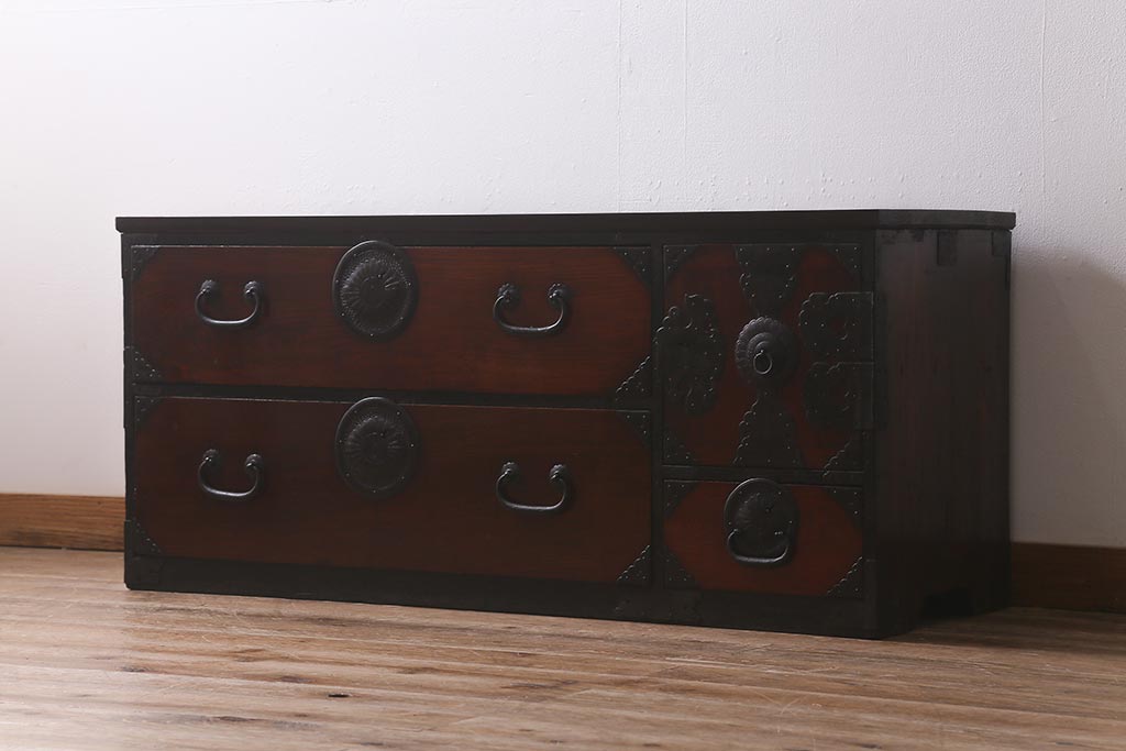 チェスト・引き出し> ローチェスト > アンティーク家具 明治期 天板リメイク 前面欅(ケヤキ)材 凝った金具の意匠が目を引く箪笥ローボード(衣装箪笥、チェスト、引き出し、リビングボード)(R-042633)