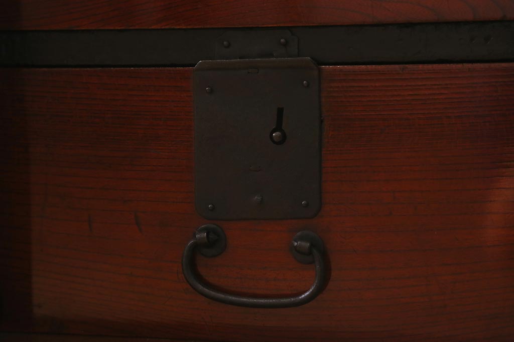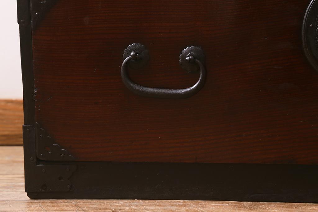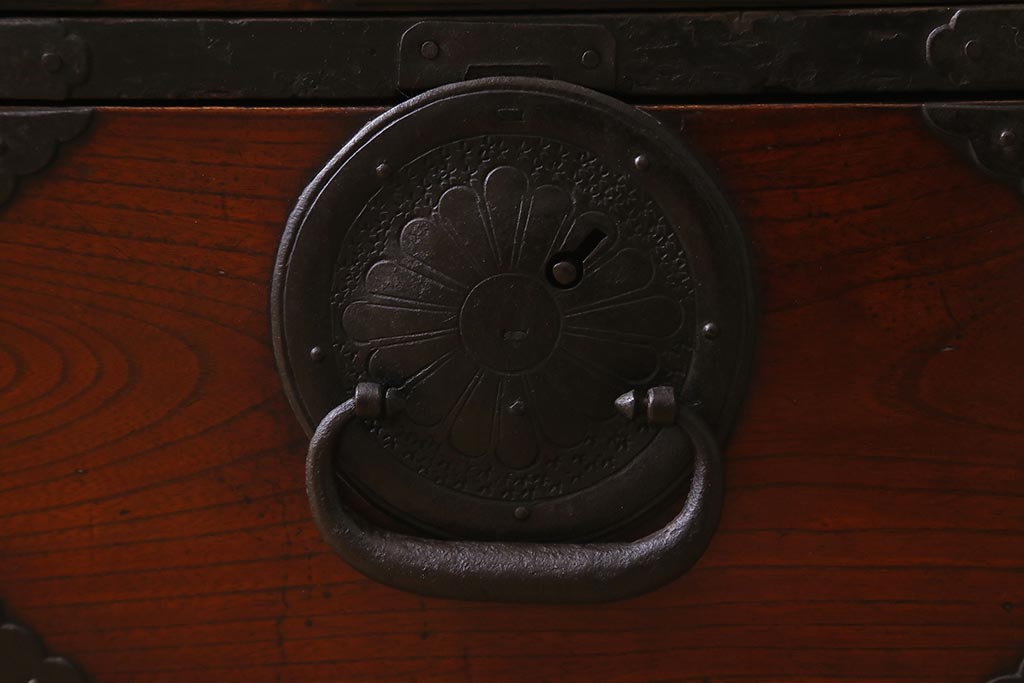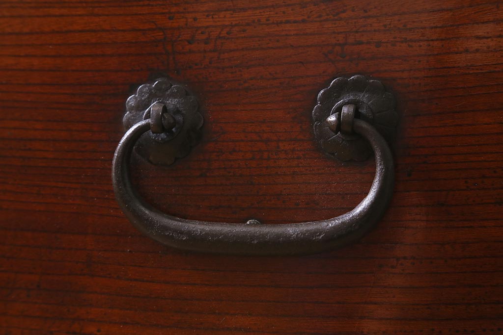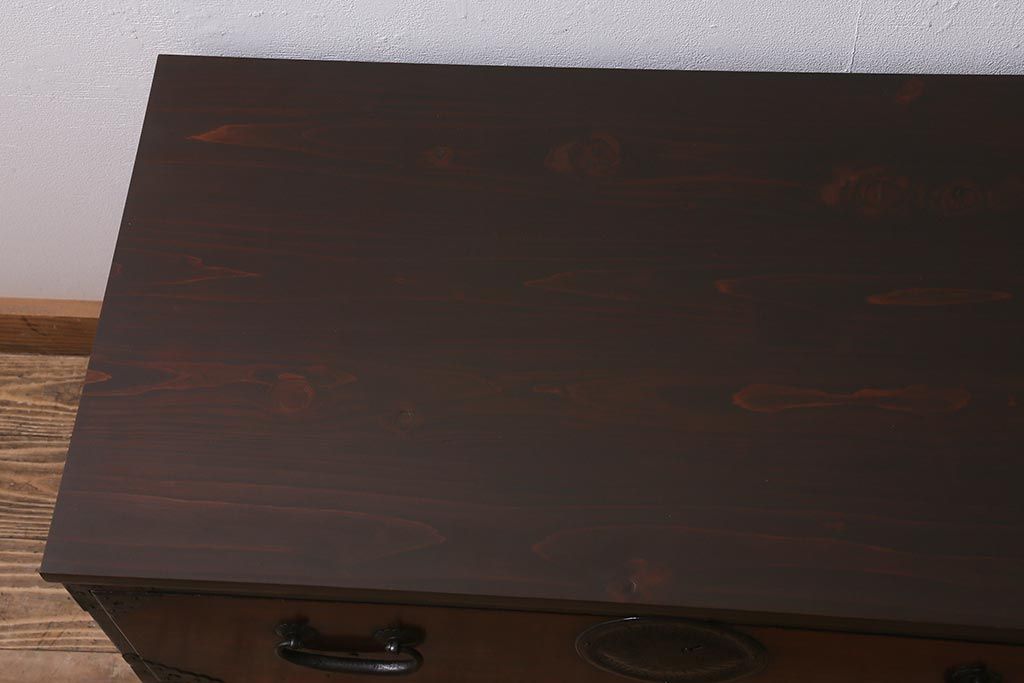 チェスト・引き出し> ローチェスト > アンティーク家具 明治期 天板リメイク 前面欅(ケヤキ)材 凝った金具の意匠が目を引く箪笥ローボード(衣装箪笥、チェスト、引き出し、リビングボード)(R-042633)
