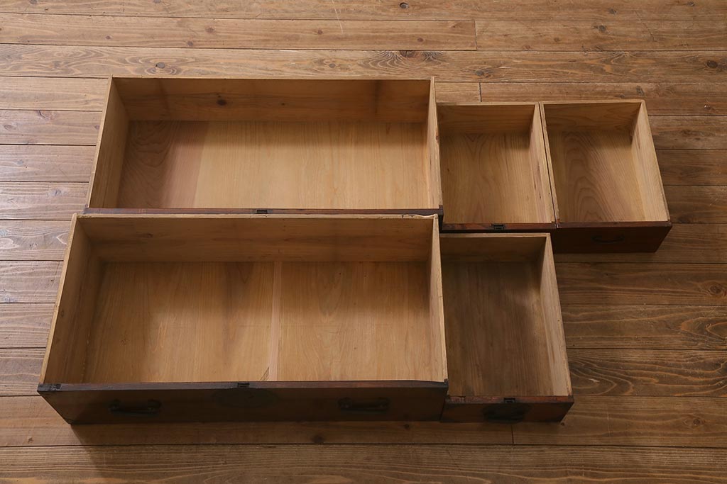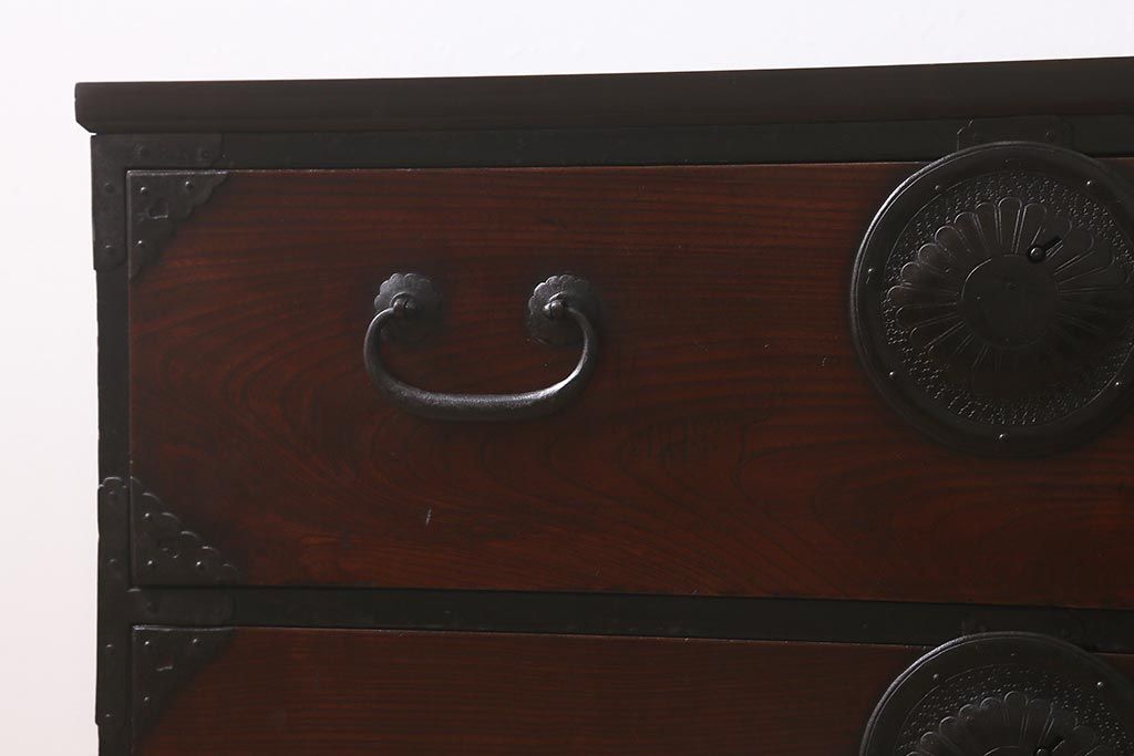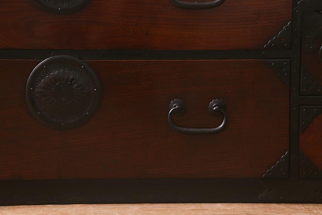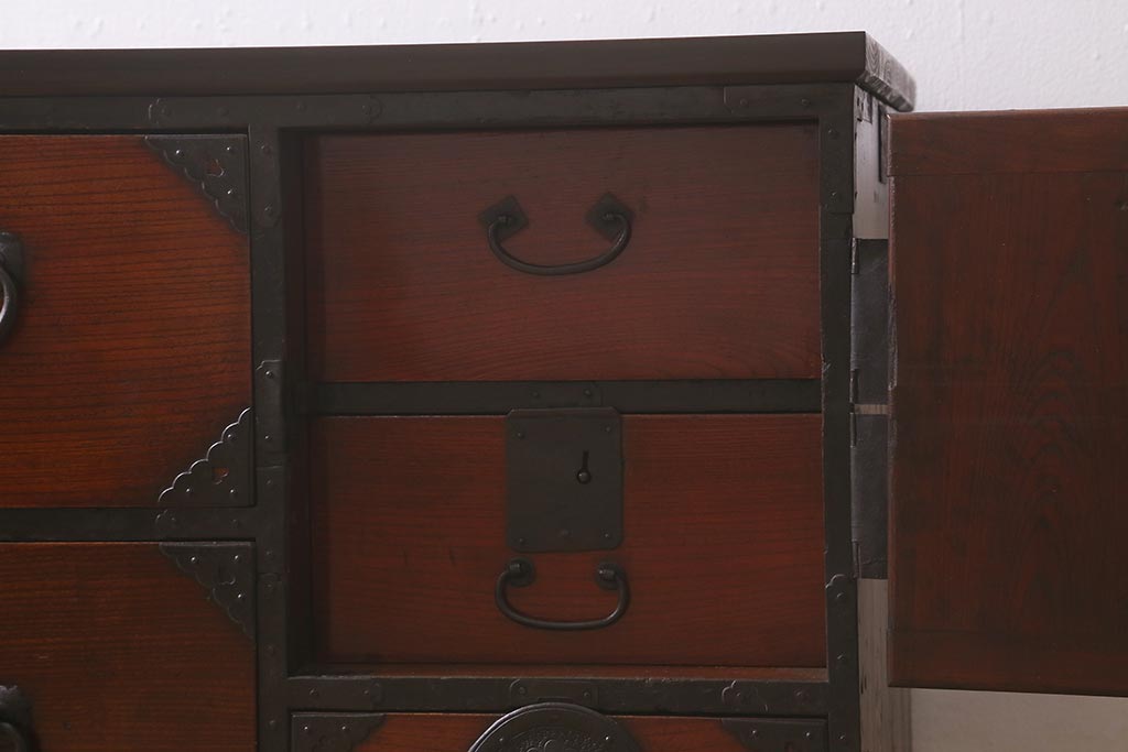 和箪笥 > アンティーク家具 明治期 天板リメイク 前面欅(ケヤキ)材 凝った金具の意匠が目を引く箪笥ローボード(衣装箪笥、チェスト、引き出し、リビングボード)(R-042633)