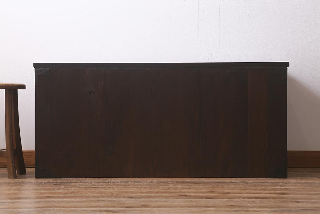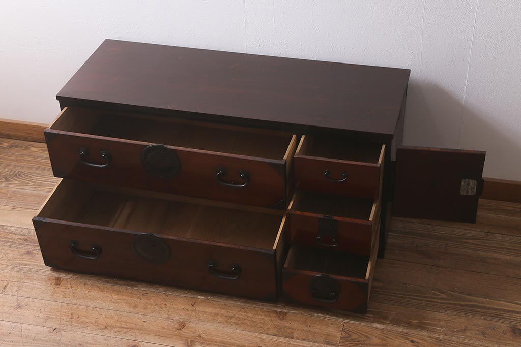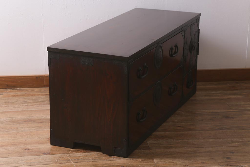 キャビネット・戸棚> テレビ台・ローボード > アンティーク家具 明治期 天板リメイク 前面欅(ケヤキ)材 凝った金具の意匠が目を引く箪笥ローボード(衣装箪笥、チェスト、引き出し、リビングボード)(R-042633)