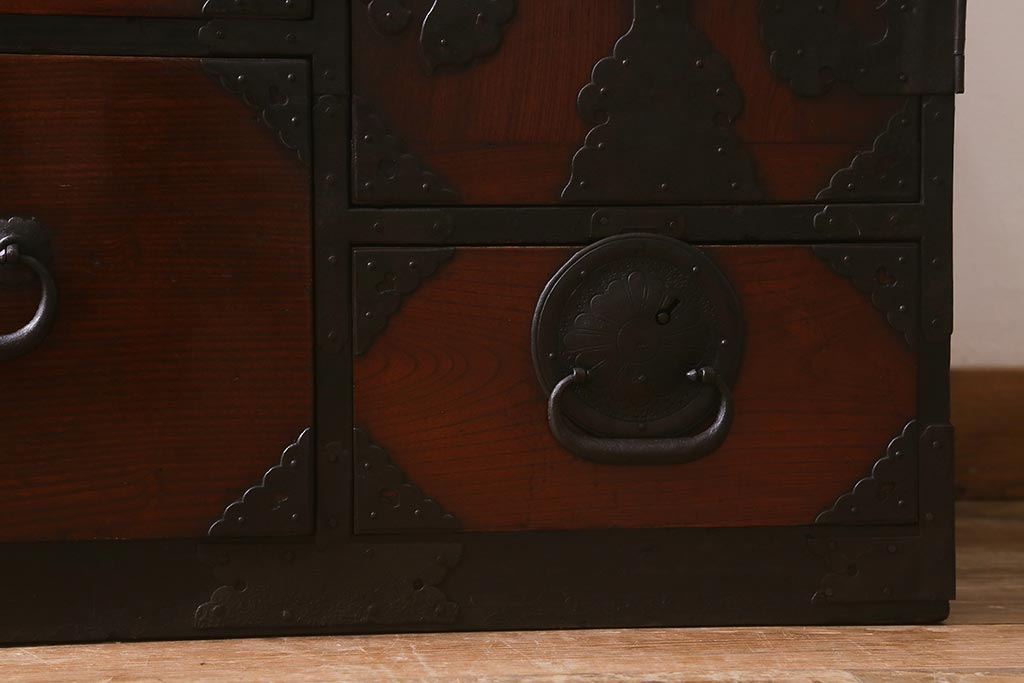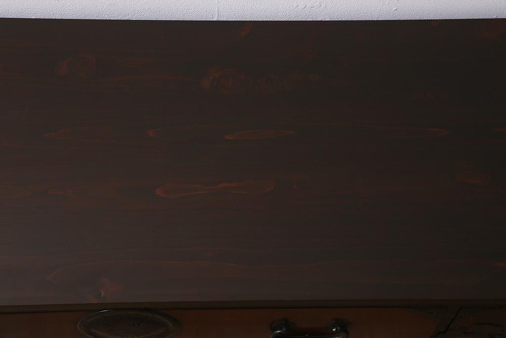 アンティーク家具 明治期 天板リメイク 前面欅(ケヤキ)材 凝った金具の意匠が目を引く箪笥ローボード(衣装箪笥、チェスト、引き出し、リビングボード)(R-042633)
