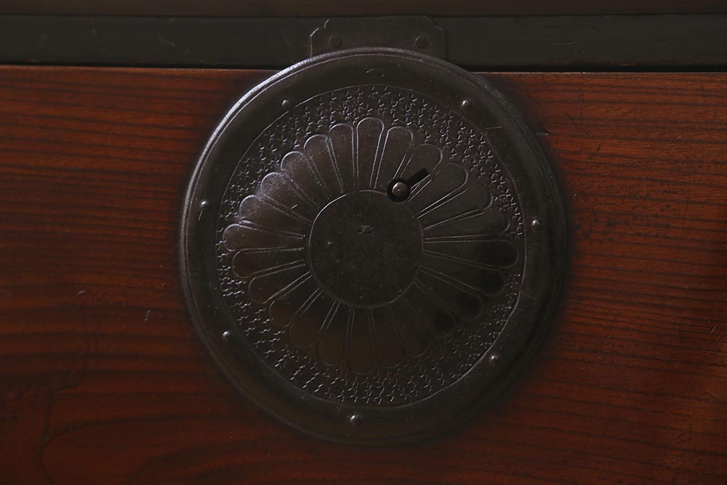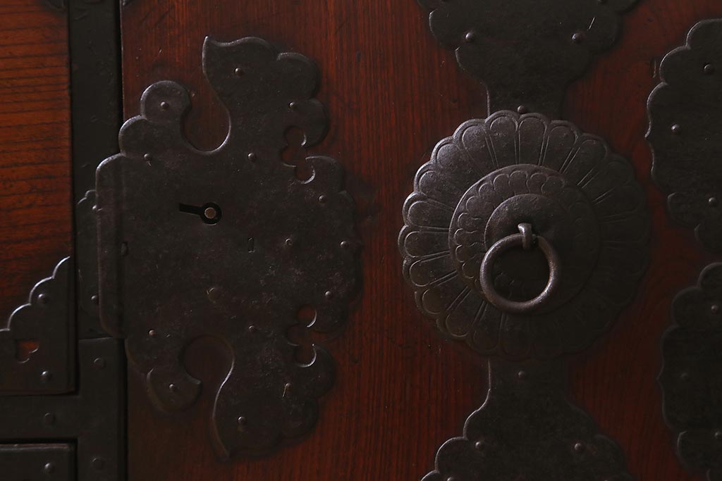 和箪笥> 衣装箪笥 > アンティーク家具 明治期 天板リメイク 前面欅(ケヤキ)材 凝った金具の意匠が目を引く箪笥ローボード(衣装箪笥、チェスト、引き出し、リビングボード)(R-042633)