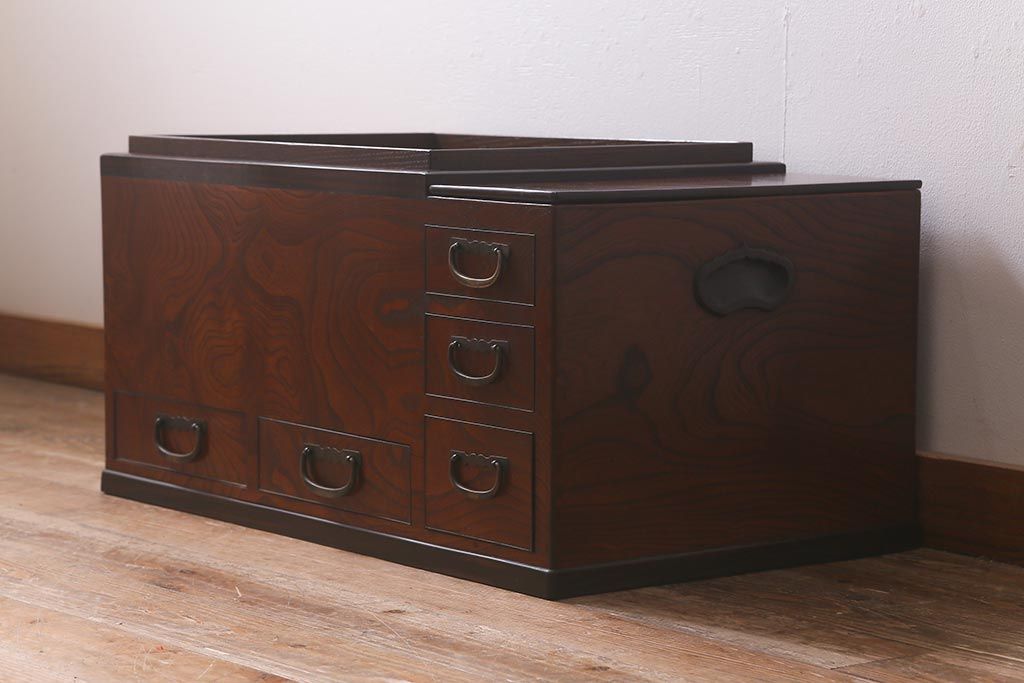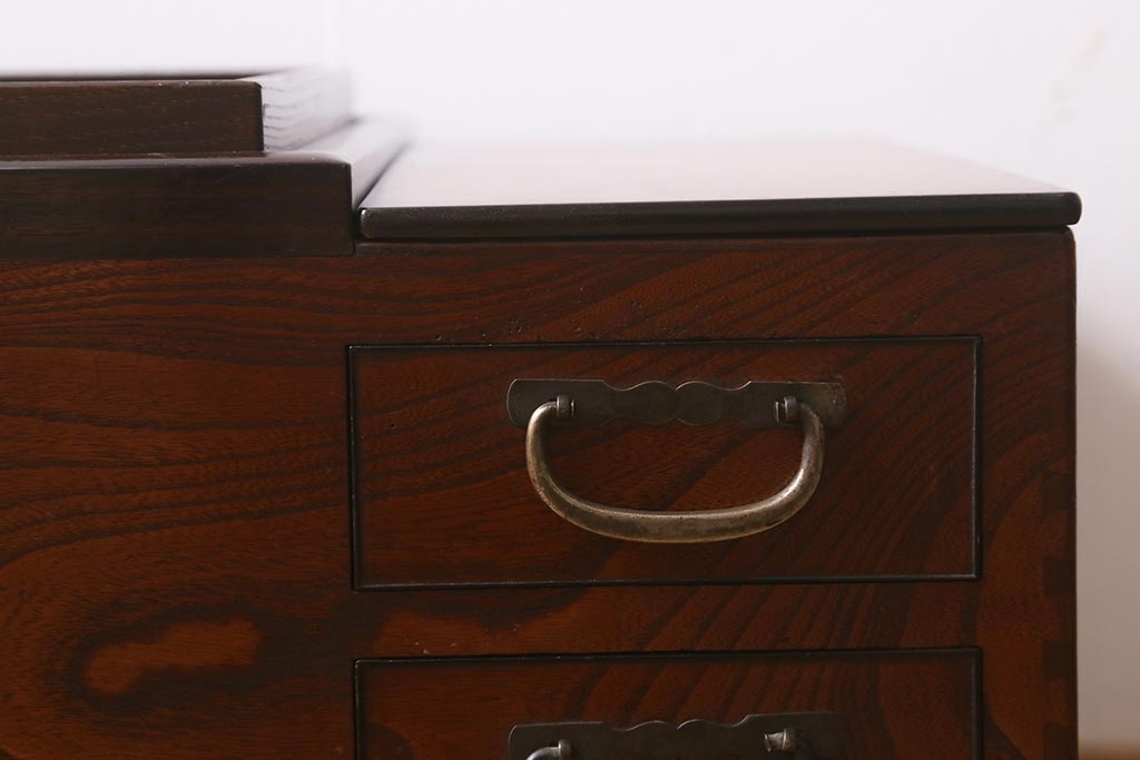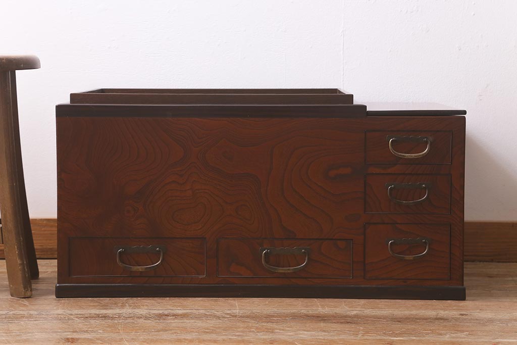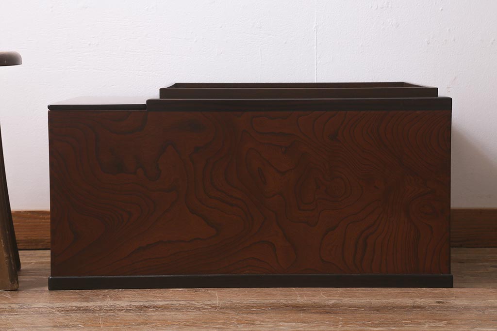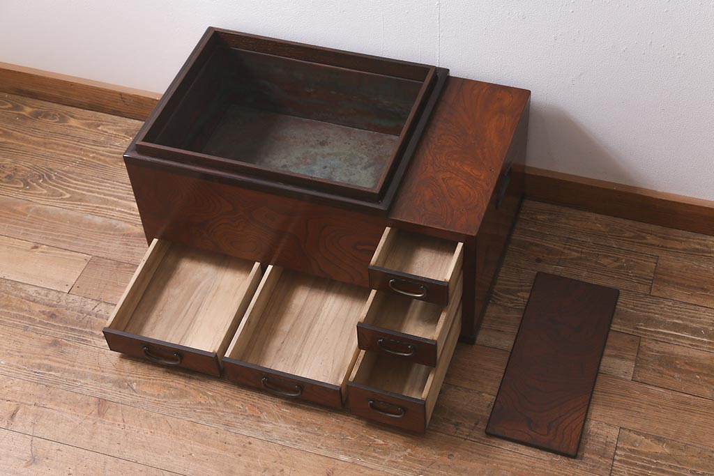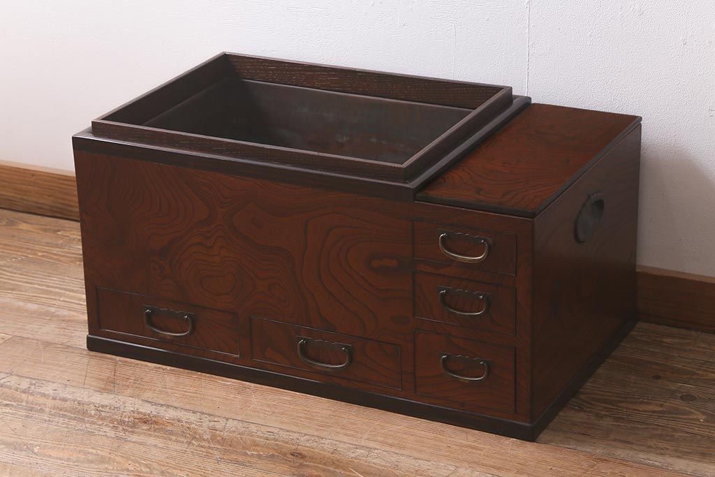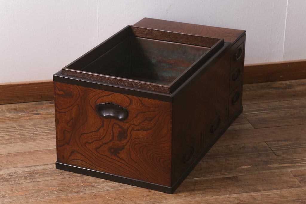 火鉢> 木製火鉢 > アンティーク雑貨 和製アンティーク 欅材 猫板付き 上質な和の空間を演出する長火鉢(木製火鉢)(R-042853)