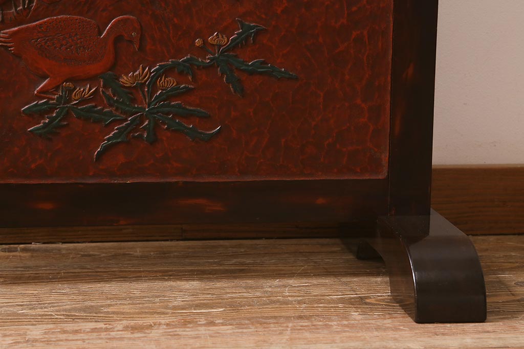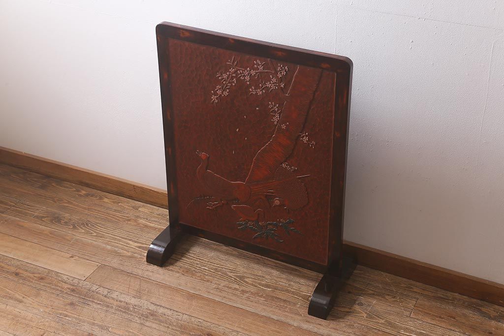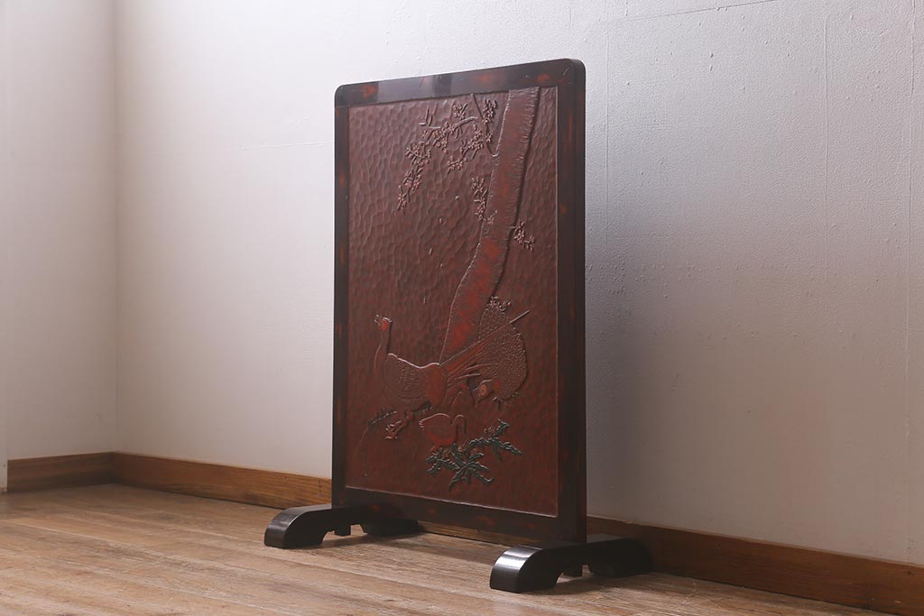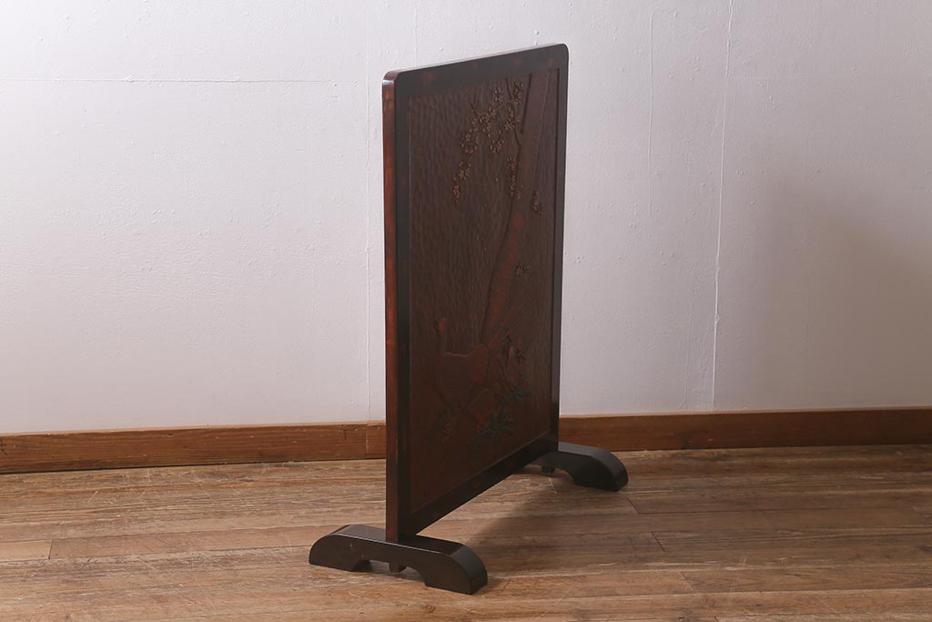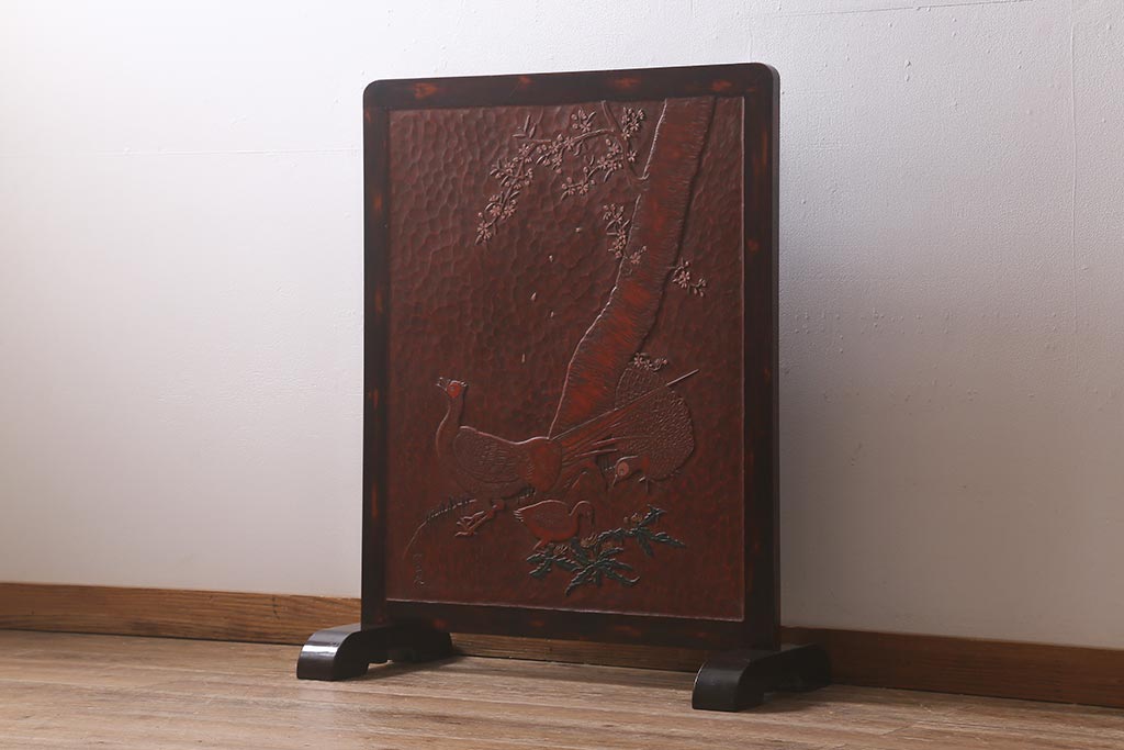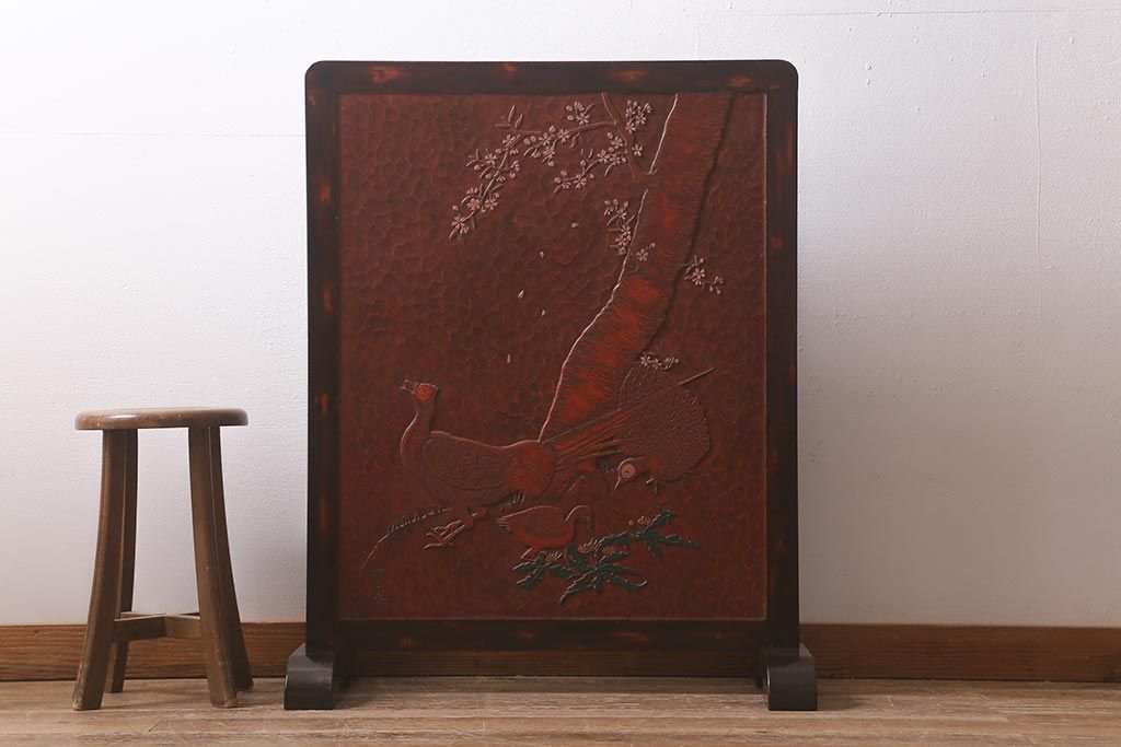 中古 伝統工芸 鎌倉彫り 桜・雉(キジ) 衝立(パーテーション、つい立て)(R-042641)