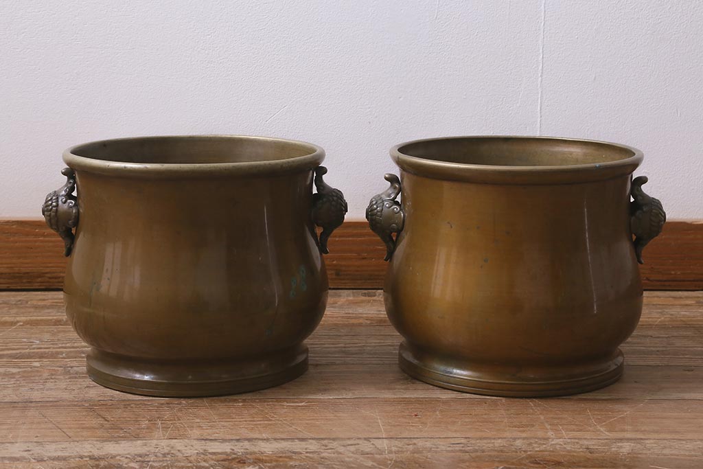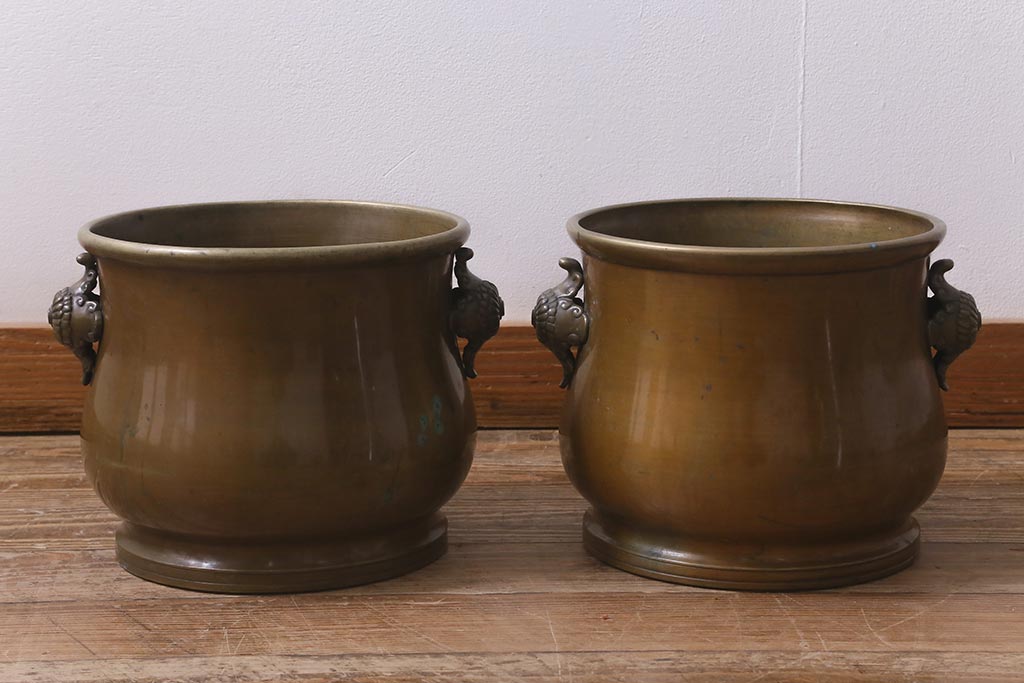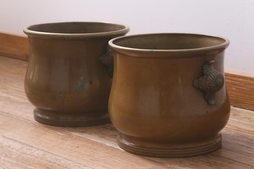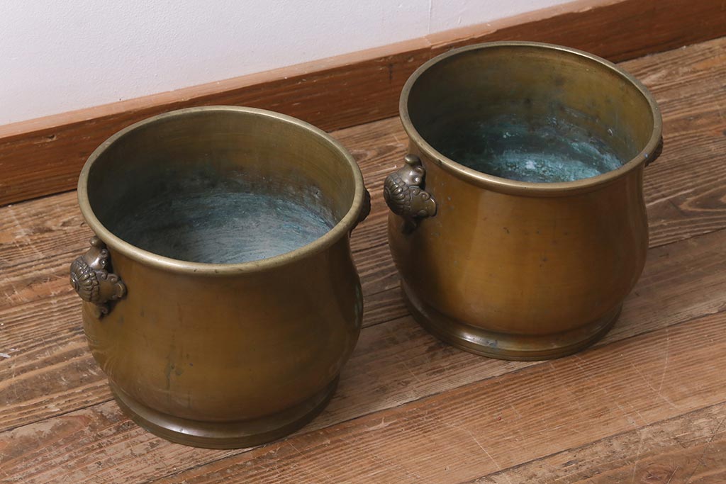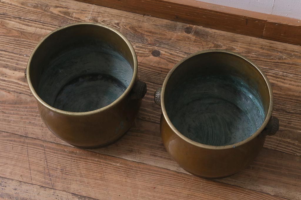 アンティーク雑貨 取っ手がおしゃれな真鍮火鉢一対(手あぶり、金属火鉢)(R-042571)です。