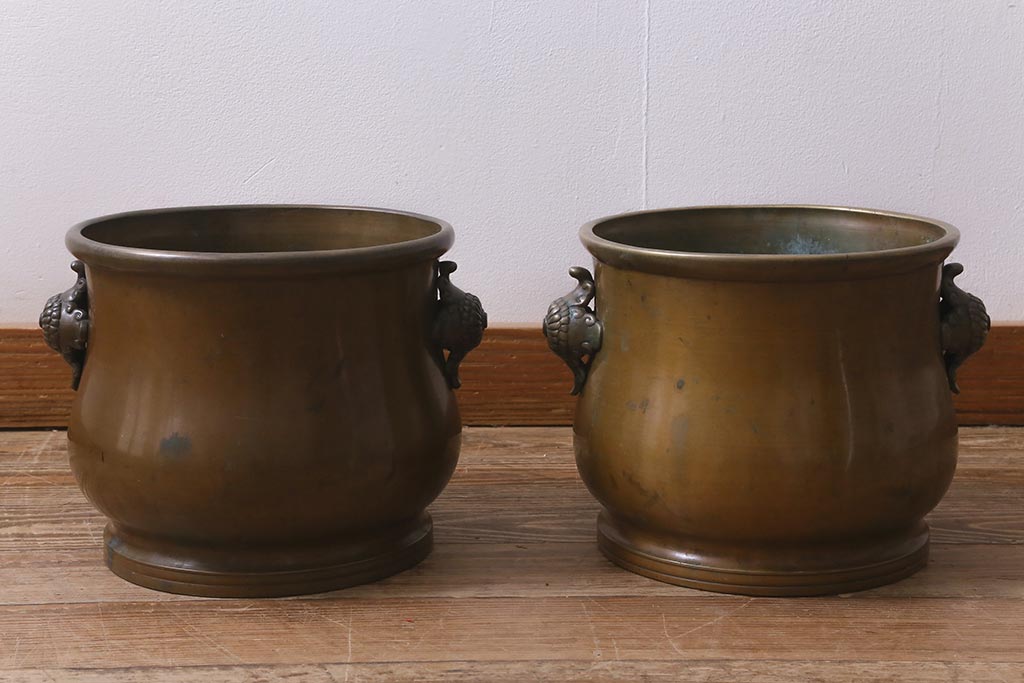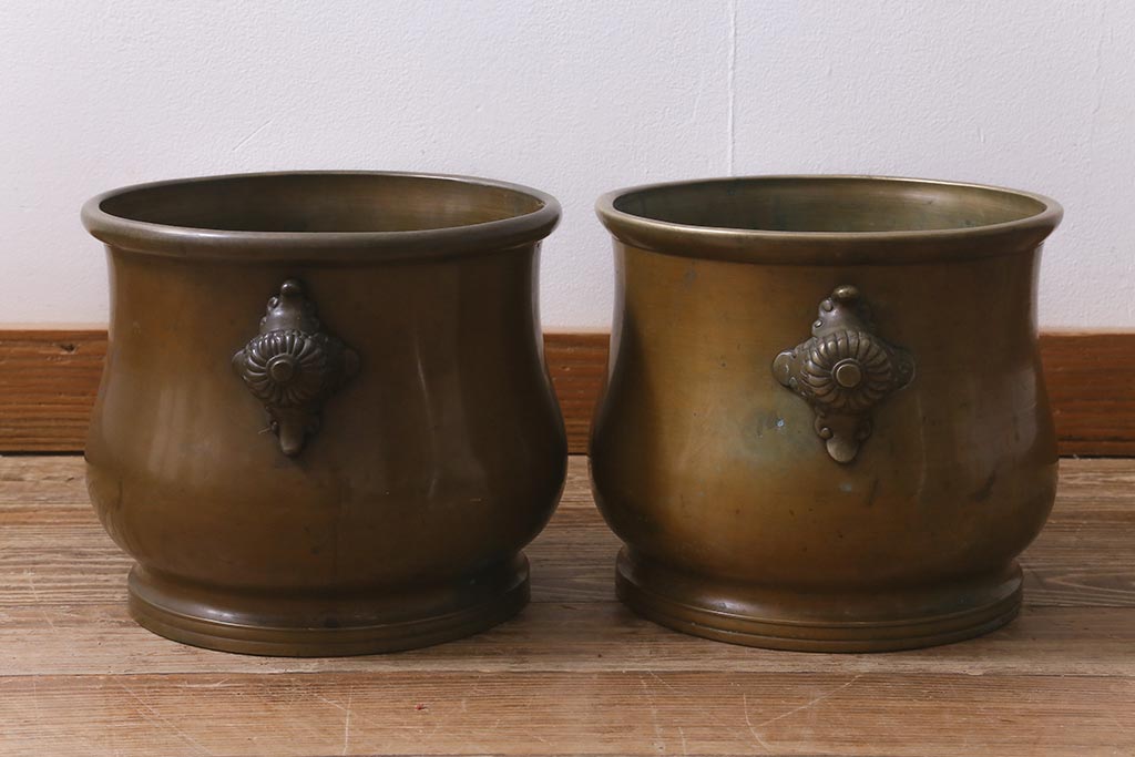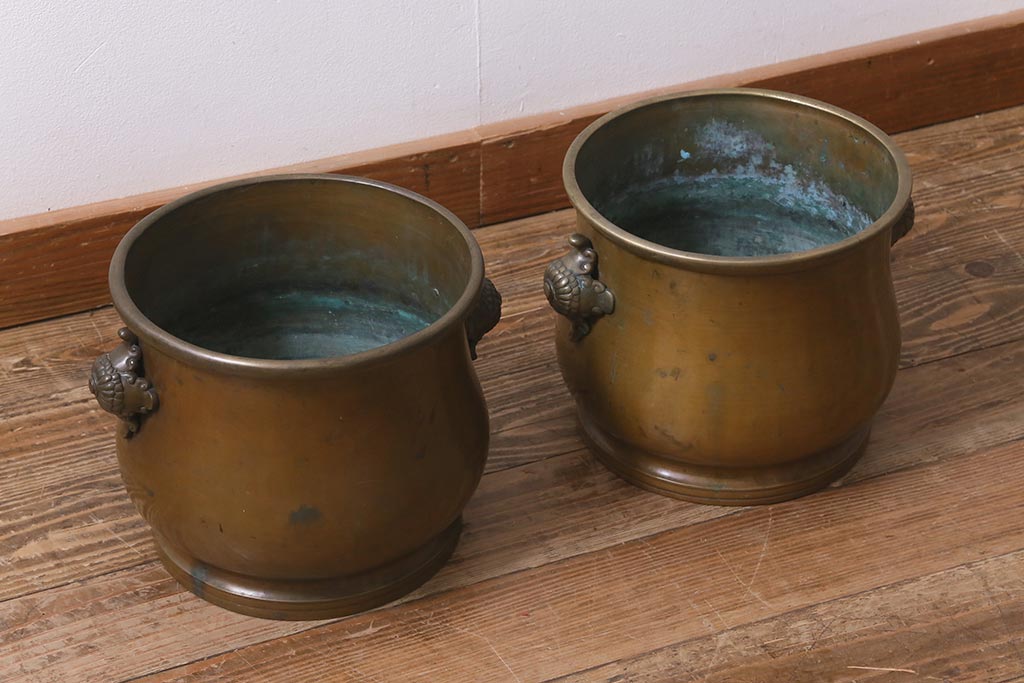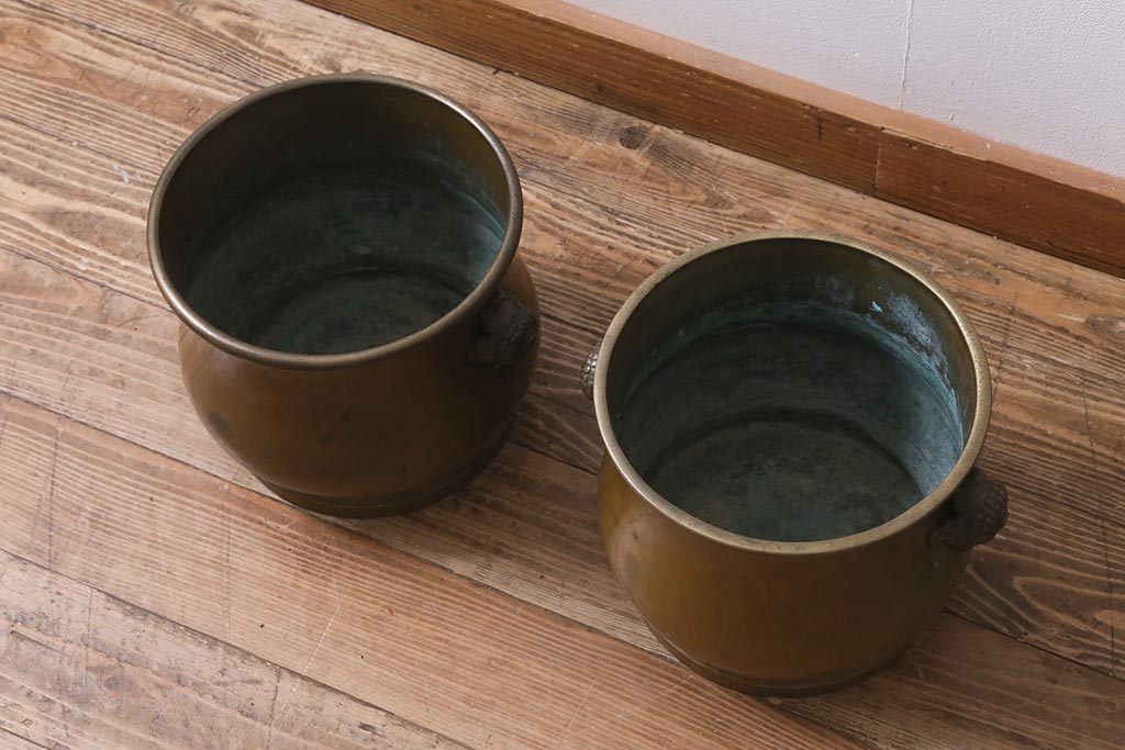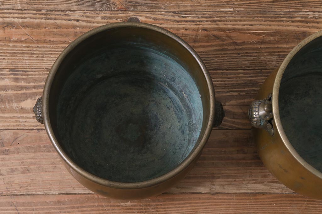 アンティーク雑貨 取っ手がおしゃれな真鍮火鉢一対(手あぶり、金属火鉢)(R-042677)です。