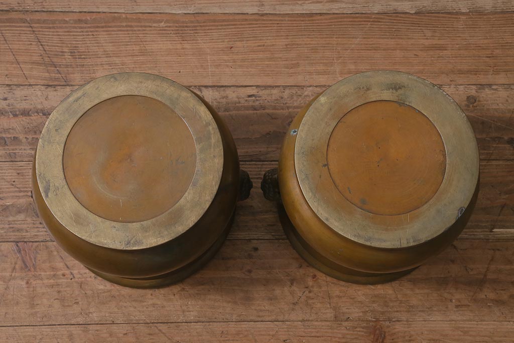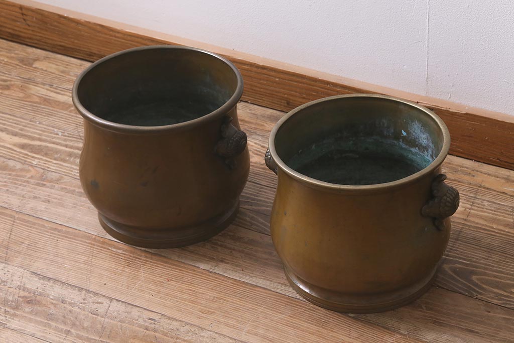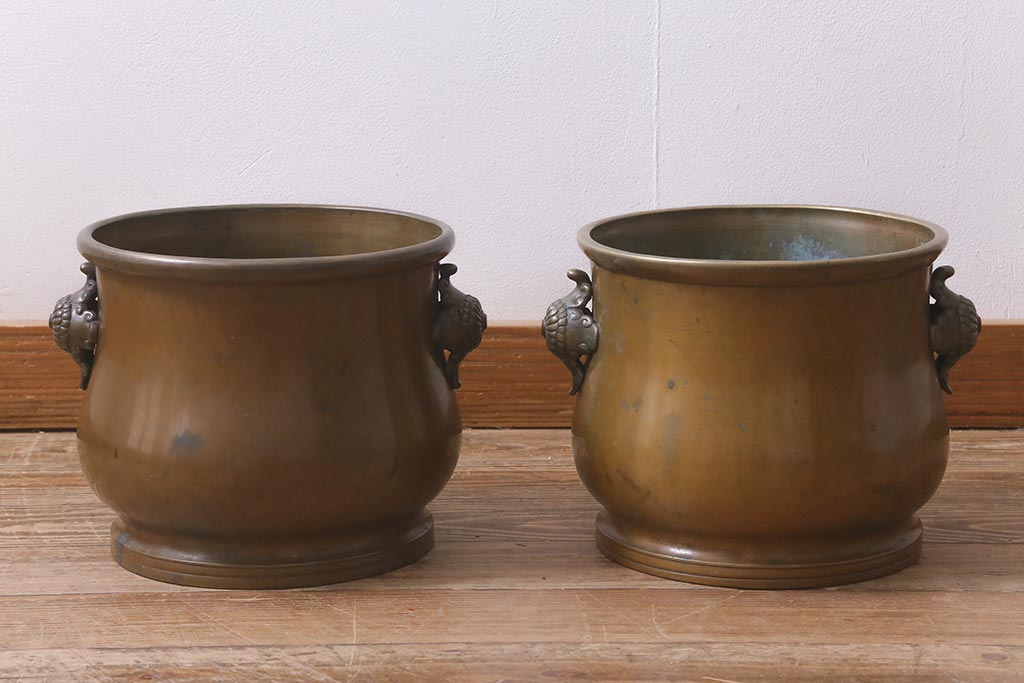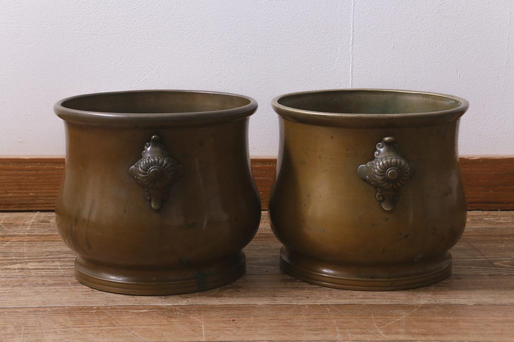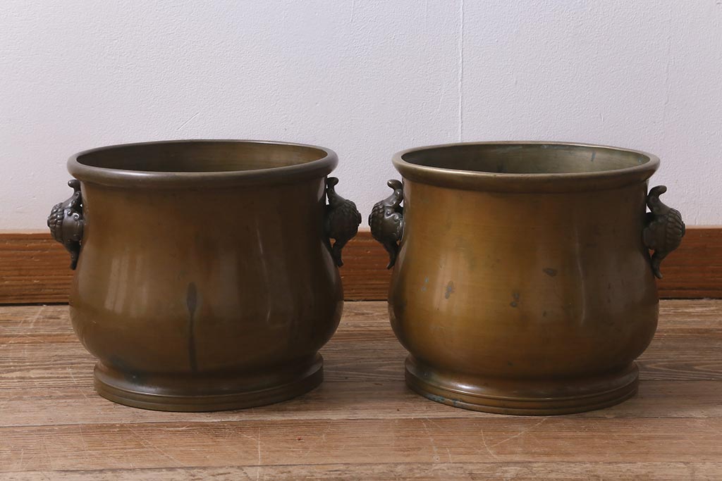 アンティーク雑貨 取っ手がおしゃれな真鍮火鉢一対(手あぶり、金属火鉢)(R-042677)です。