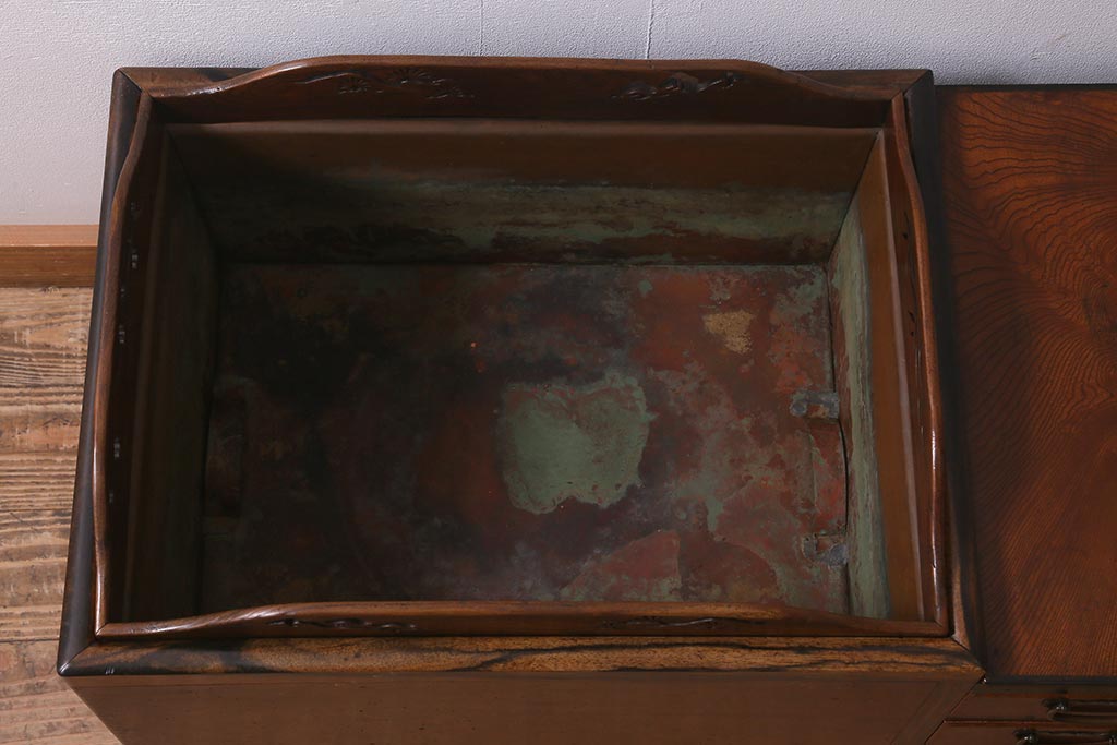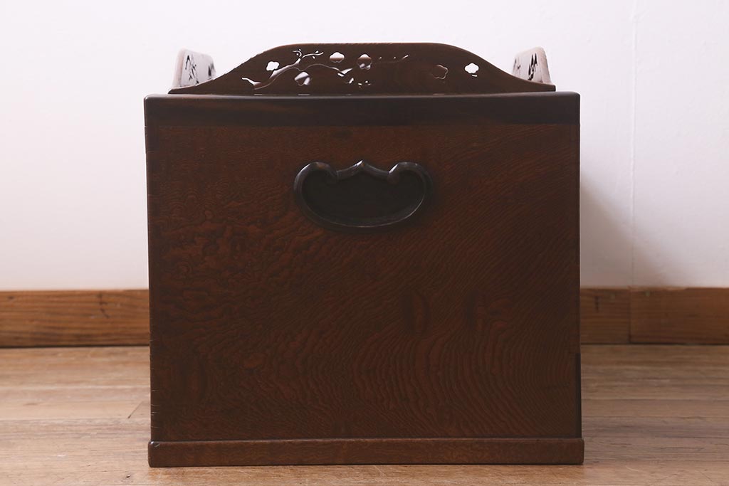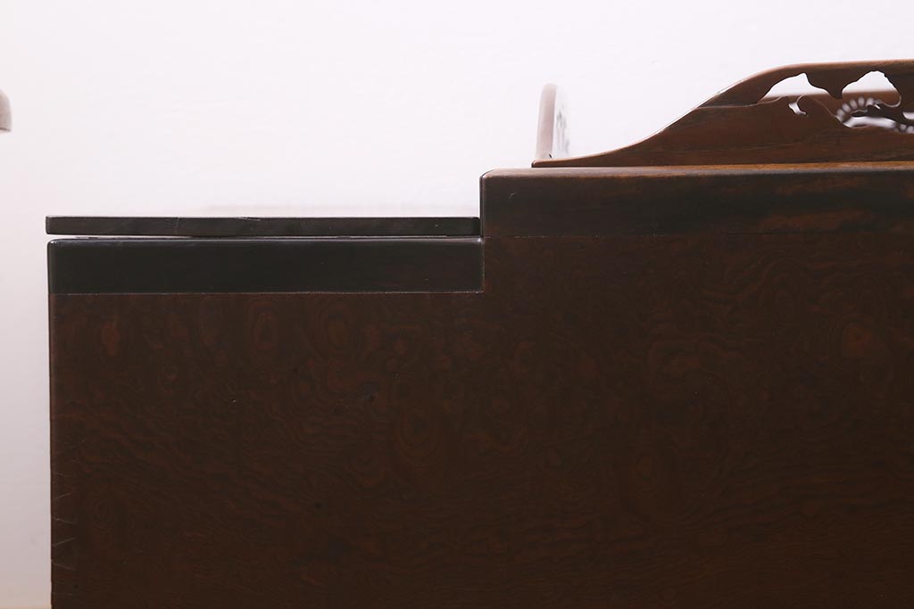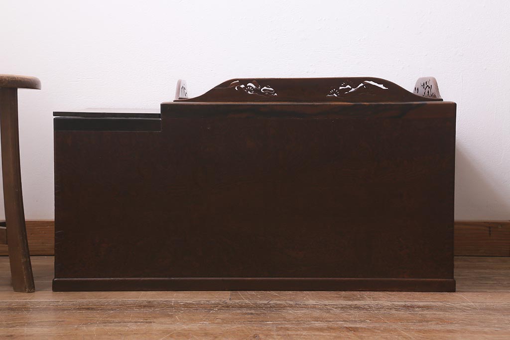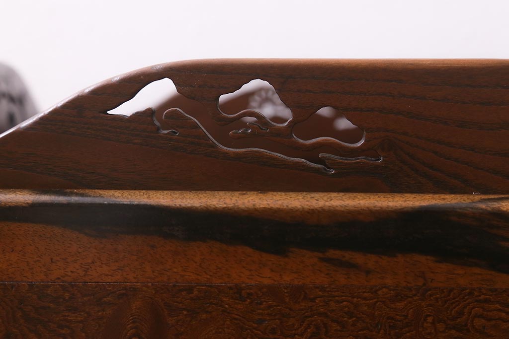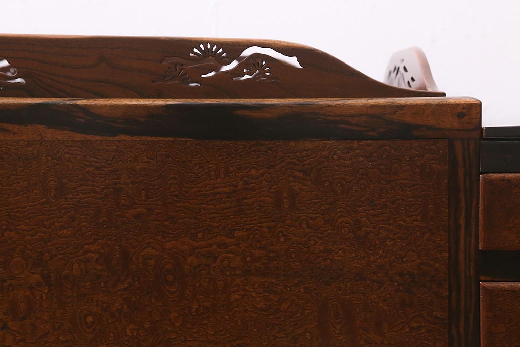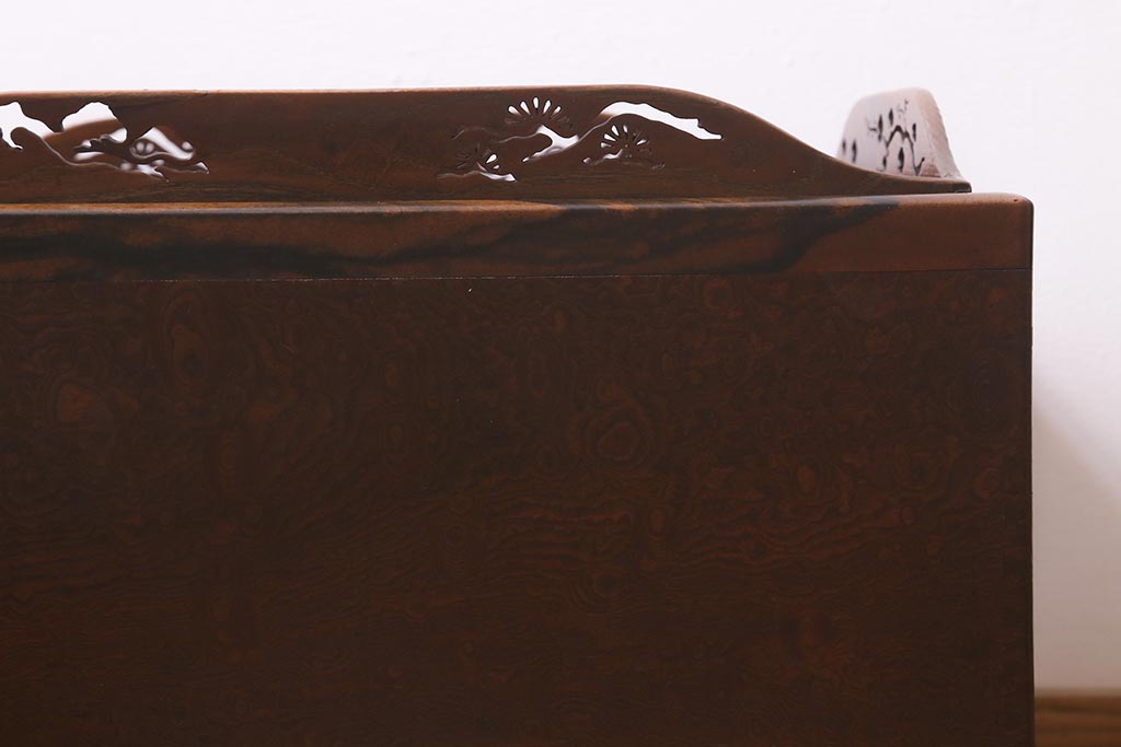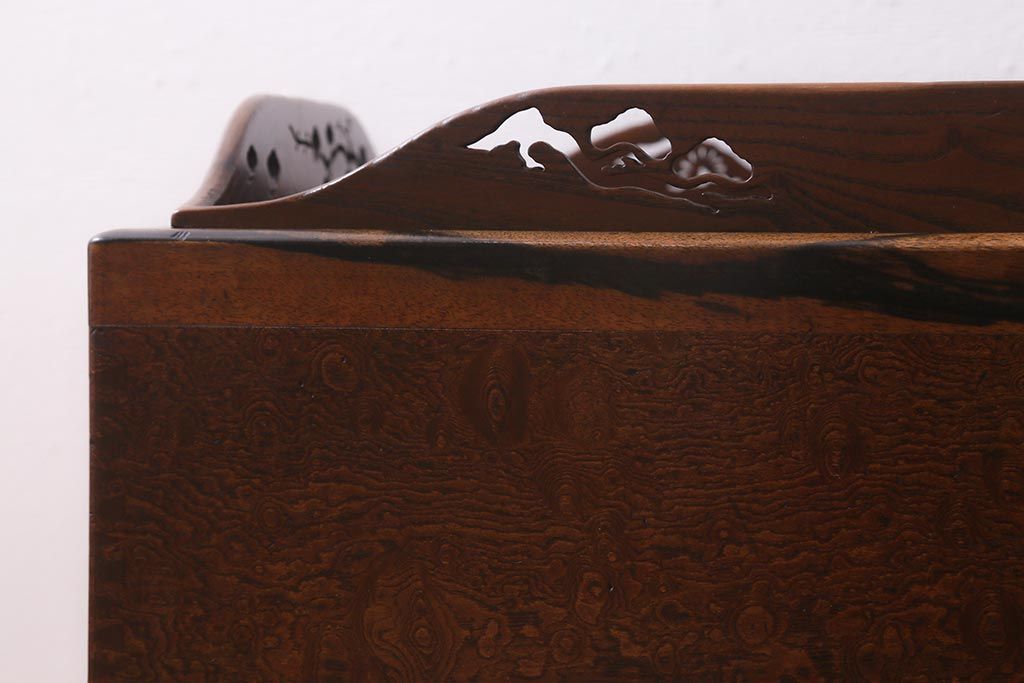 火鉢> 木製火鉢 > アンティーク家具 特注 透かし入り 黒柿・ケヤキ材 玉杢が美しい上手物の長火鉢(木製火鉢)(R-042817)