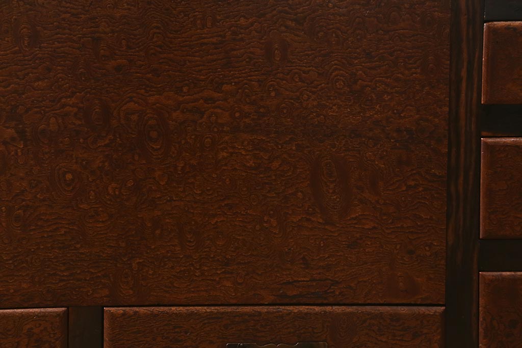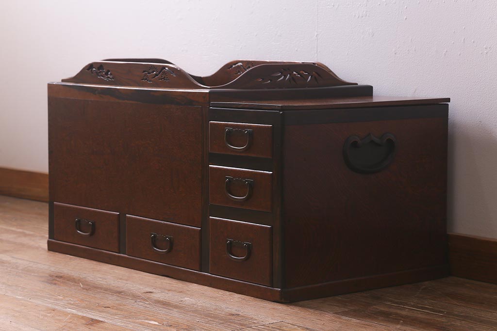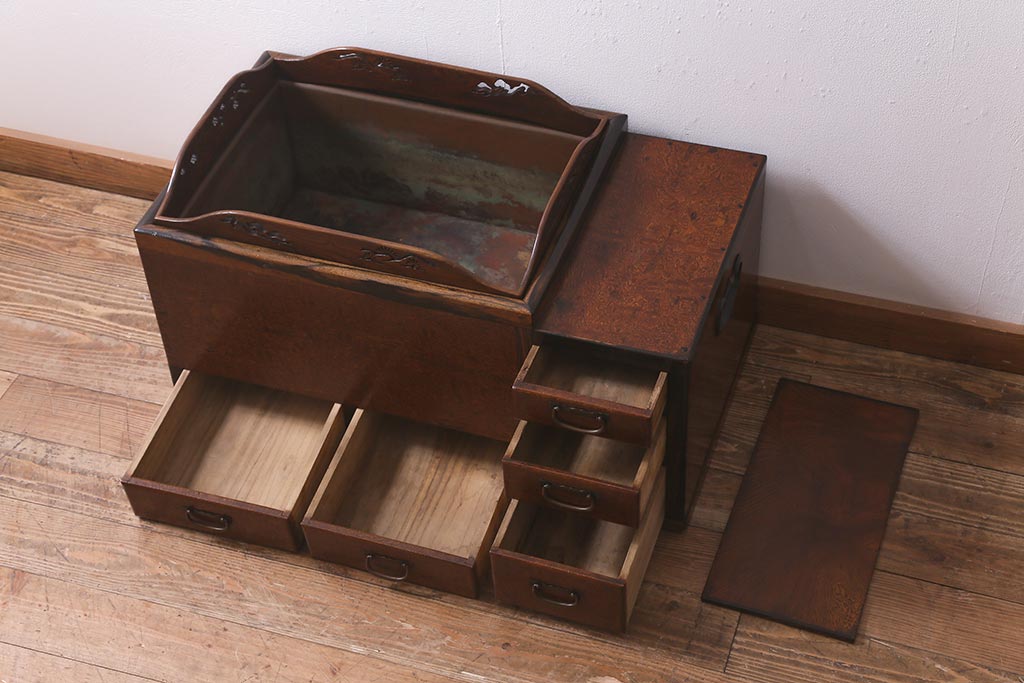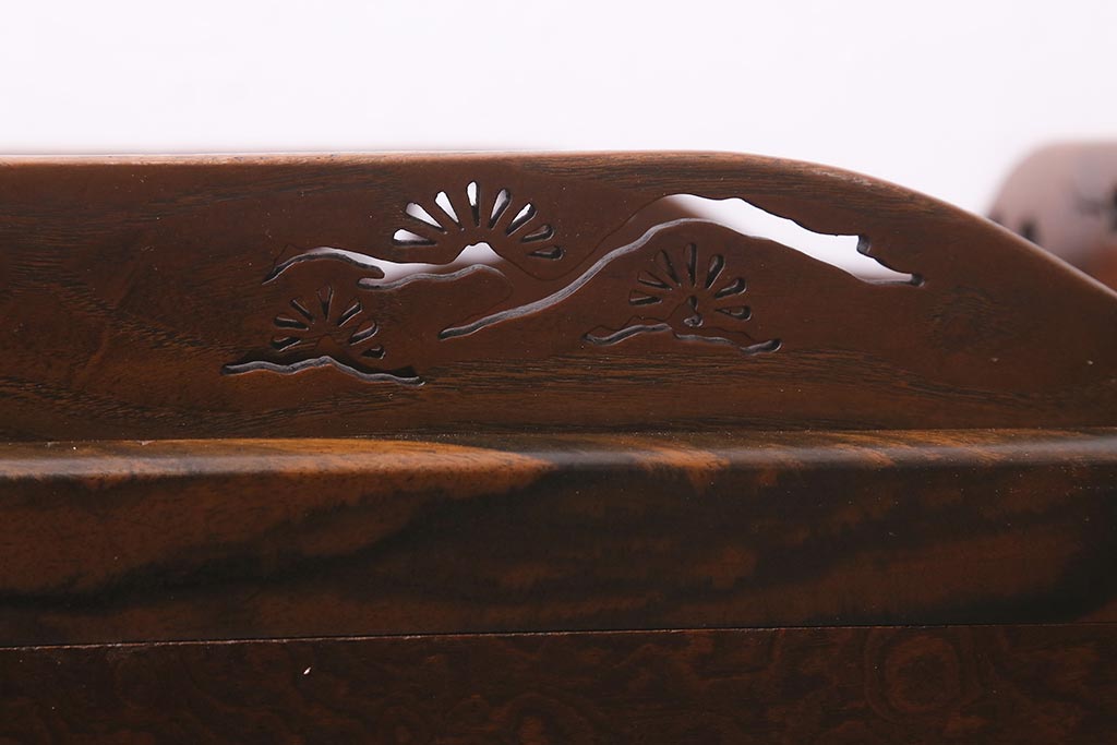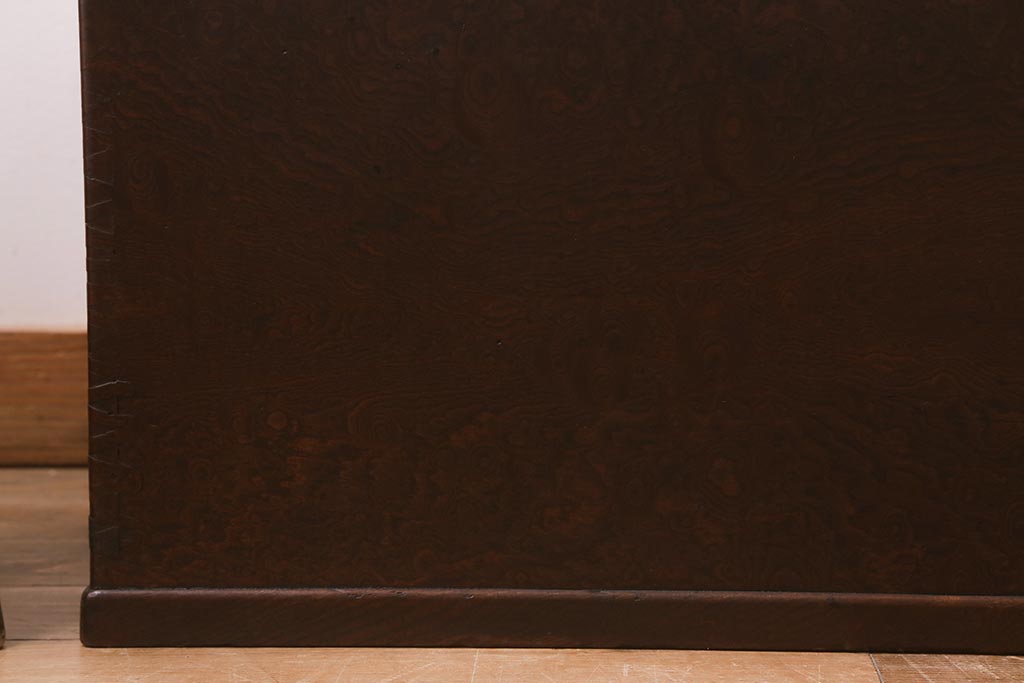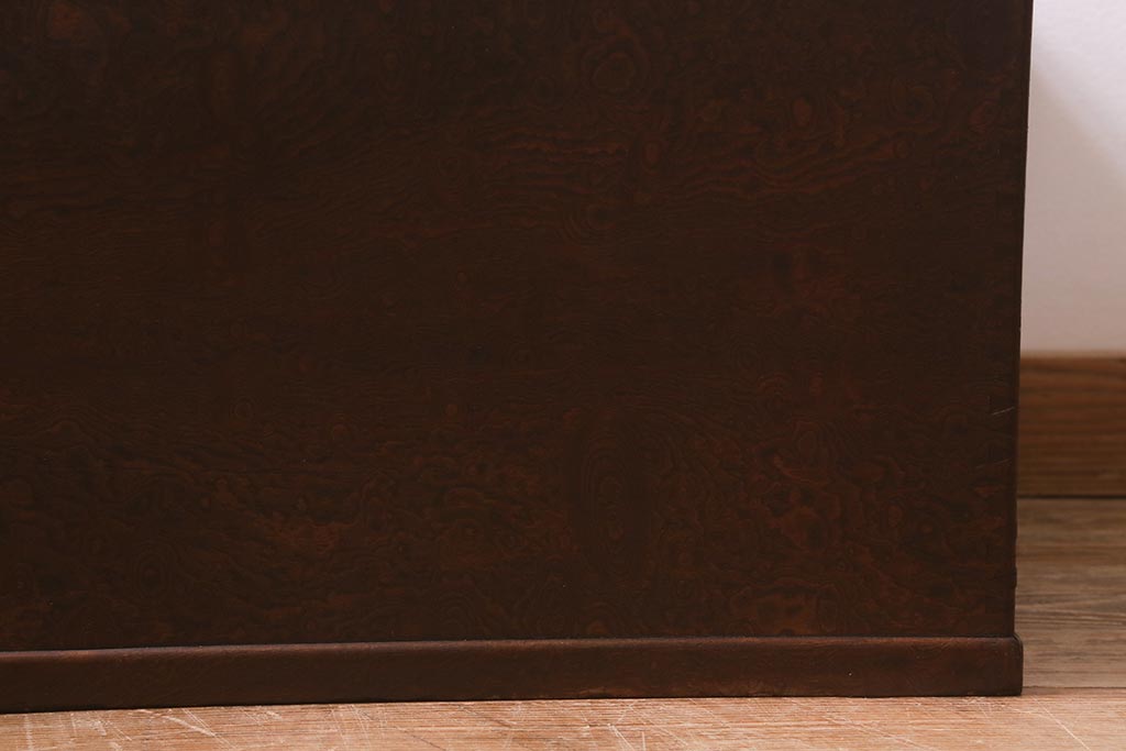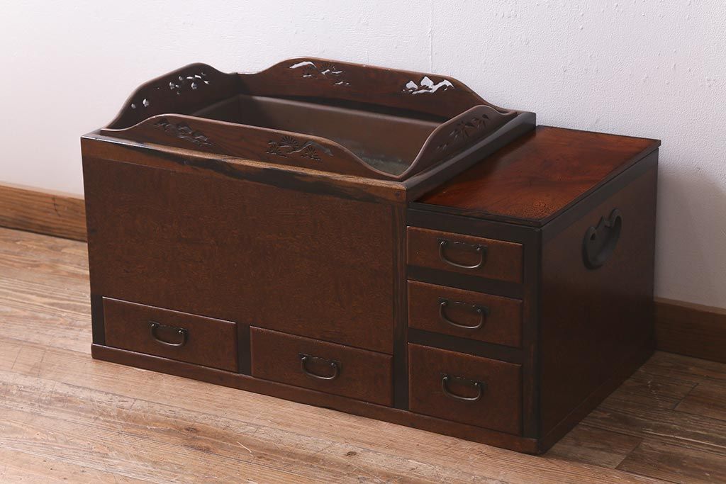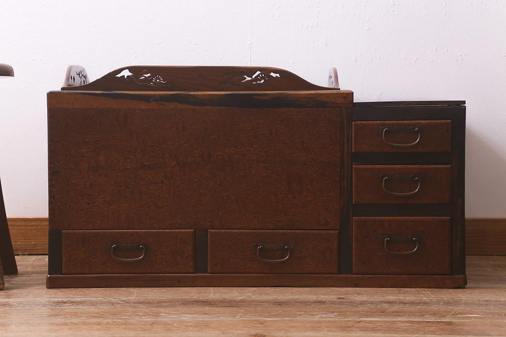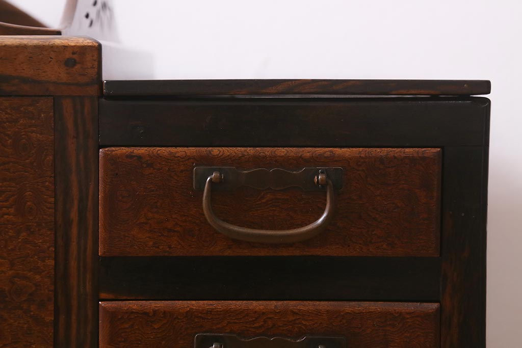 火鉢> 木製火鉢 > アンティーク家具 特注 透かし入り 黒柿・ケヤキ材 玉杢が美しい上手物の長火鉢(木製火鉢)(R-042817)
