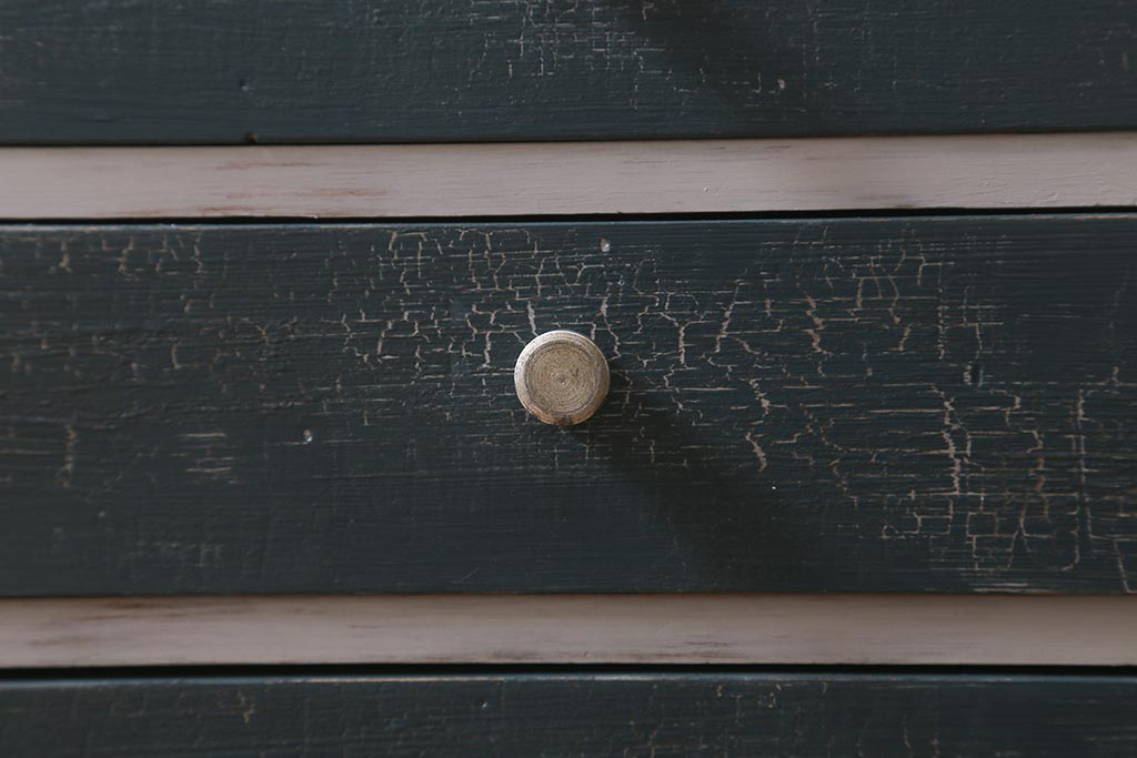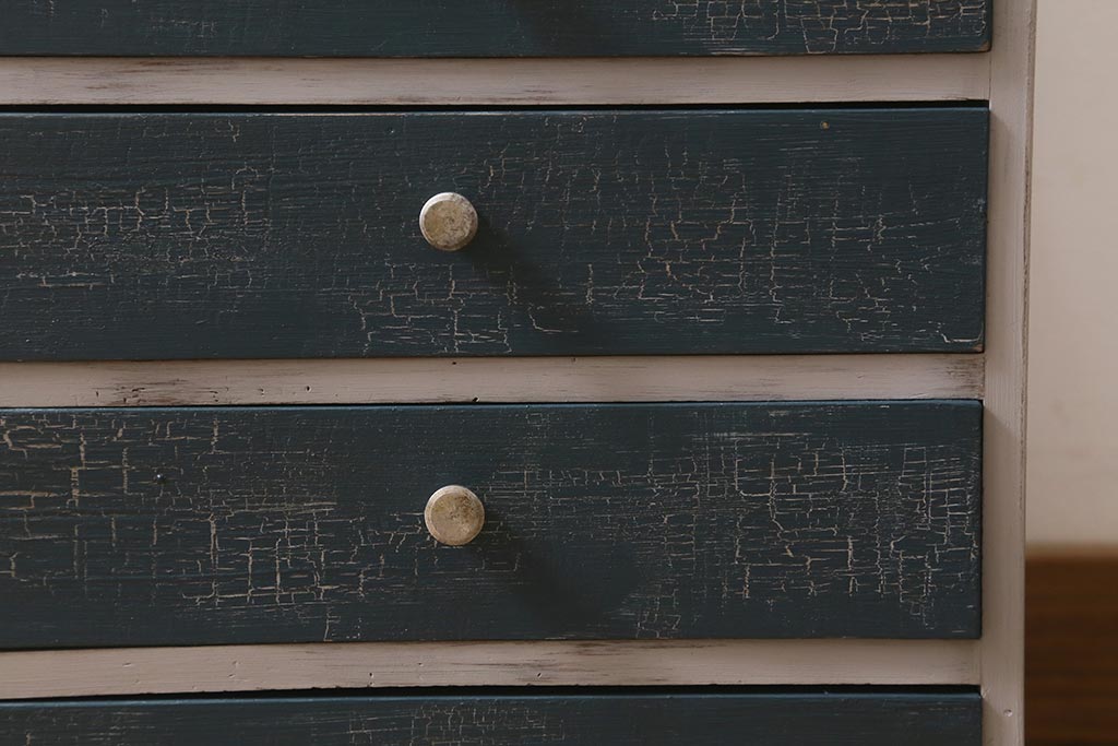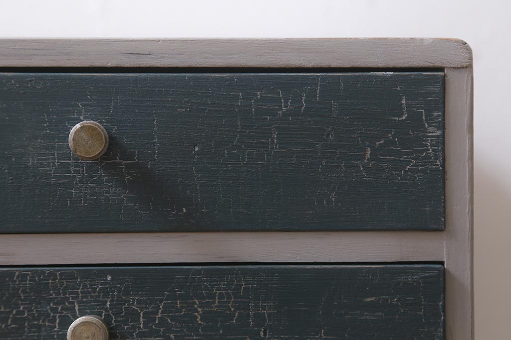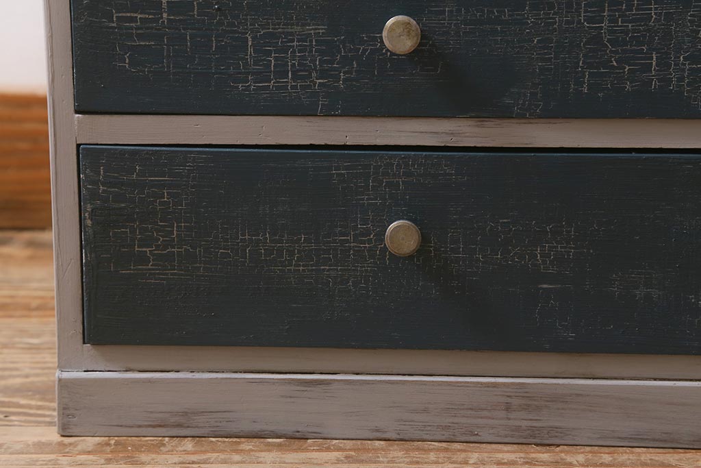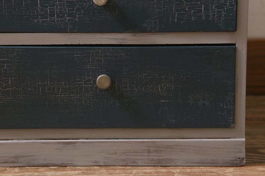 ペイントカラーは本体:グレー(エイジング加工)、引き出し:ネイビー(クラック加工)です。画面環境によって実際の商品と多少色味が異なる場合がございます。ご理解の上お願いします。
