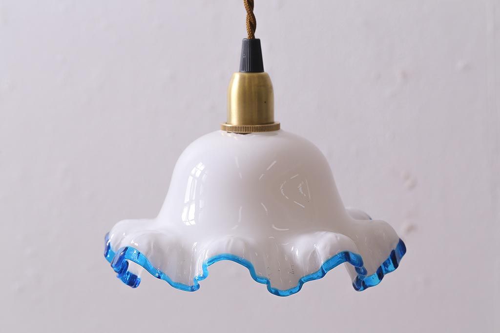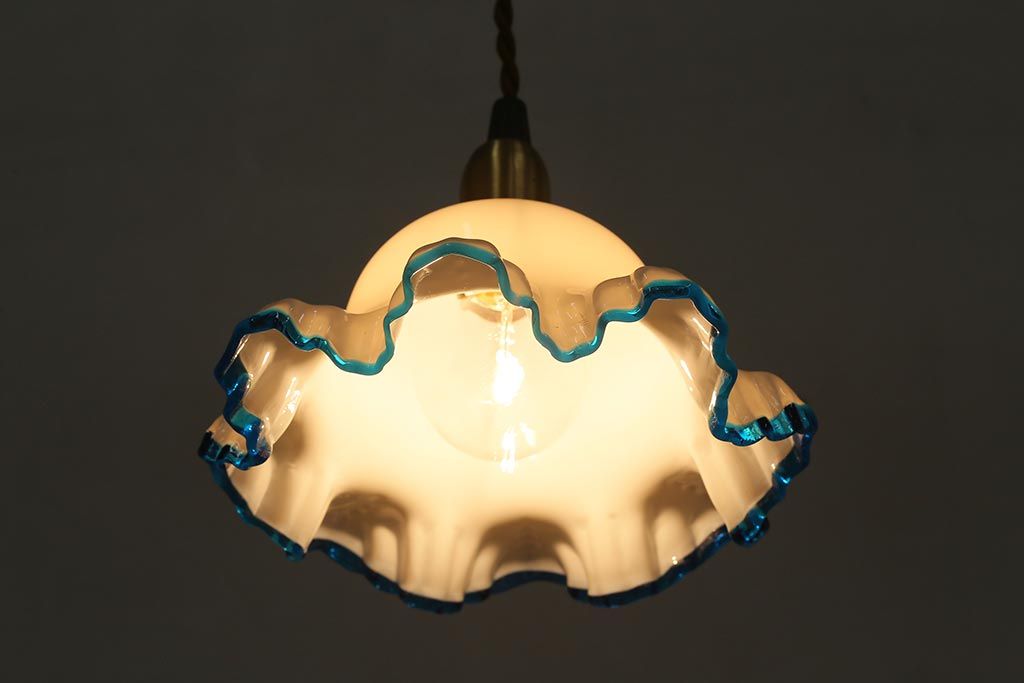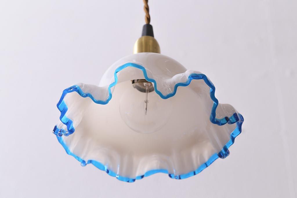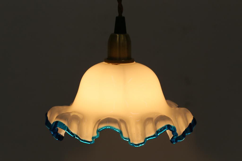 ヴィンテージ照明 イギリスビンテージ 青い縁のフリルが爽やかなミルクガラスペンダントライト(ランプシェード、天井照明)(R-043000)
