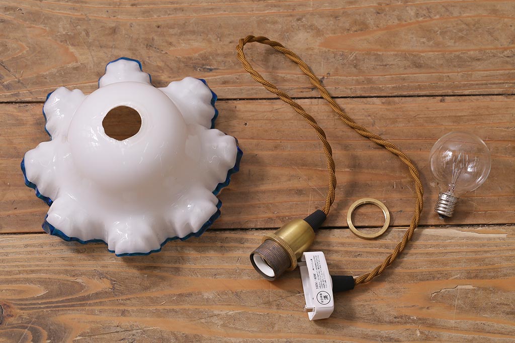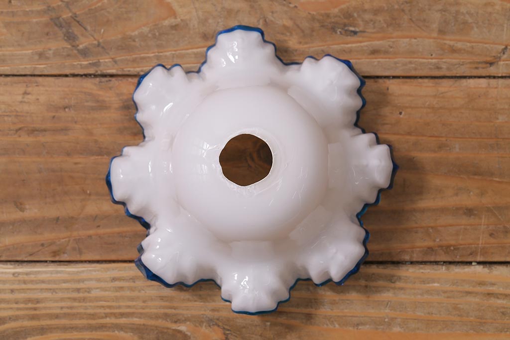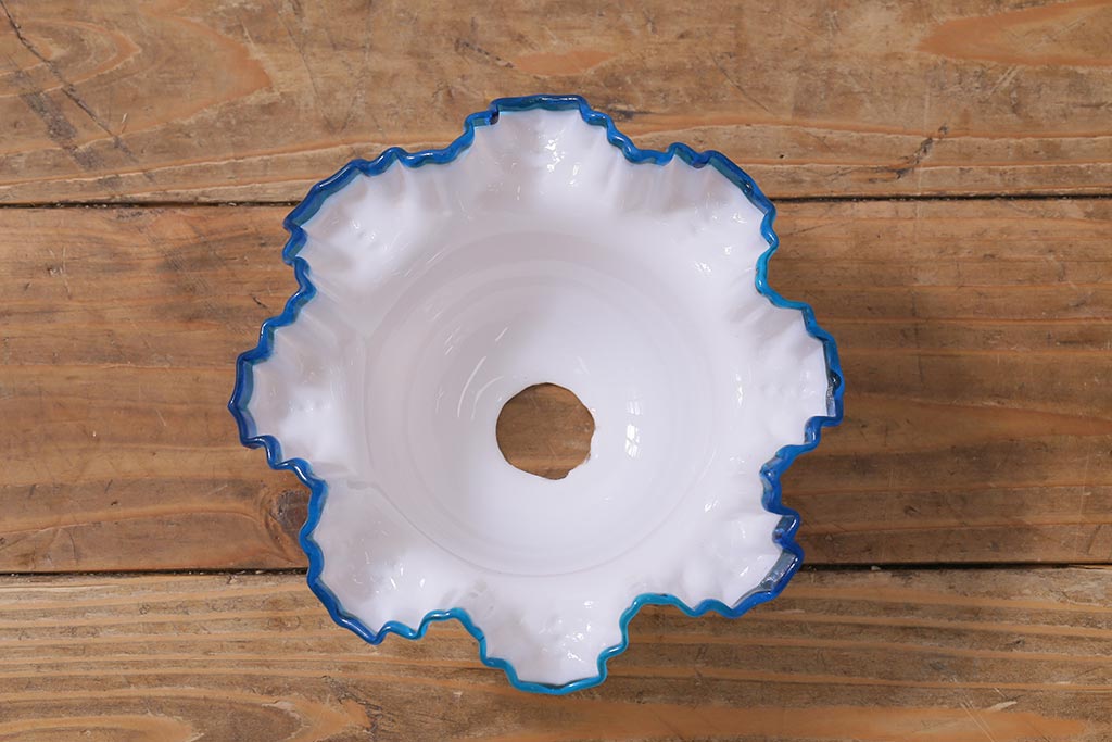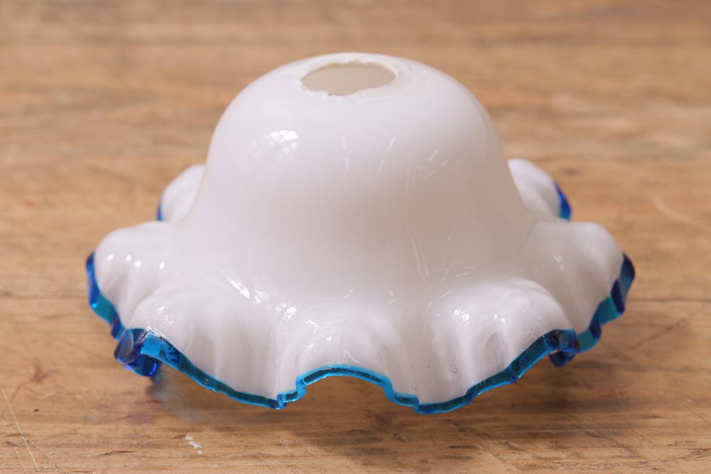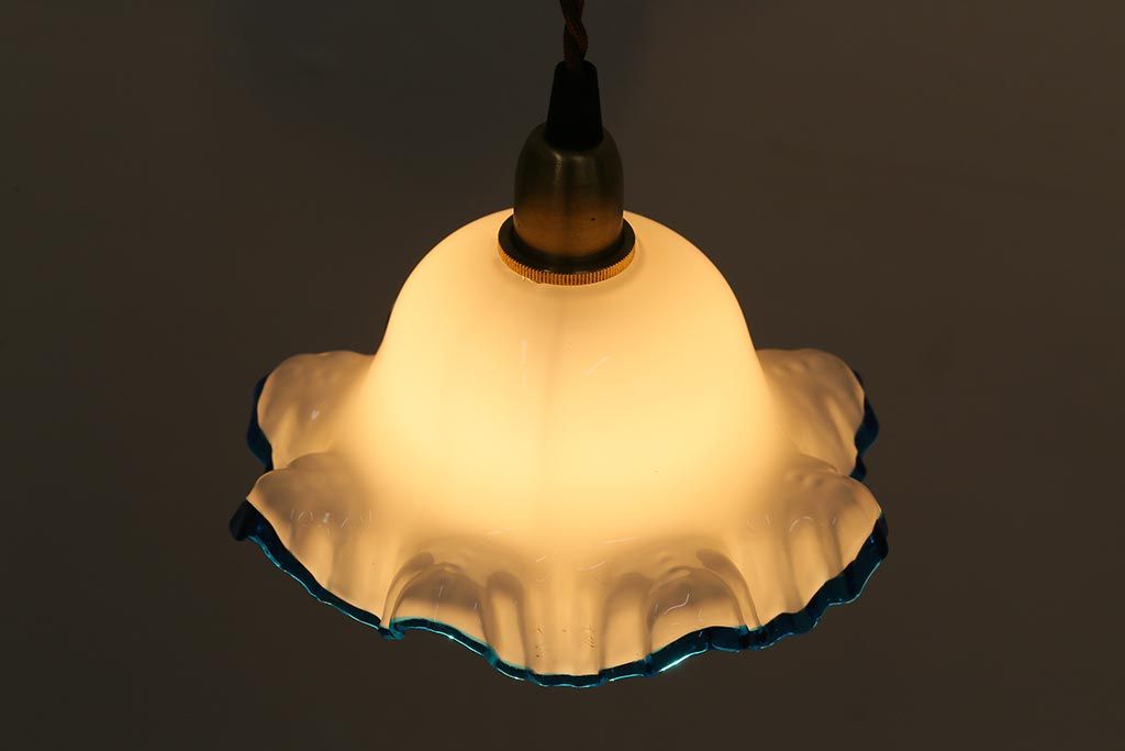 ヴィンテージ照明 イギリスビンテージ 青い縁のフリルが爽やかなミルクガラスペンダントライト(ランプシェード、天井照明)(R-043000)