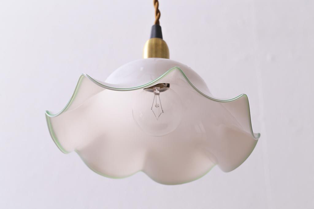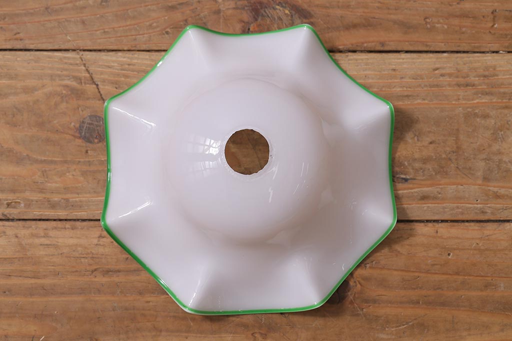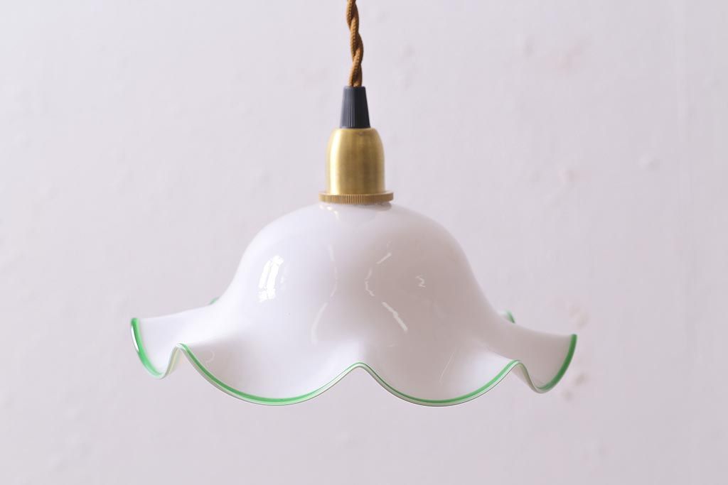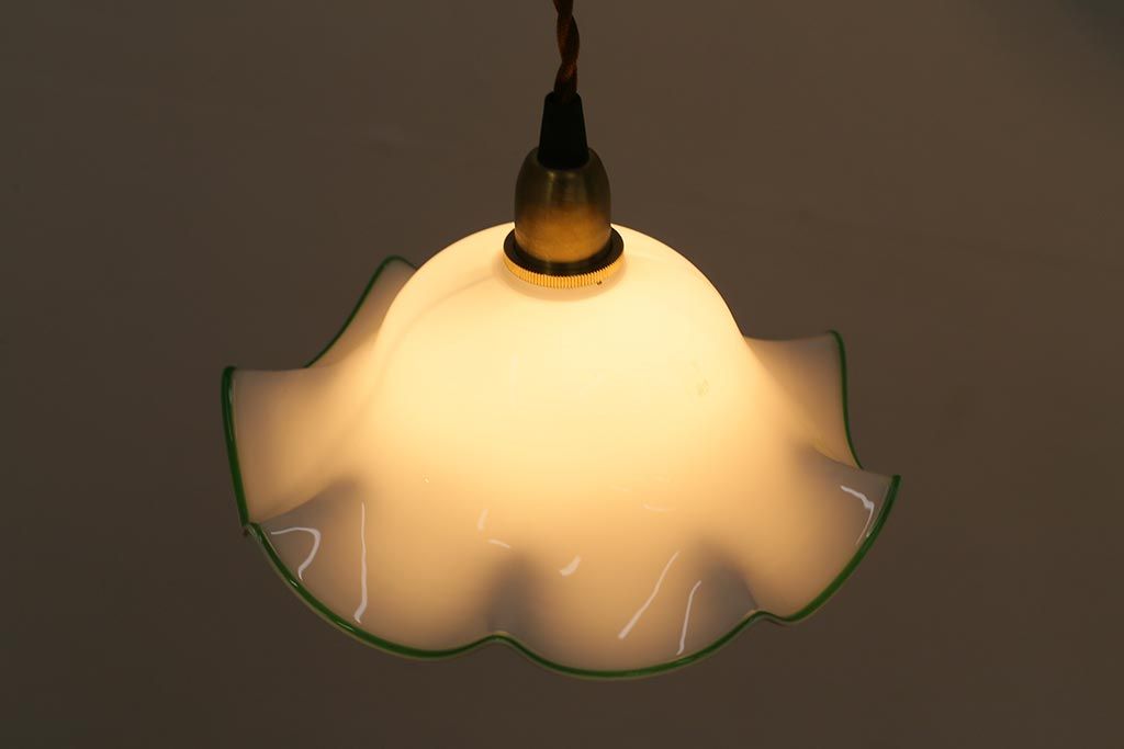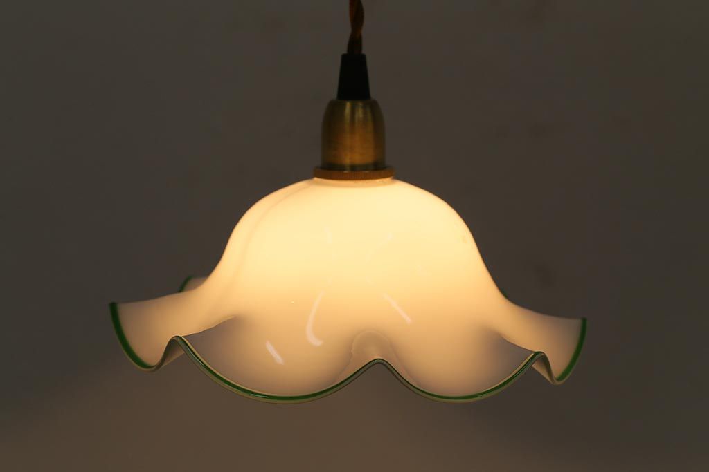 ヴィンテージ照明 イギリスビンテージ グリーン縁 ミルクガラス フリルシェードのペンダントライト(ランプシェード、天井照明)(R-042996)